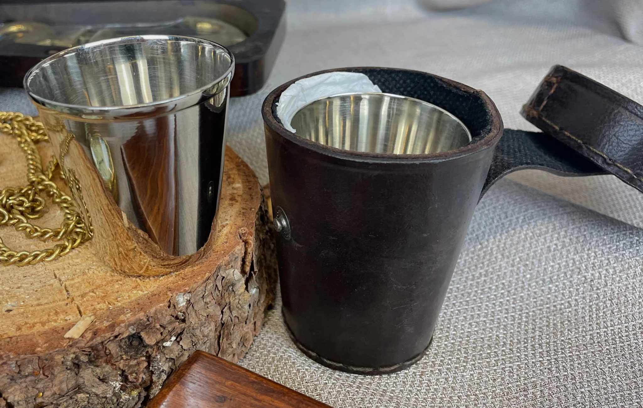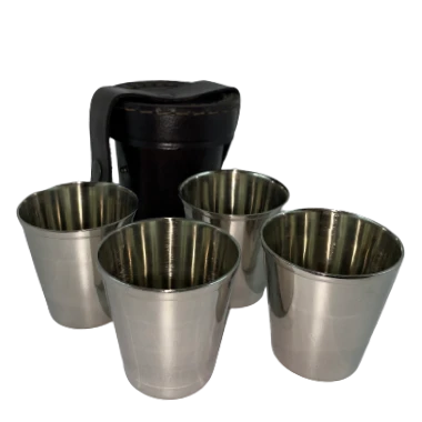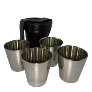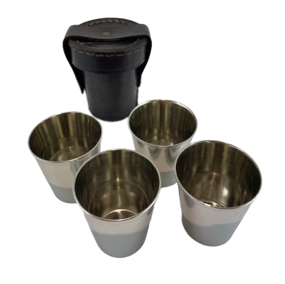 Zestaw 4 mosiężnych niklowanych kubków w skórzanym etiu. Super podróżny zestaw.