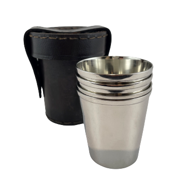 4 MOSIĘŻNE, NIKLOWANE KUBKI W ETUI SKÓRZANYM
