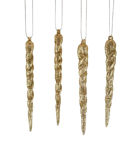 Komplet czterech zawieszek w kształcie sopli. Zawieszki ozdobione są złotym brokatem, który w piękny sposób odbije światło.