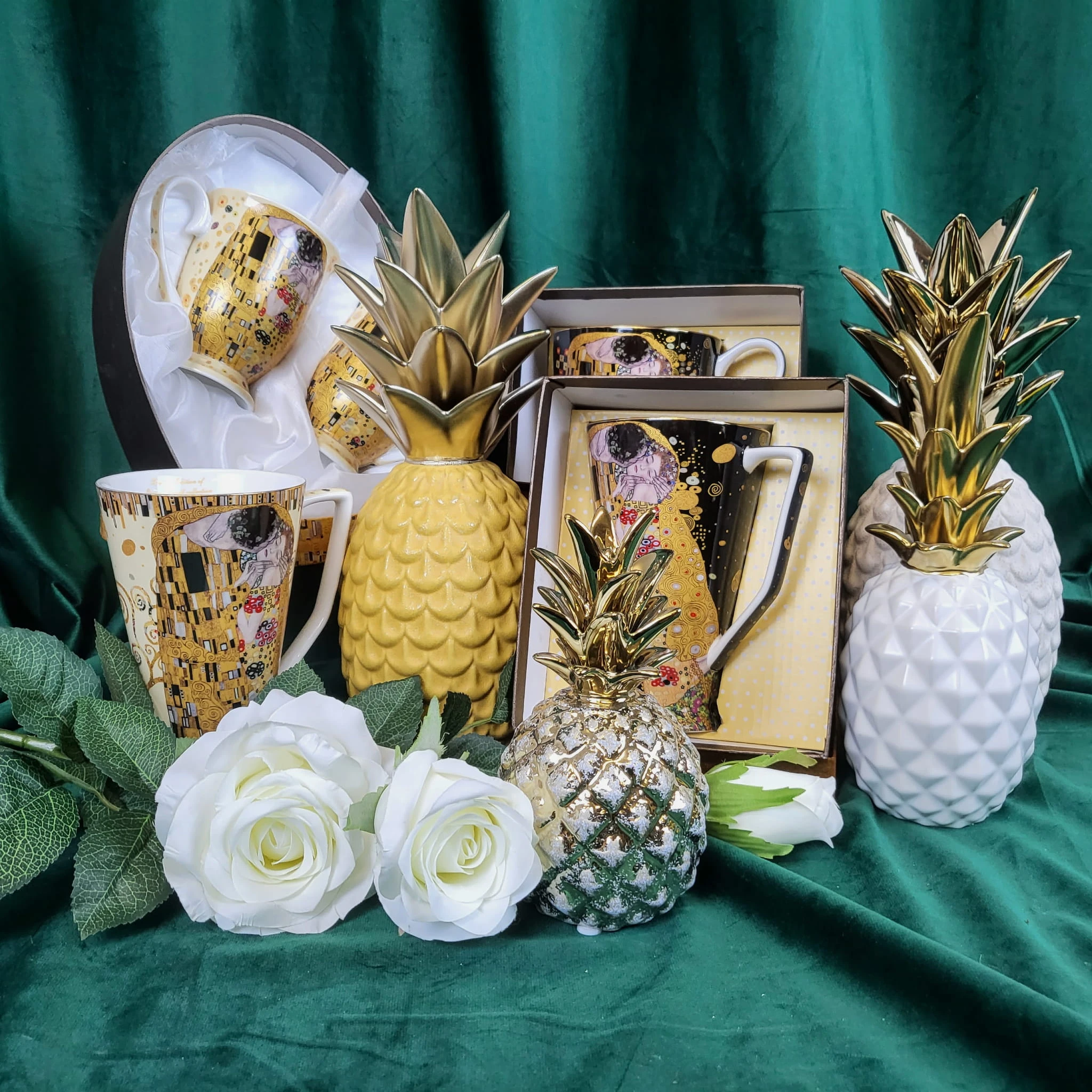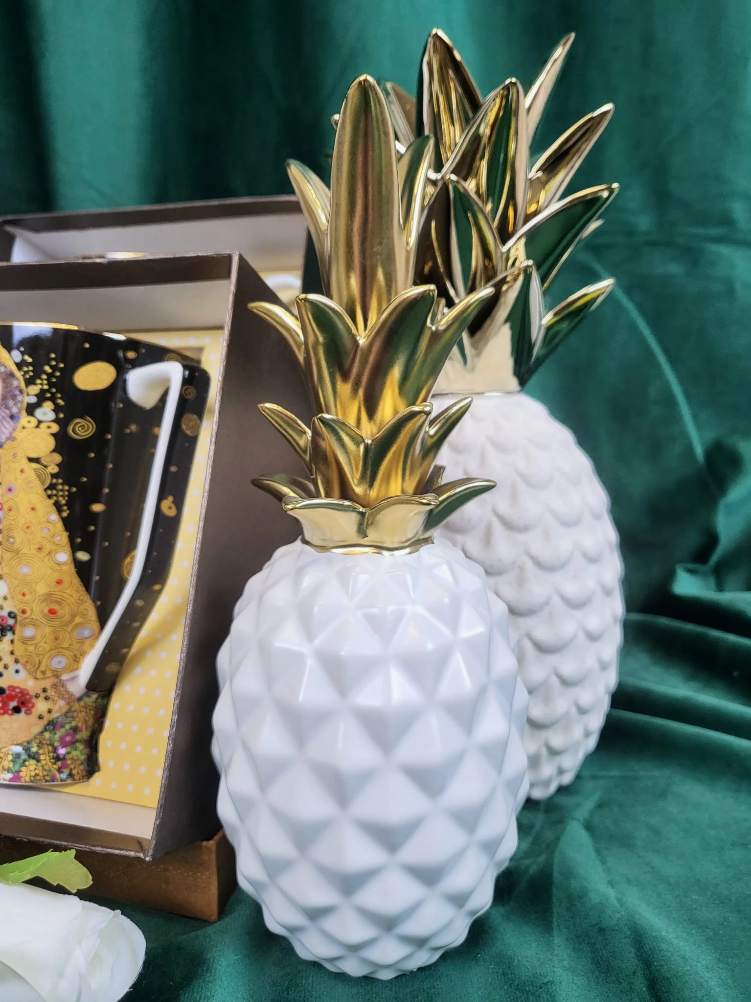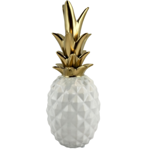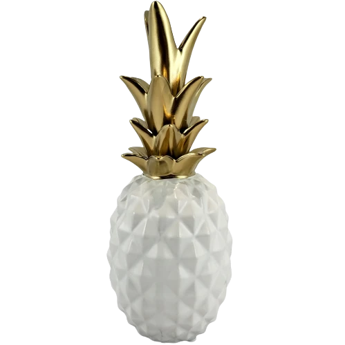 Figurka ananas w kolorze biało-złotym. Jeden z najmodniejszych dodatków w tym sezonie. Idealnie wkomponuje się we wnętrza boho, eklektyczne czy nawet te glamour.