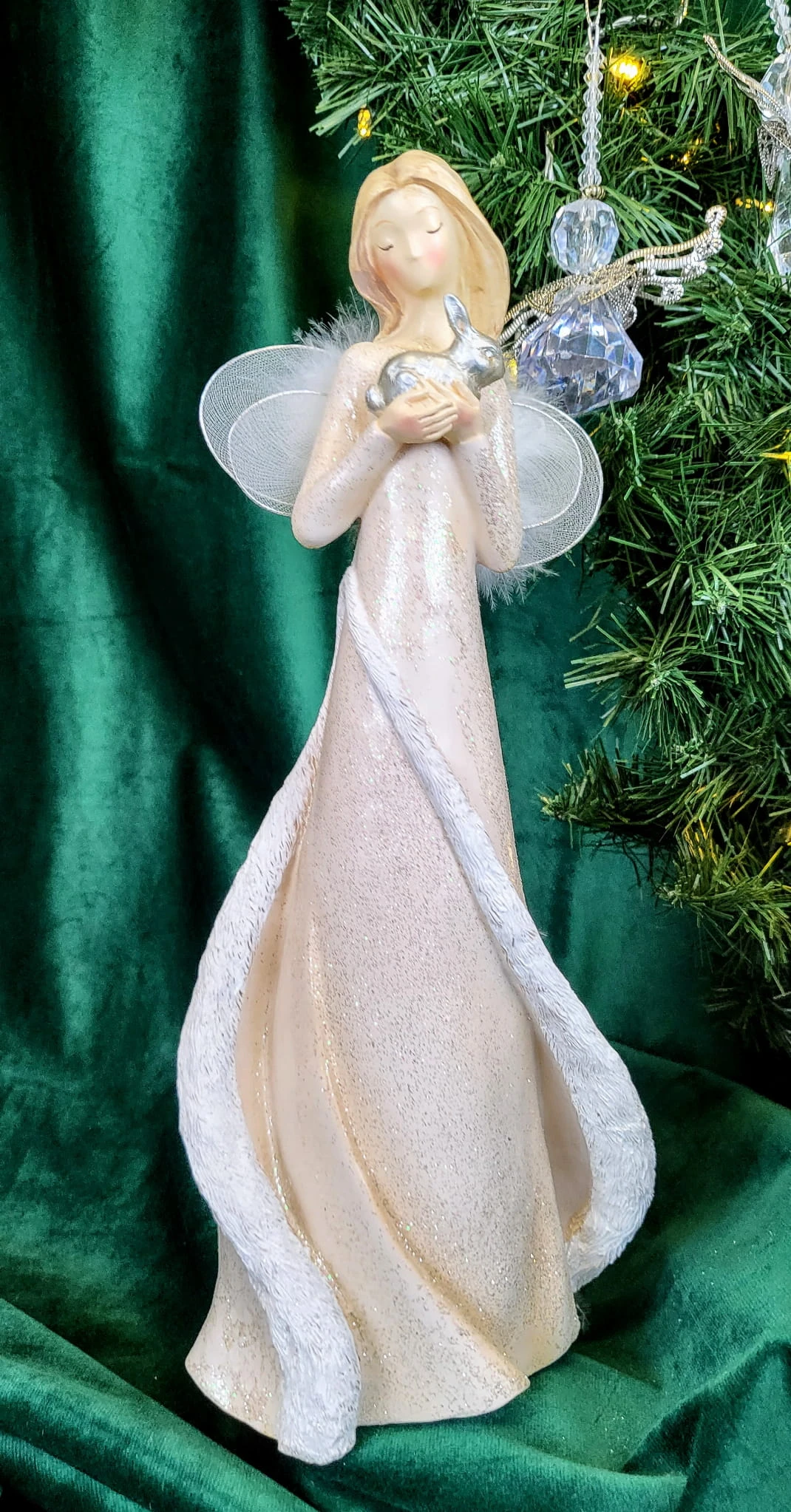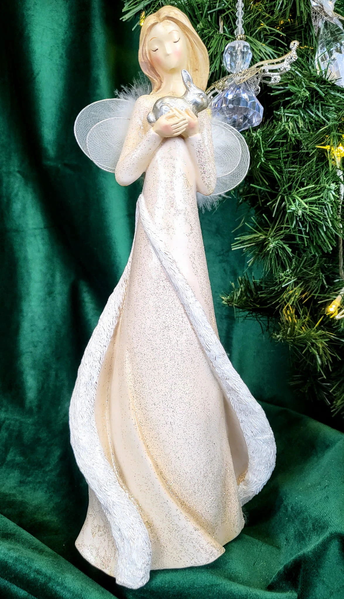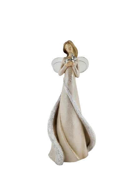 Piękna dekoracja, przedstawiająca anioła trzymającego króliczka. Idealnie nadaje się na dekorację wnętrza lub prezent.