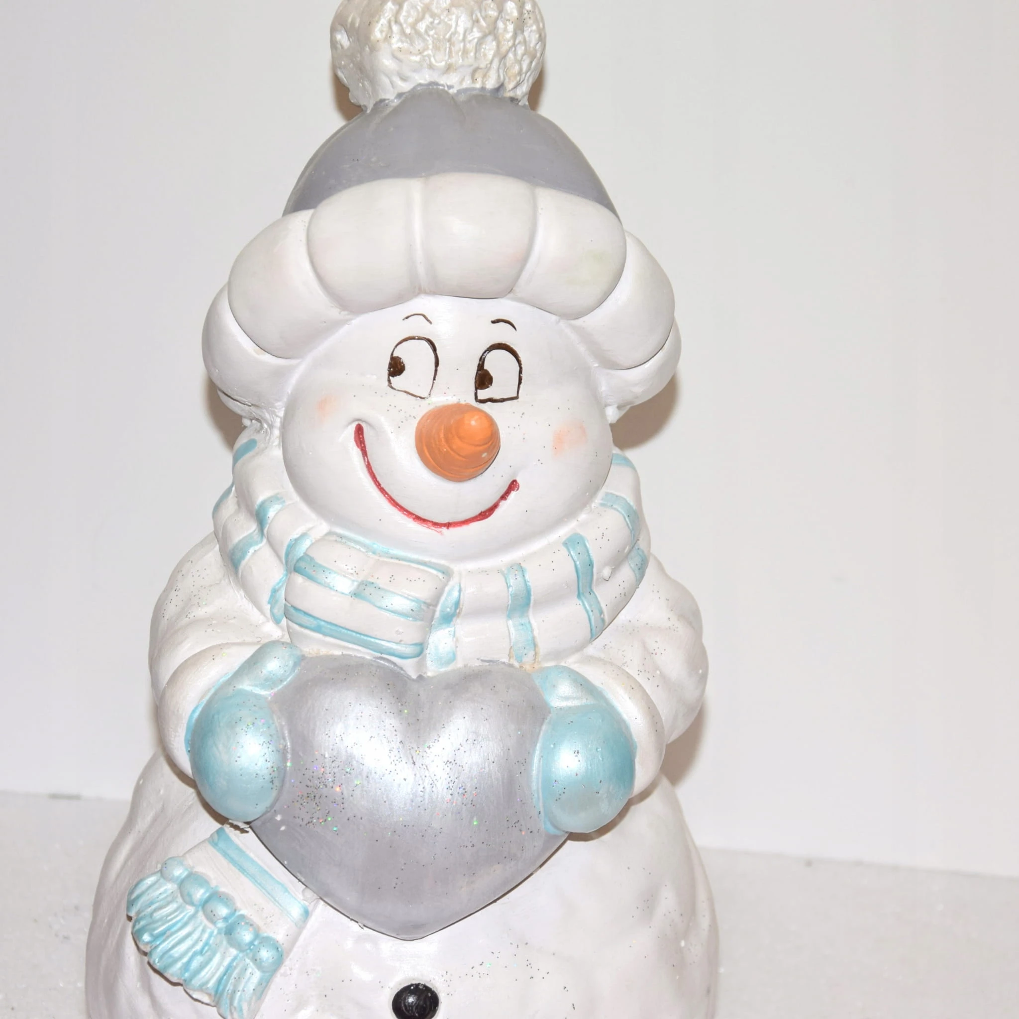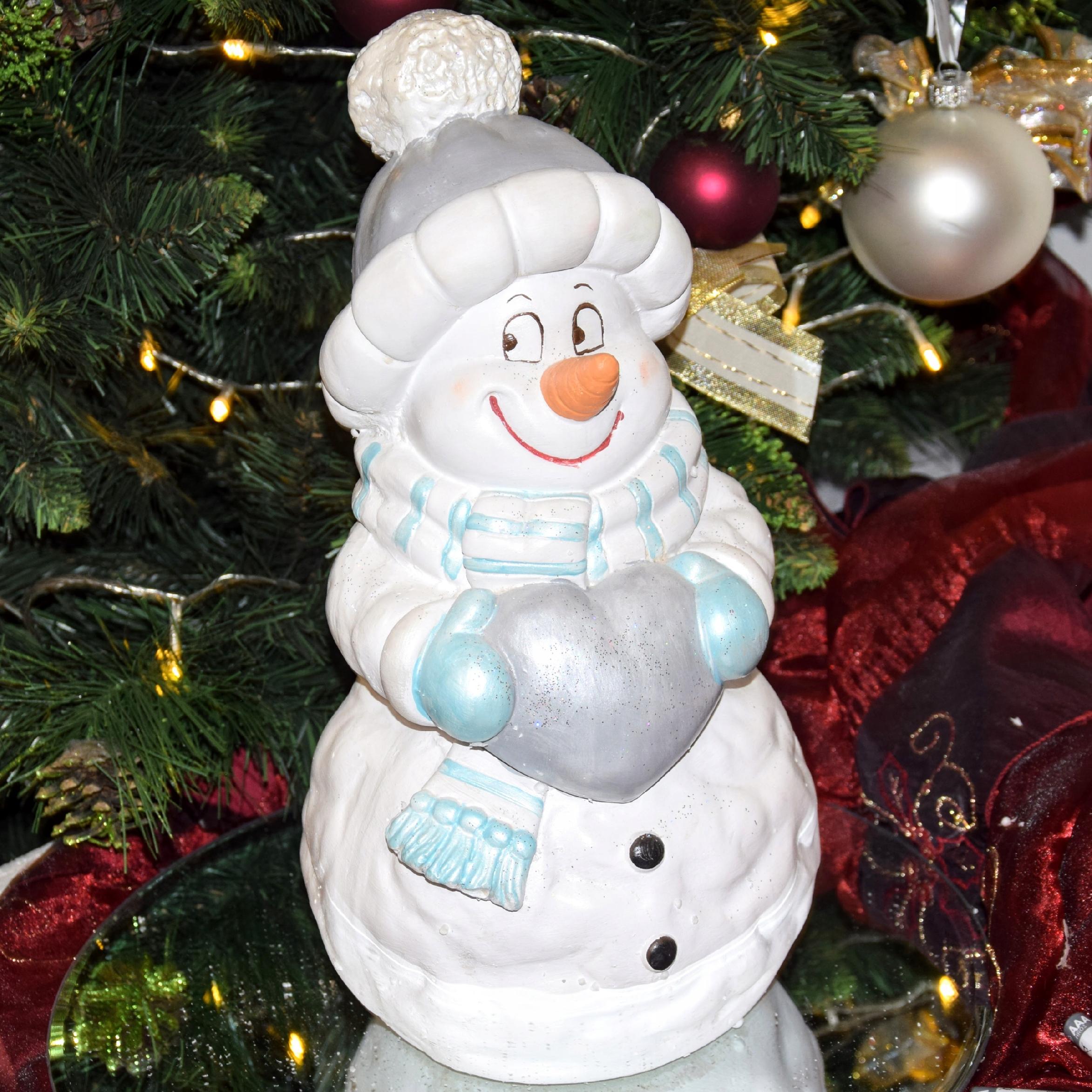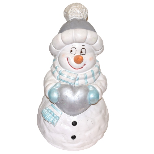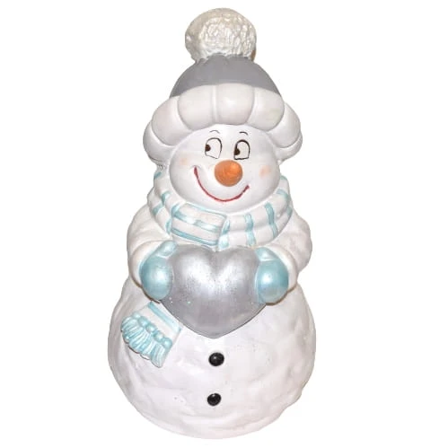 Uśmiechnięty bałwan w szarej czapce z niebieskim szalikiem i rękawicami, trzymający srebrne serce. Niesie je prawdopodobnie dla Ciebie :D. Świąteczna dekoracja, wkomponuje się w każde wnętrze.