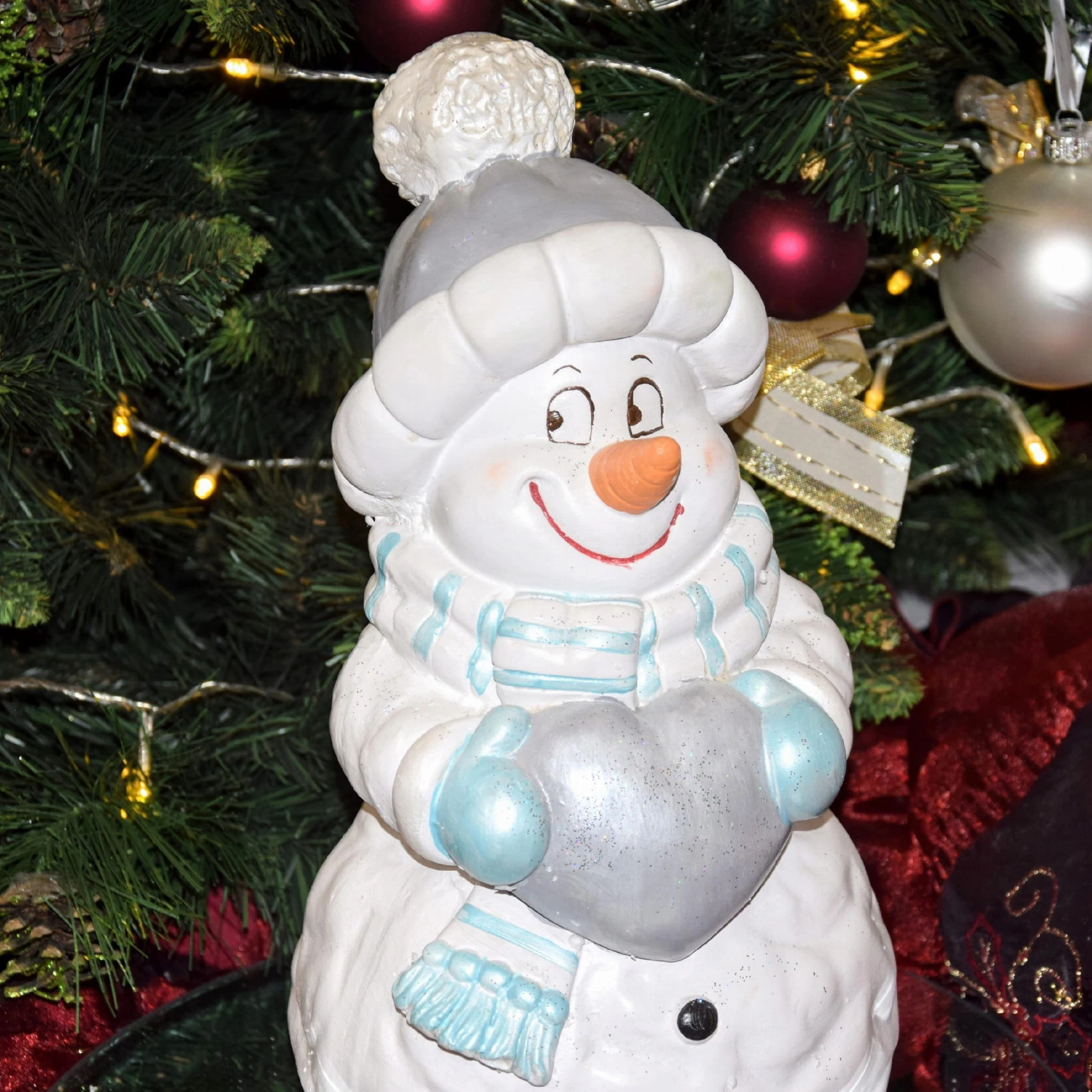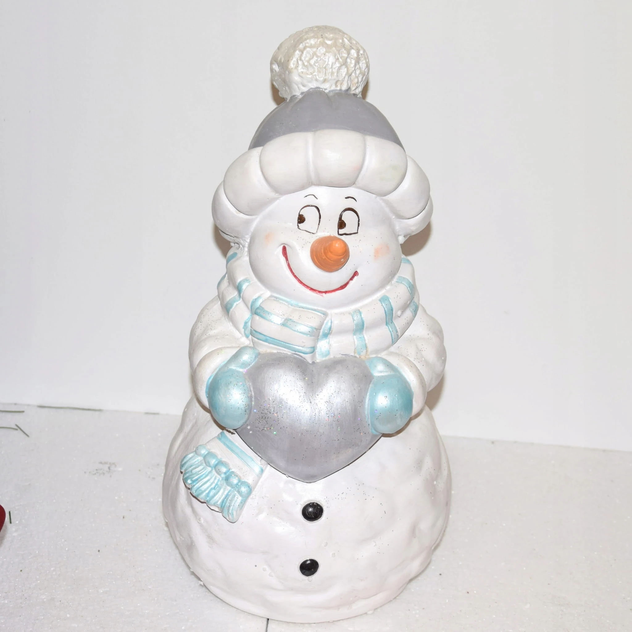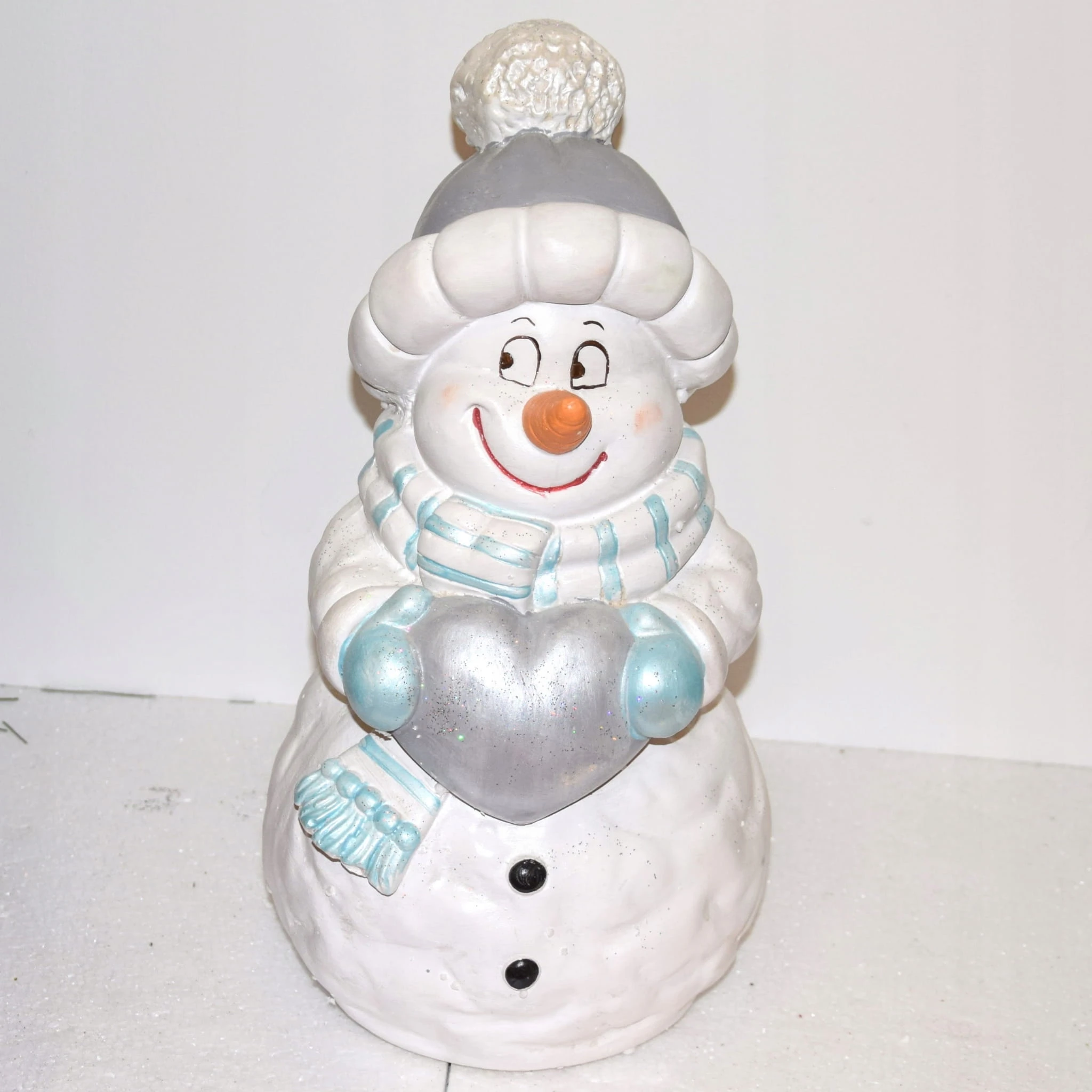 Uśmiechnięty bałwan w szarej czapce z niebieskim szalikiem i rękawicami, trzymający srebrne serce. Niesie je prawdopodobnie dla Ciebie :D. Świąteczna dekoracja, wkomponuje się w każde wnętrze.