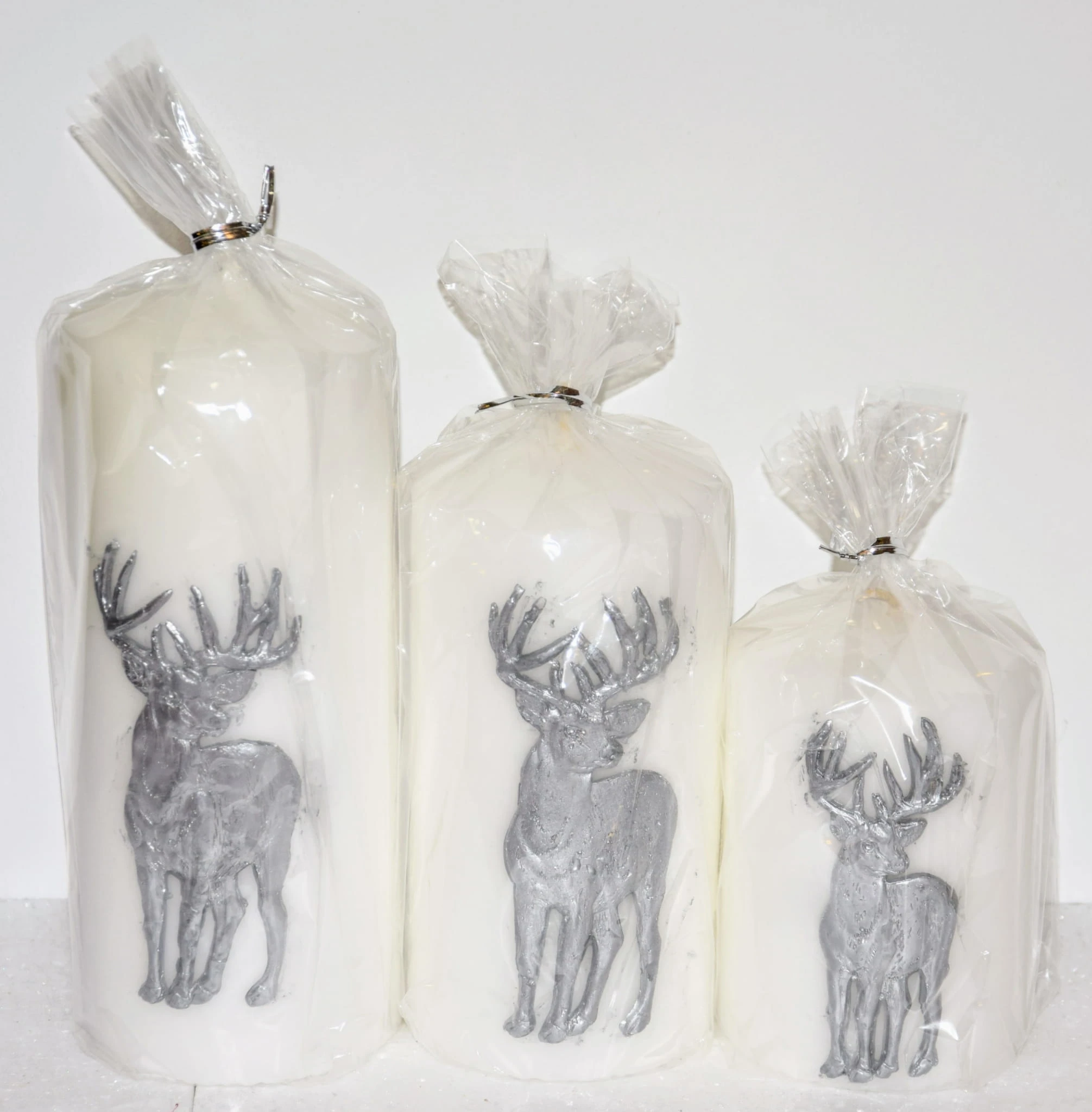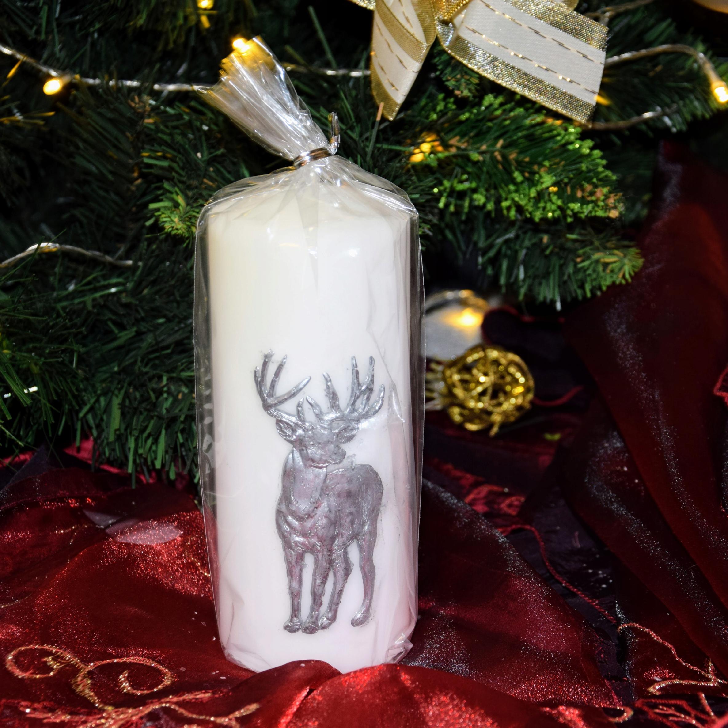Ozdobna świeczka w kolorze białym ozdobiona reniferem w kolorze srebrnym. Ożywi każdą półkę czy komodę, a w okresie bożonarodzeniowym stanowić będzie bardzo elegancką ozdobę stołu i/lub stroików.