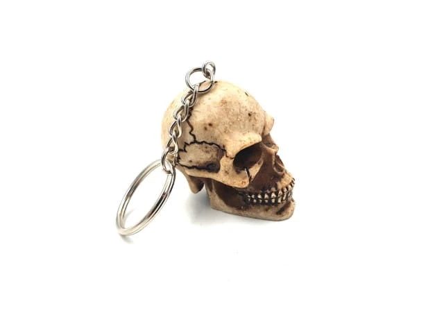 Brelok czaszka wykonany jest z polyresinu. Łańcuszek i kółko do mocowania metalowe.