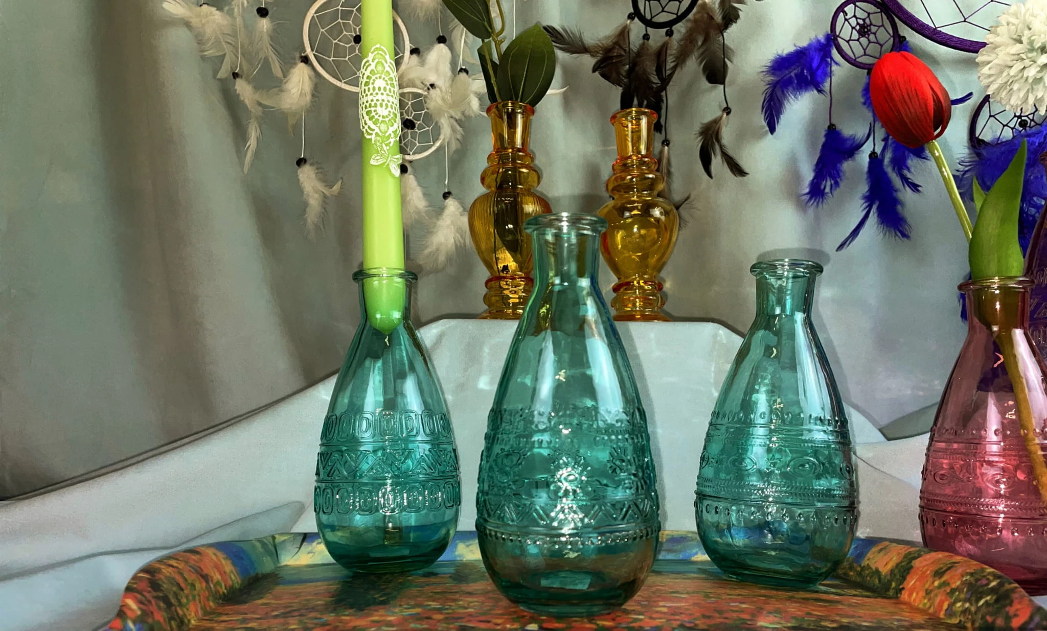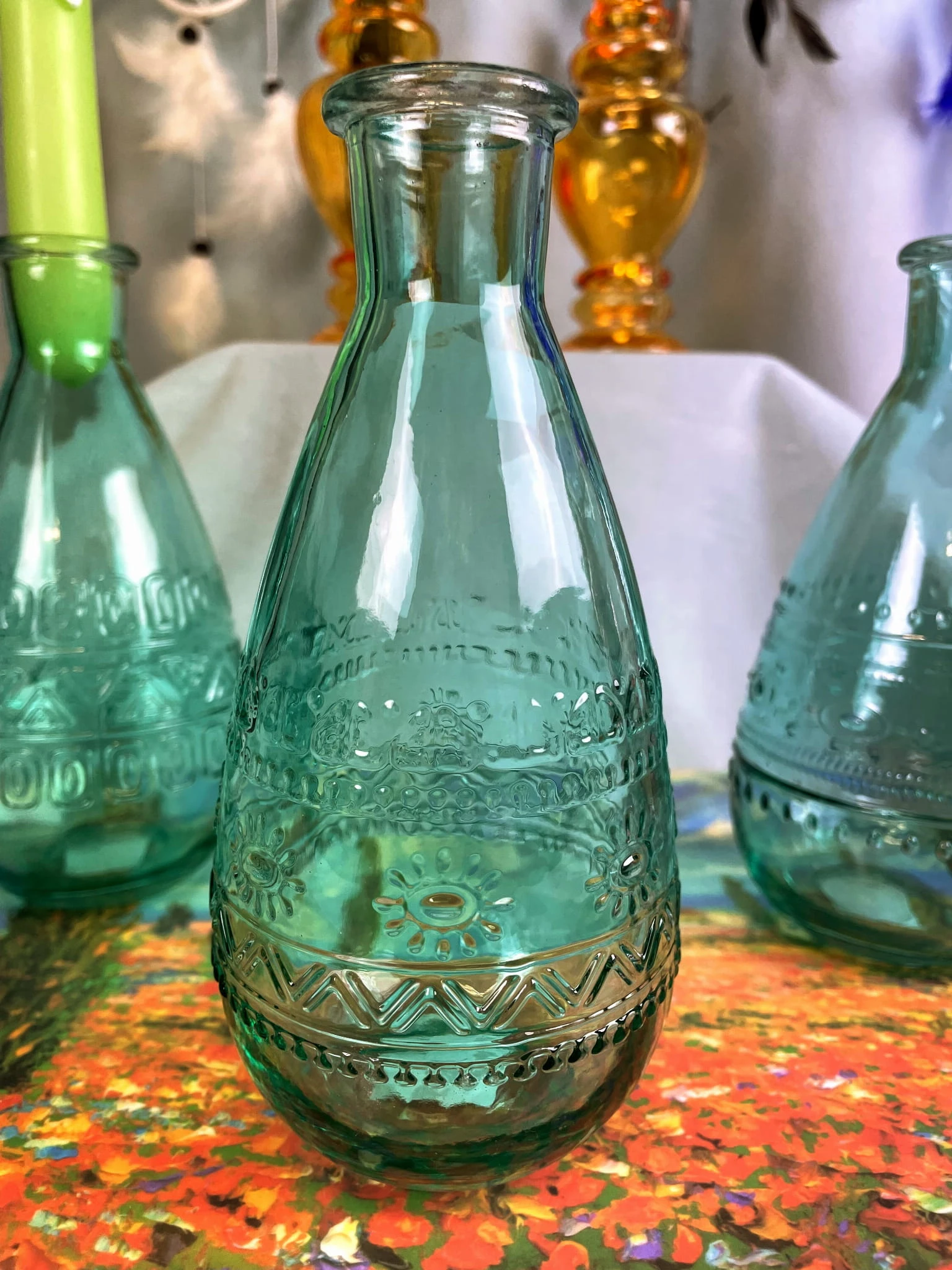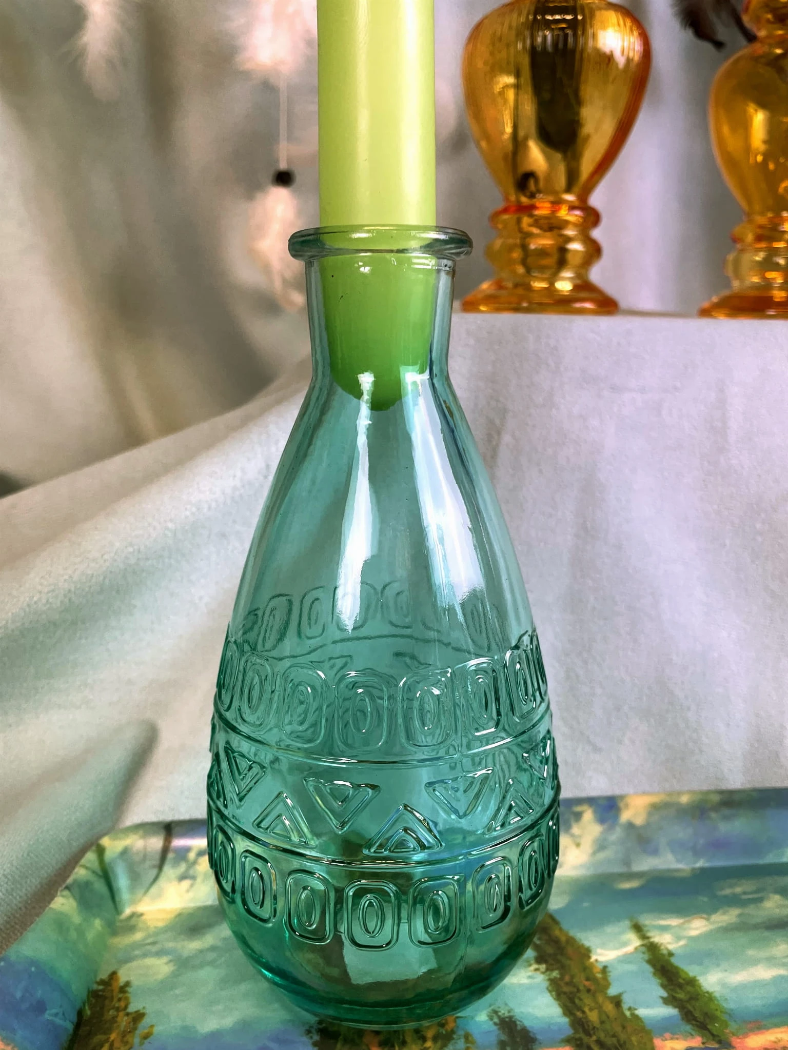 Prosty wazon - świecznik w kształcie butelki - pięknie się komponuje z kwiatami oraz świecami.