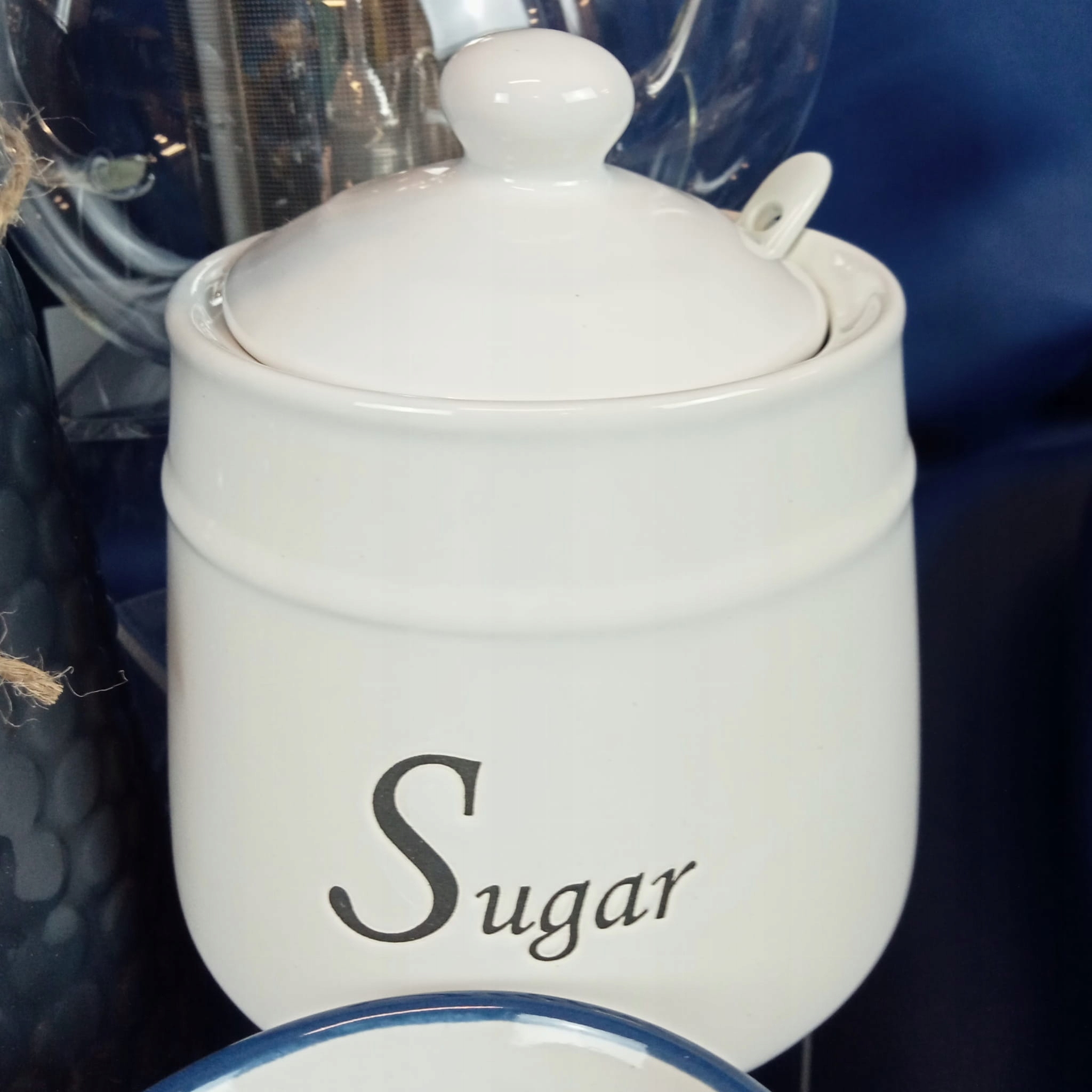 Piękna ceramika, pojemnik posiada napis "sugar" (cukier).