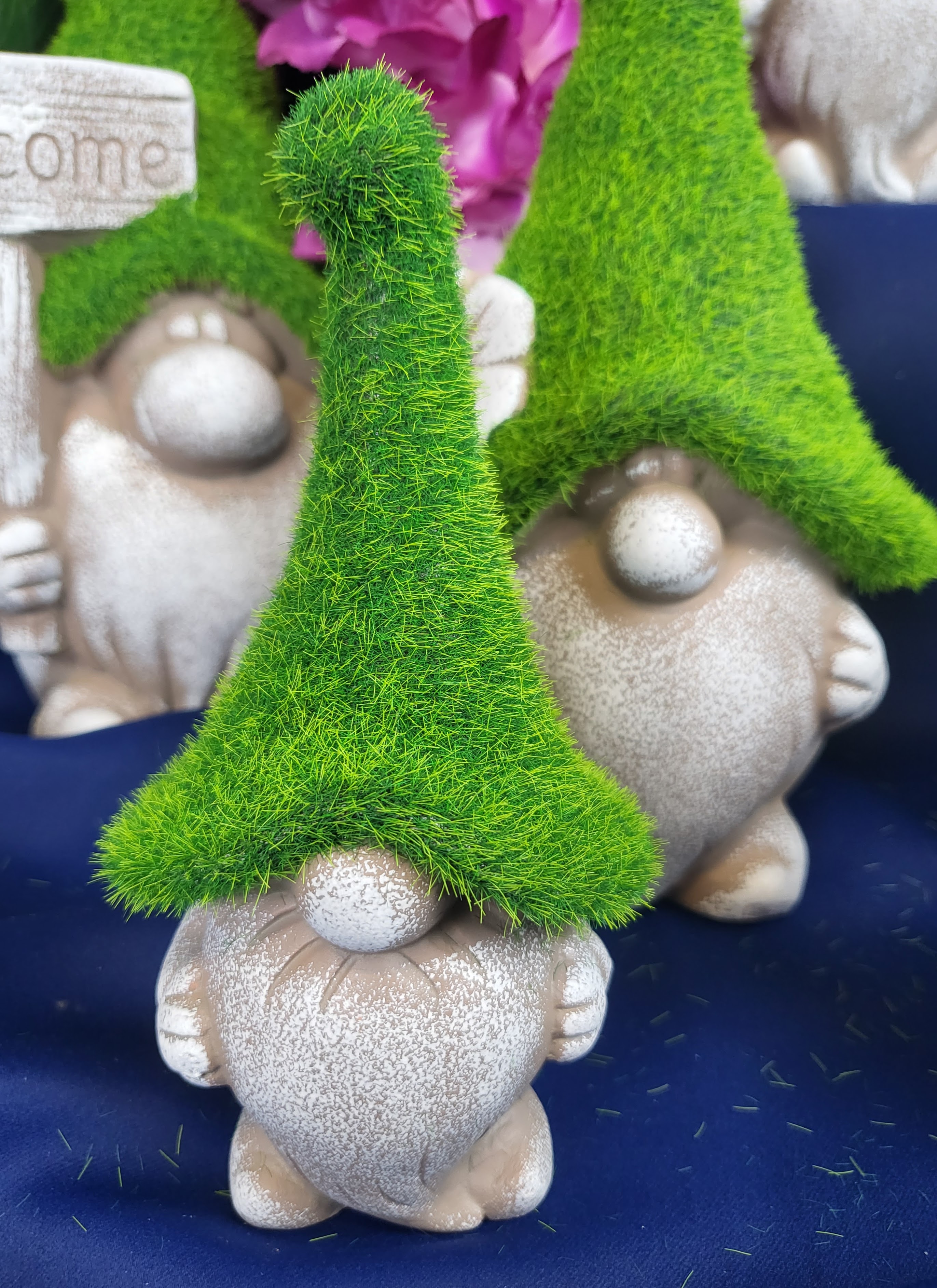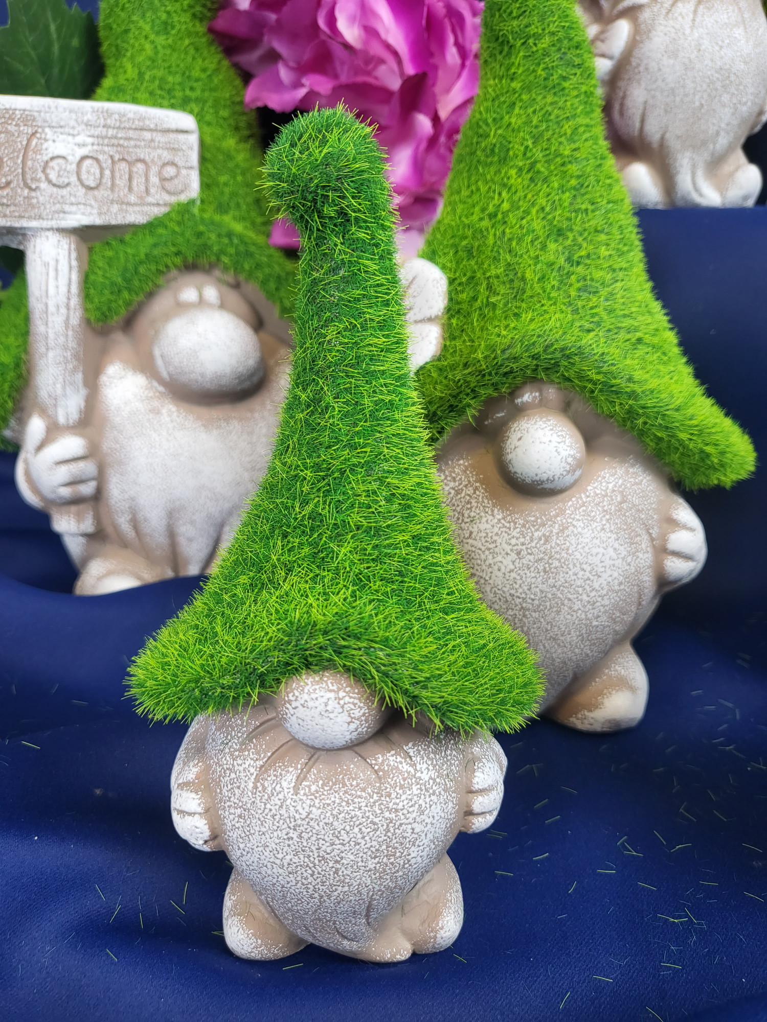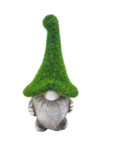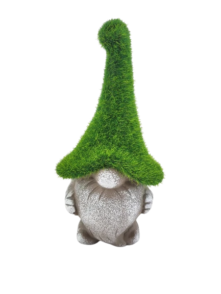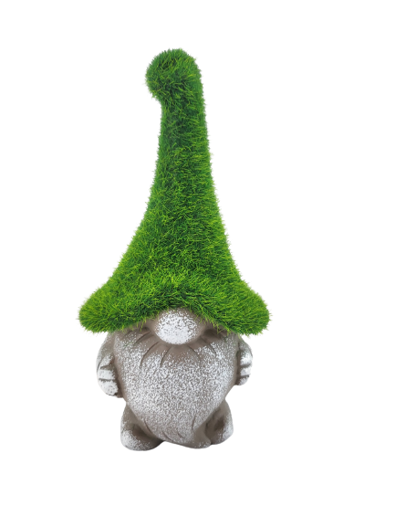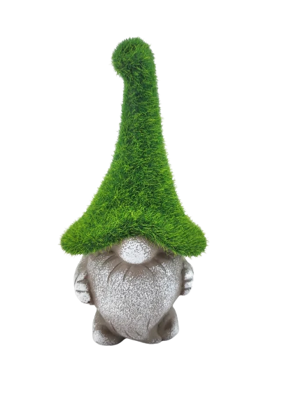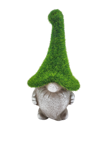 Ceramiczna figurka krasnala w zielonej czapce przypominającej mech z pewnością doda klimatu w ogrodzie.