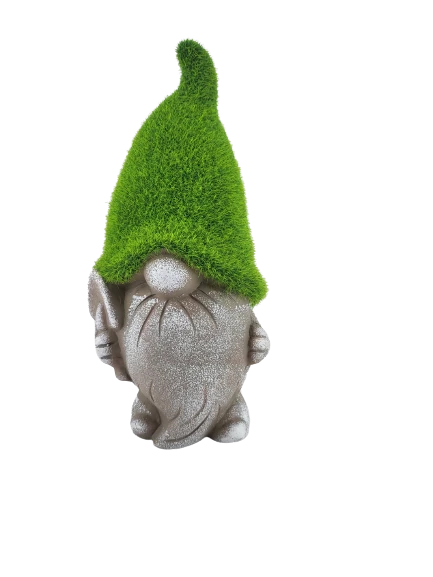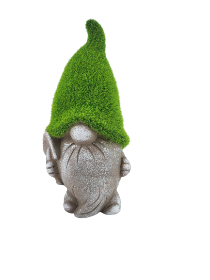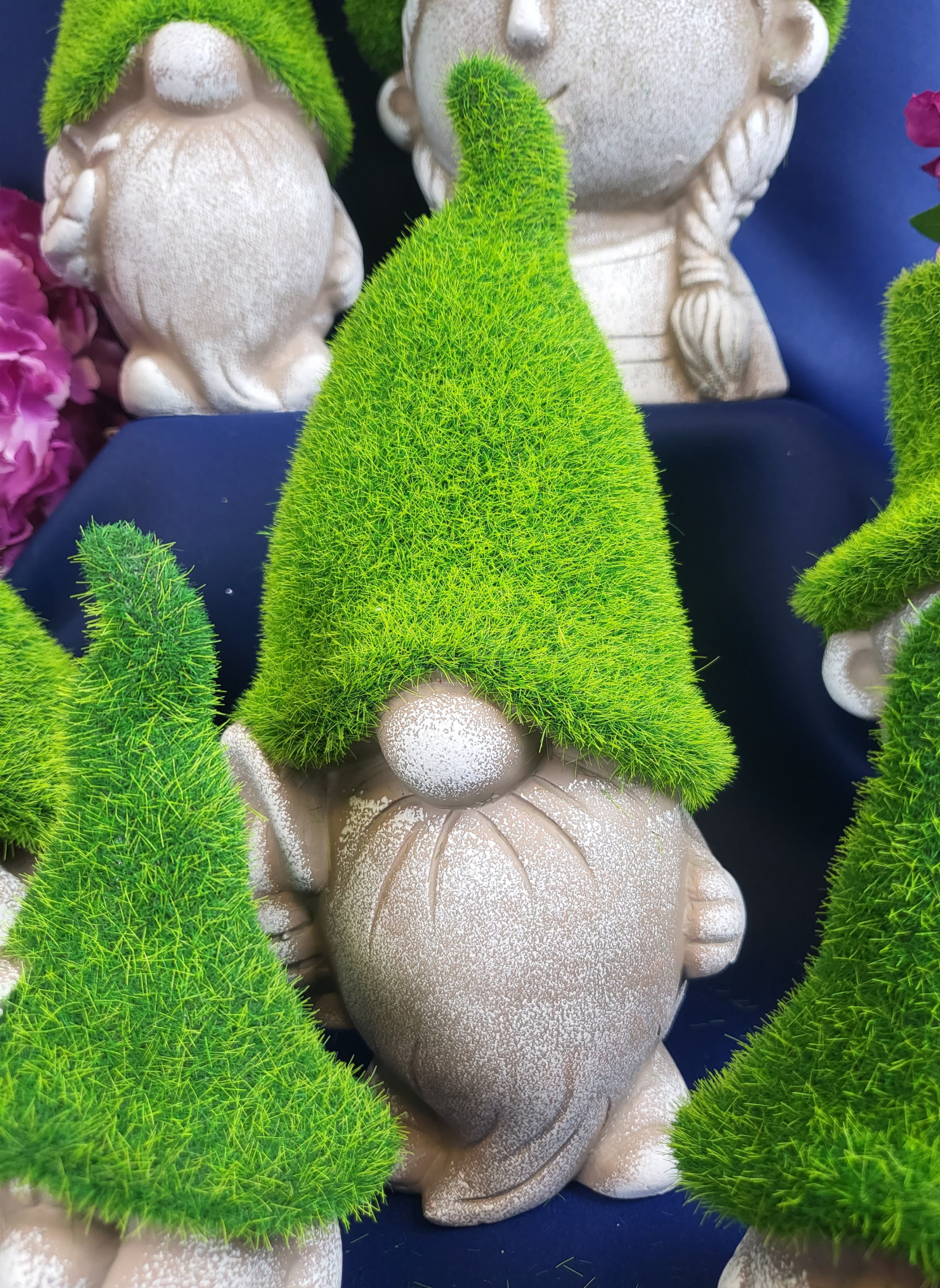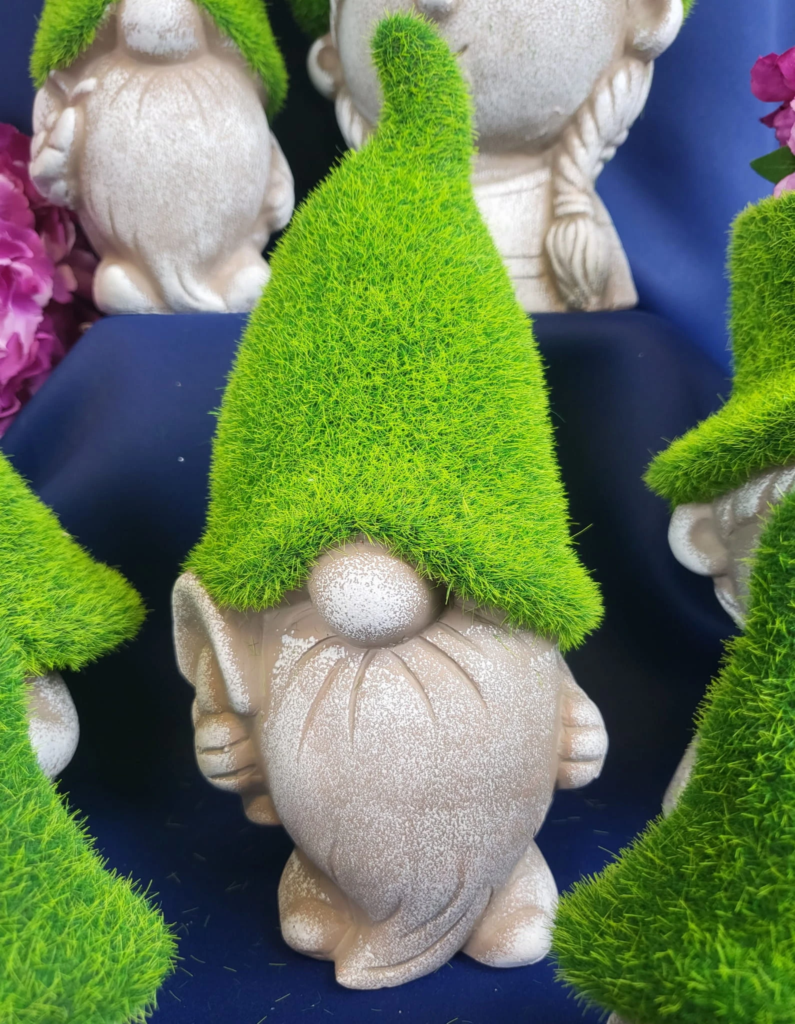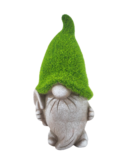 Ceramiczna figurka krasnala w zielonej czapce przypominającej mech z pewnością doda klimatu w ogrodzie.