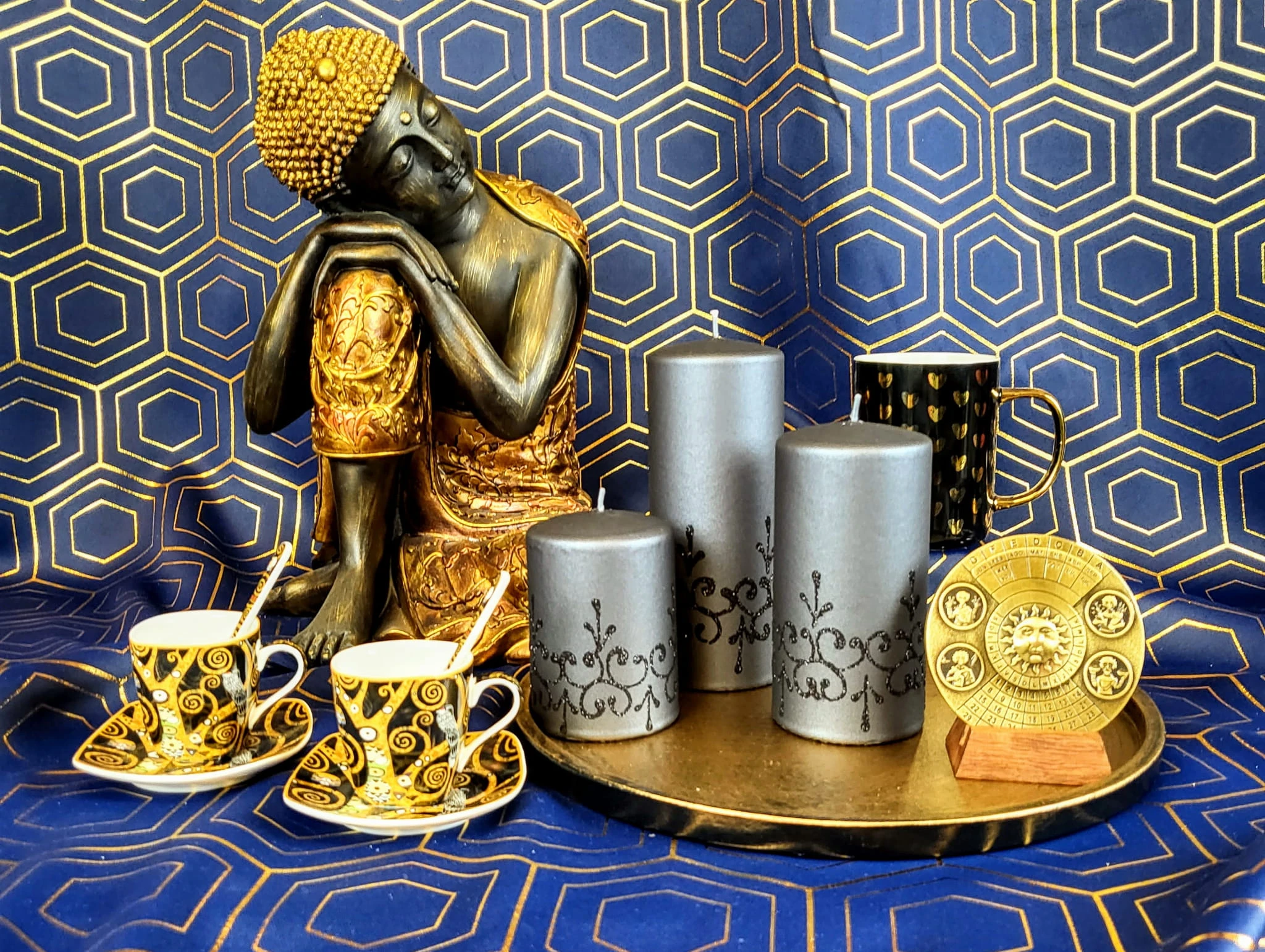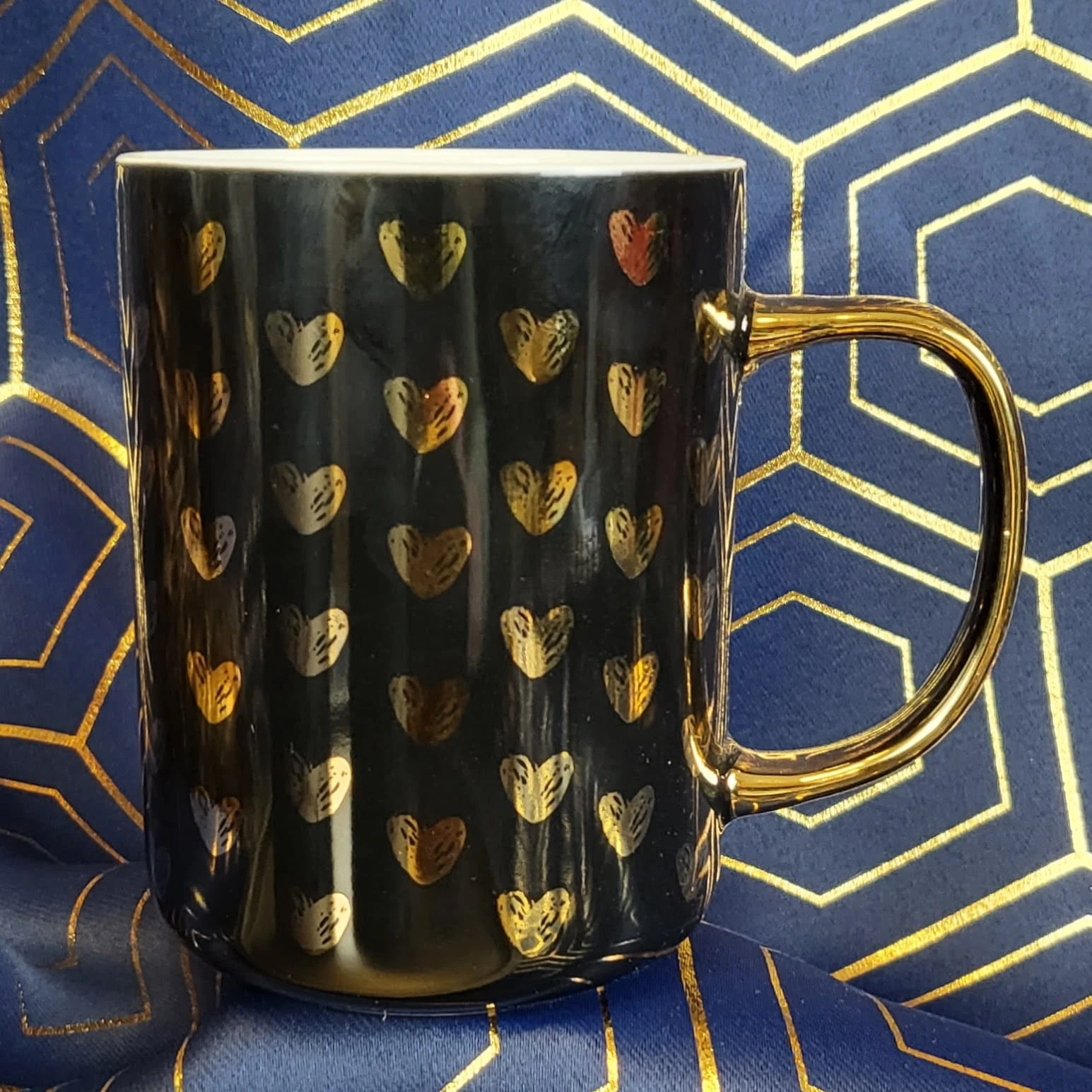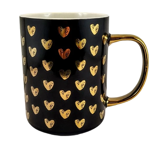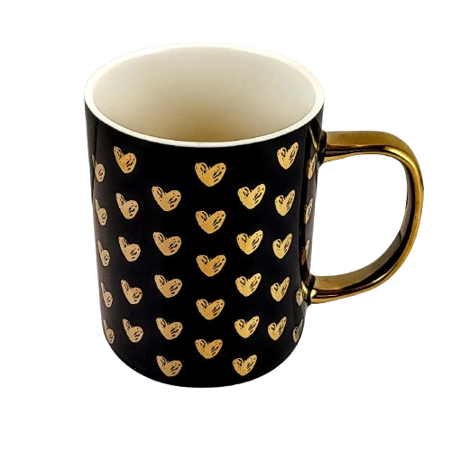 Ceramiczny czarny kubek ze złotymi serduszkami. Będzie idealny na napoje w jesienne dni i nie tylko. Polecamy na prezent lub dodatek do prezentu na każdą okazję.