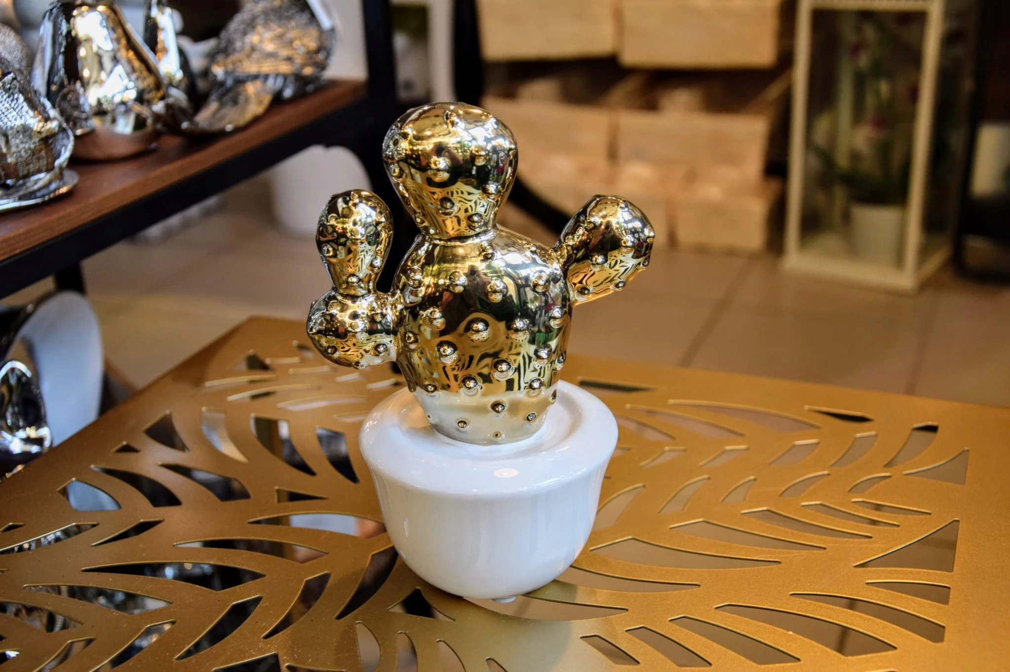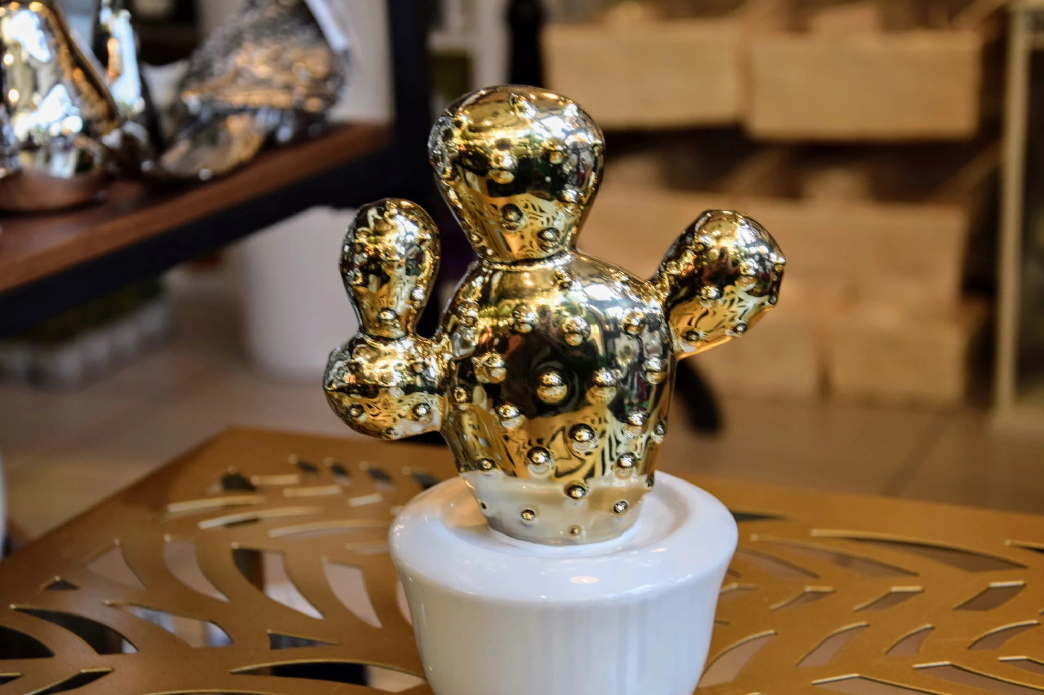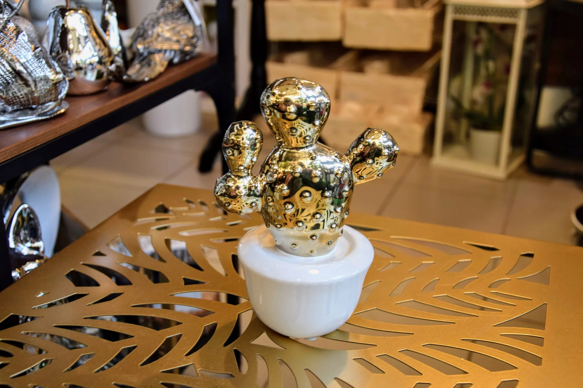 - Piękny dekoracyjny kaktus w kolorze złotym w białej donicy