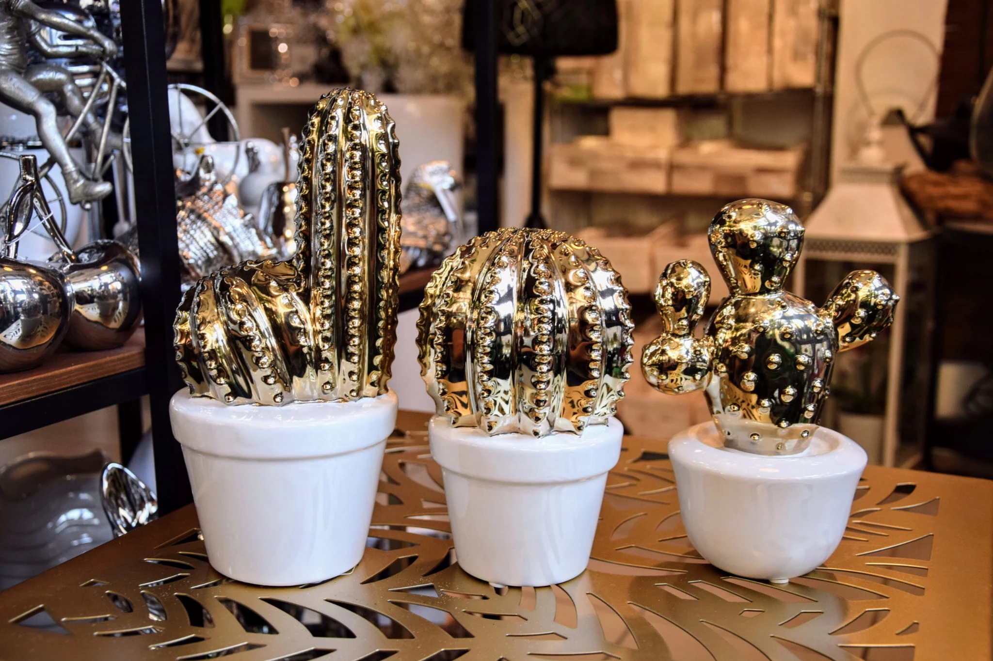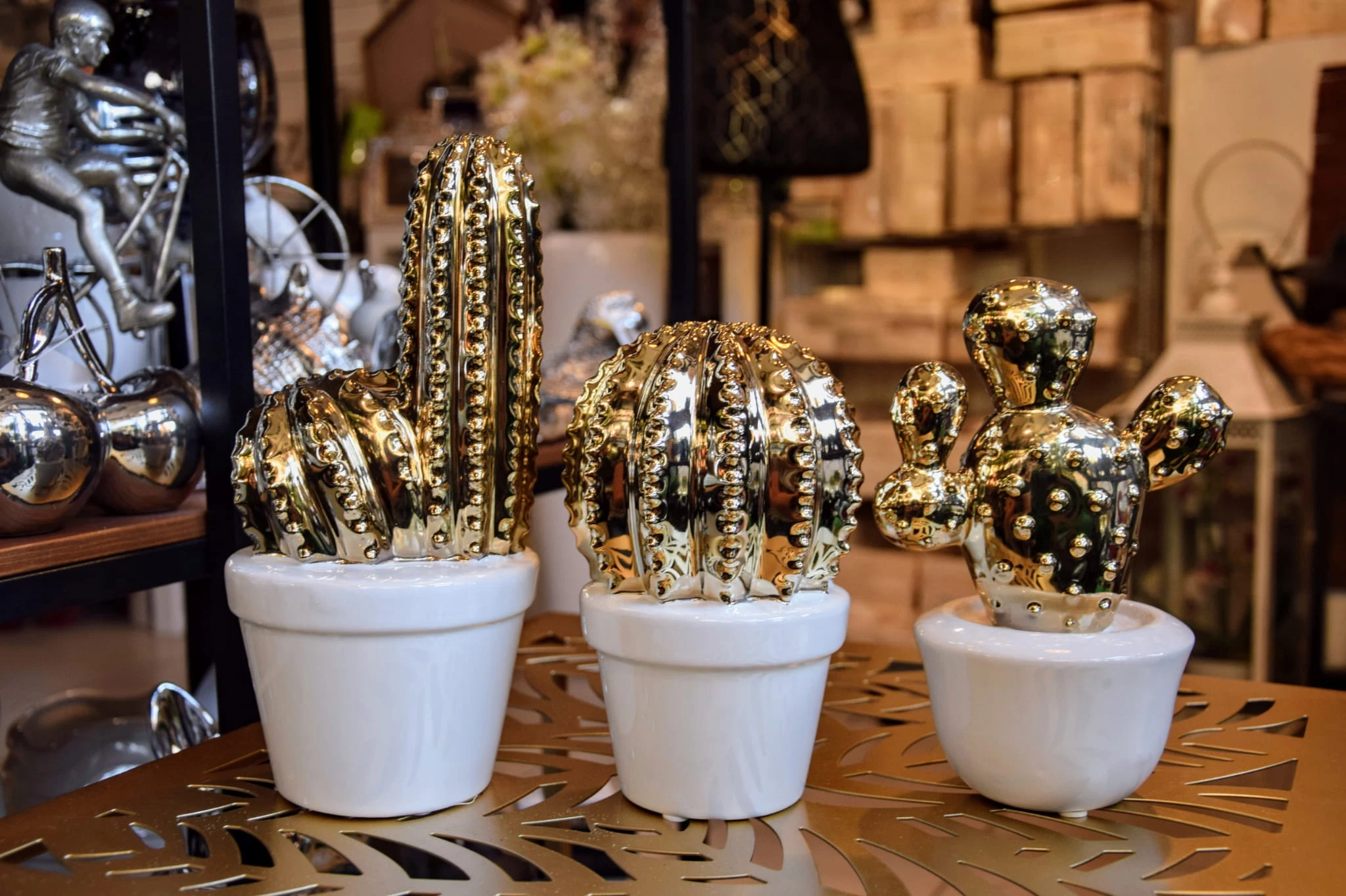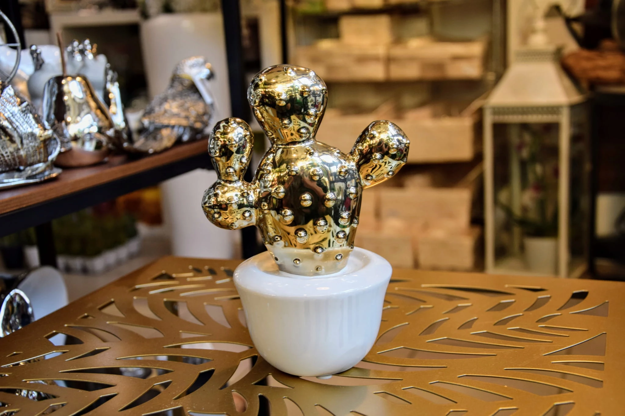- Piękny dekoracyjny kaktus w kolorze złotym w białej donicy