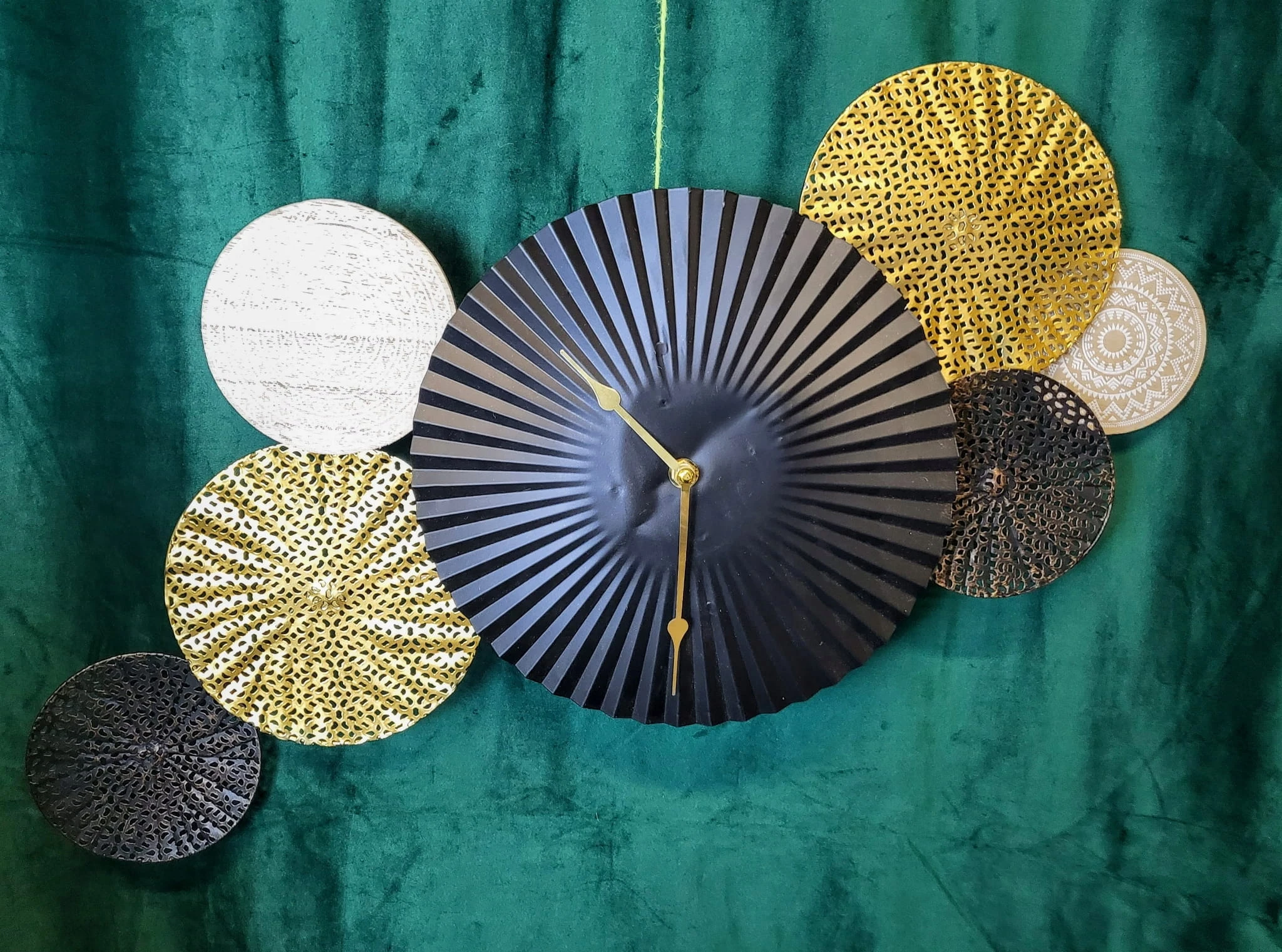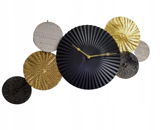 Dekoracja ścienna z zegarem z metalu w kolorach czerni, złota i beżu.
