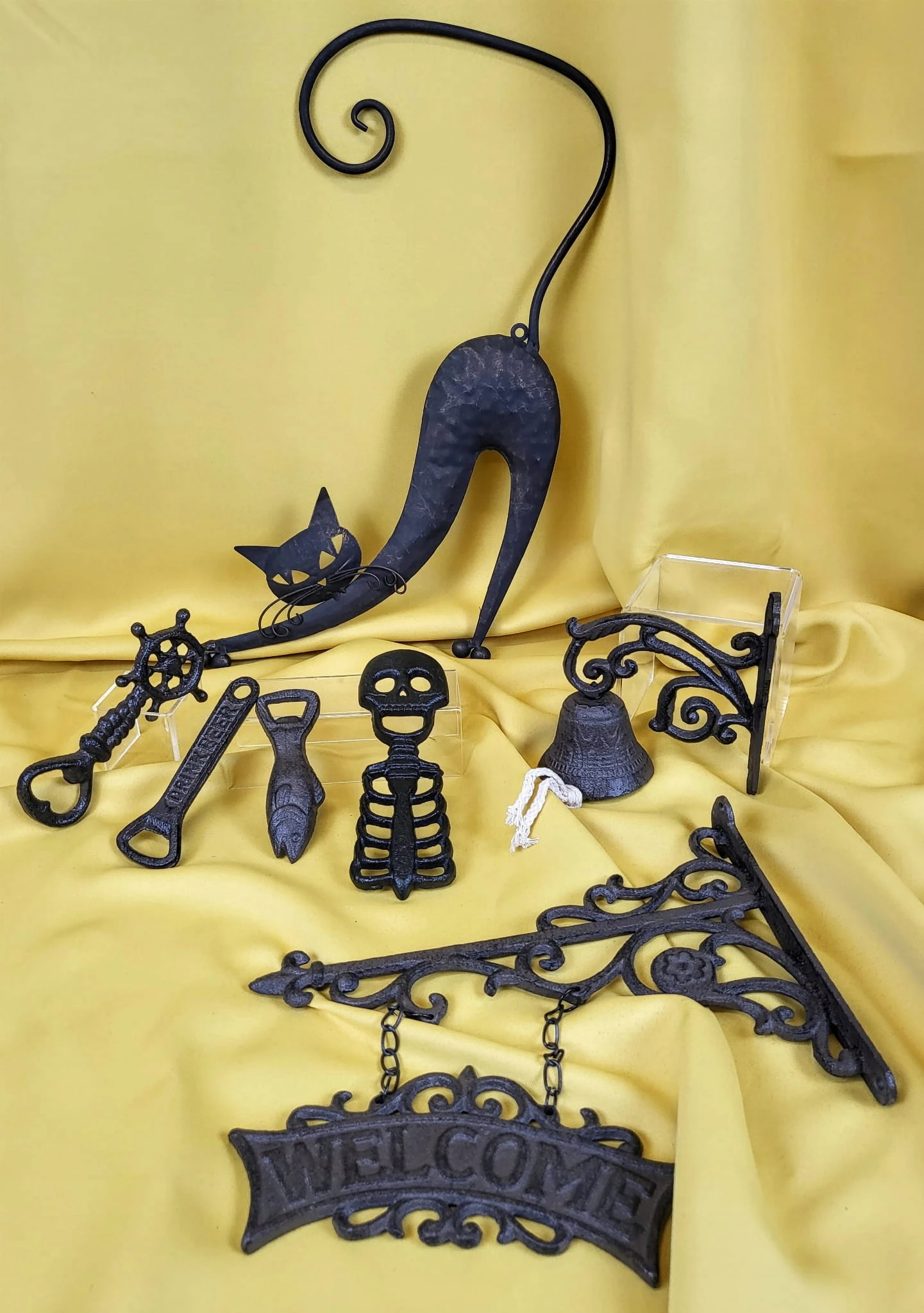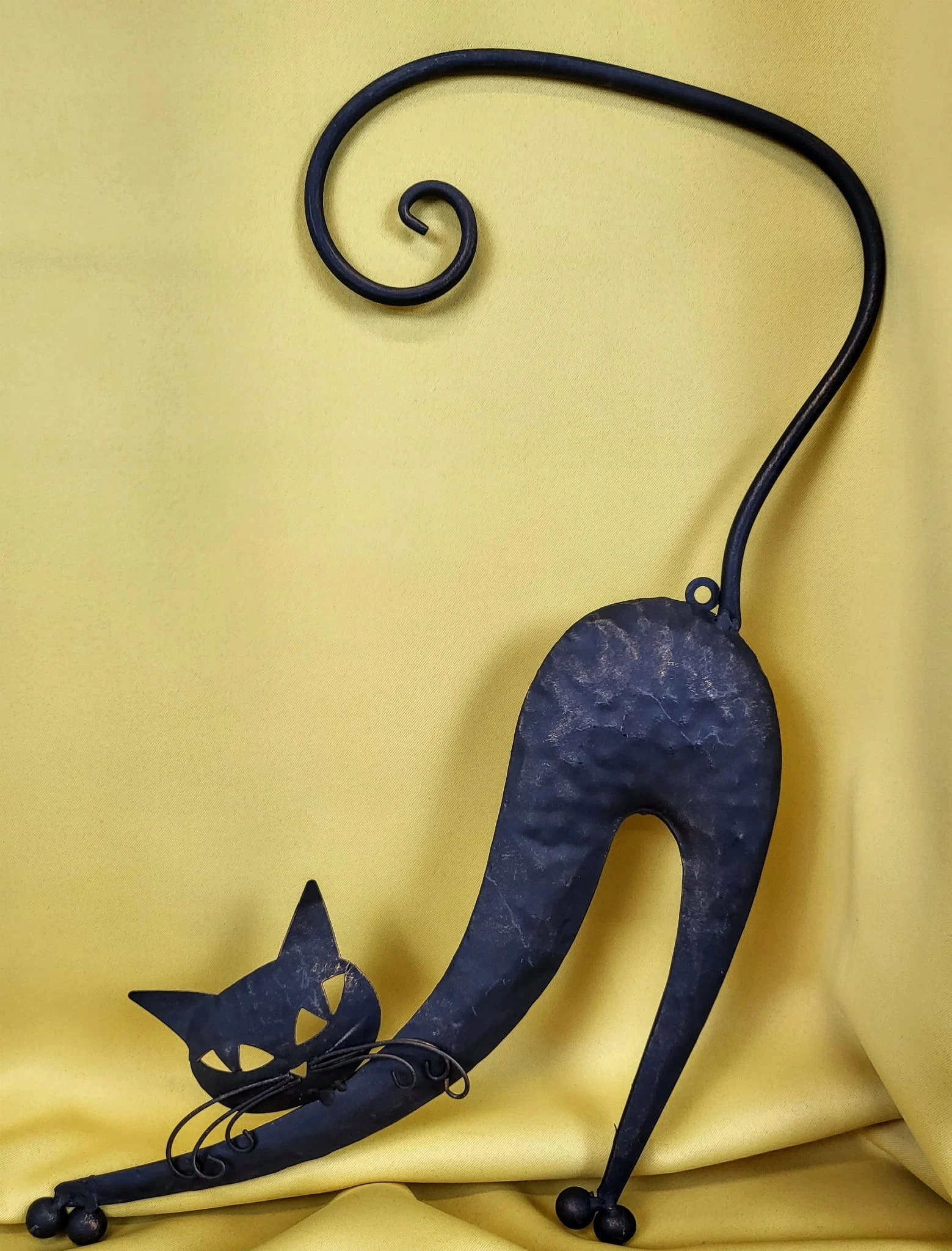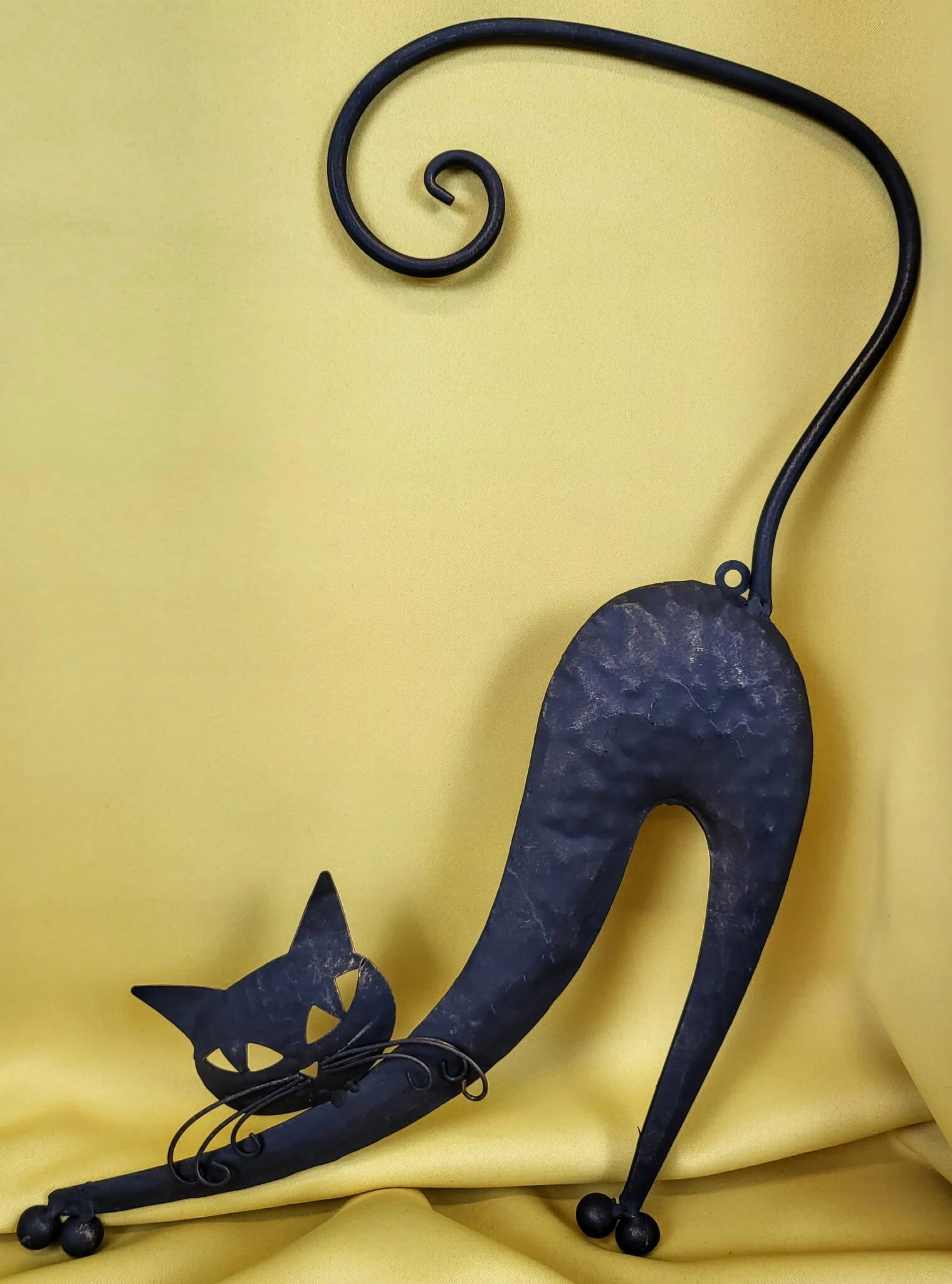 Metalowa dekoracja ścienna w kształcie kota.
