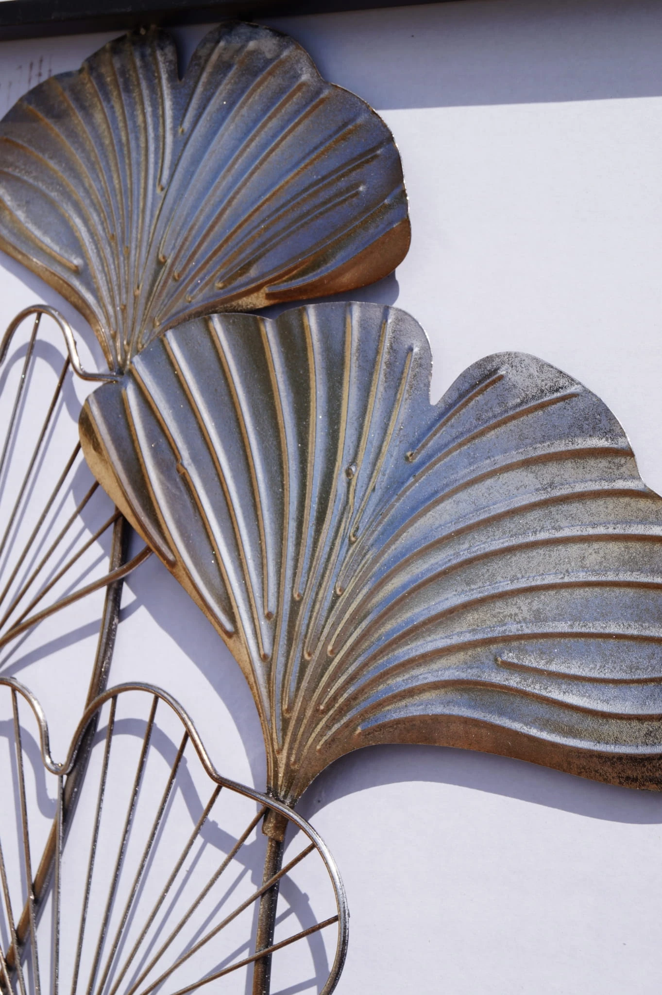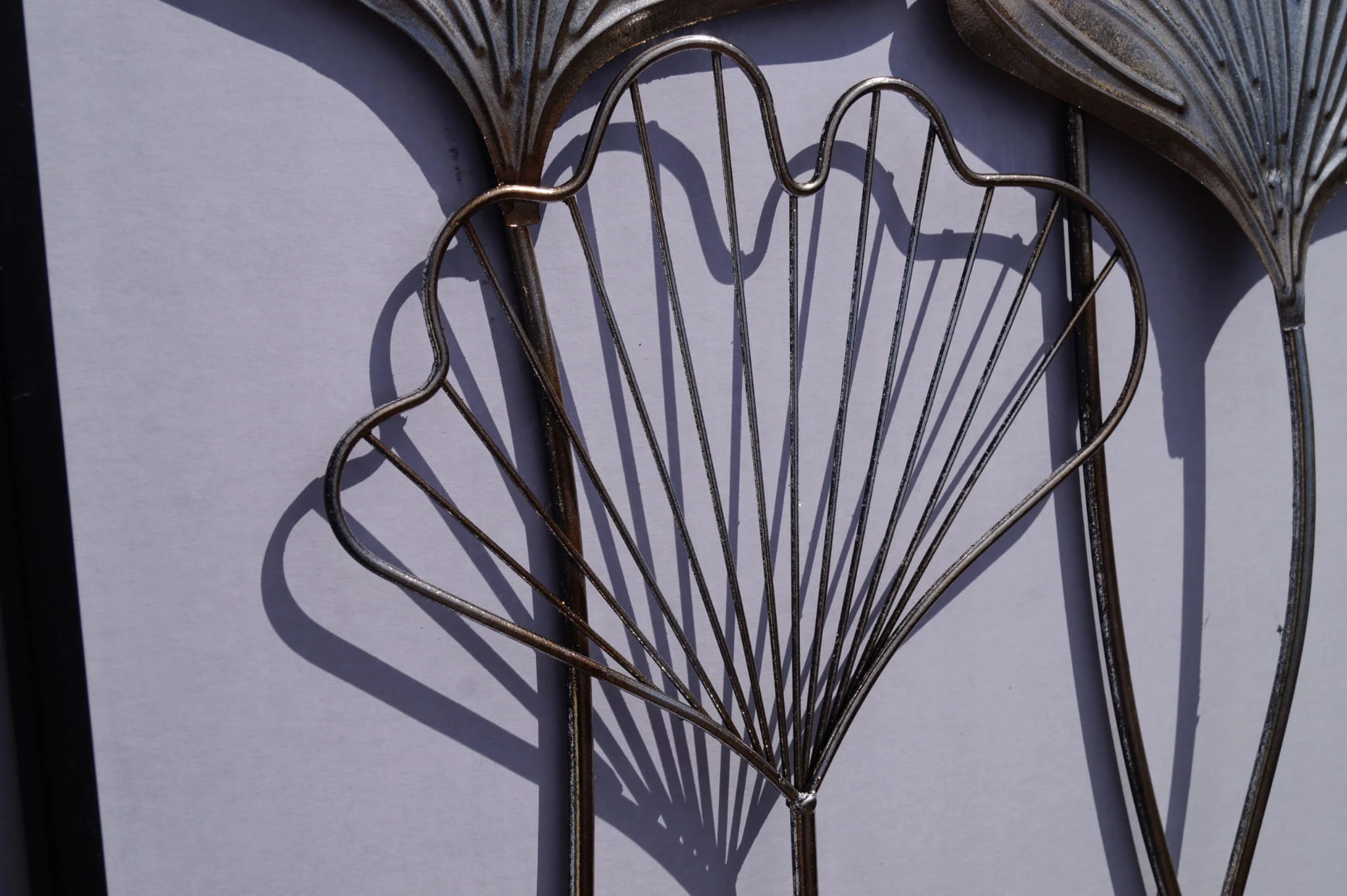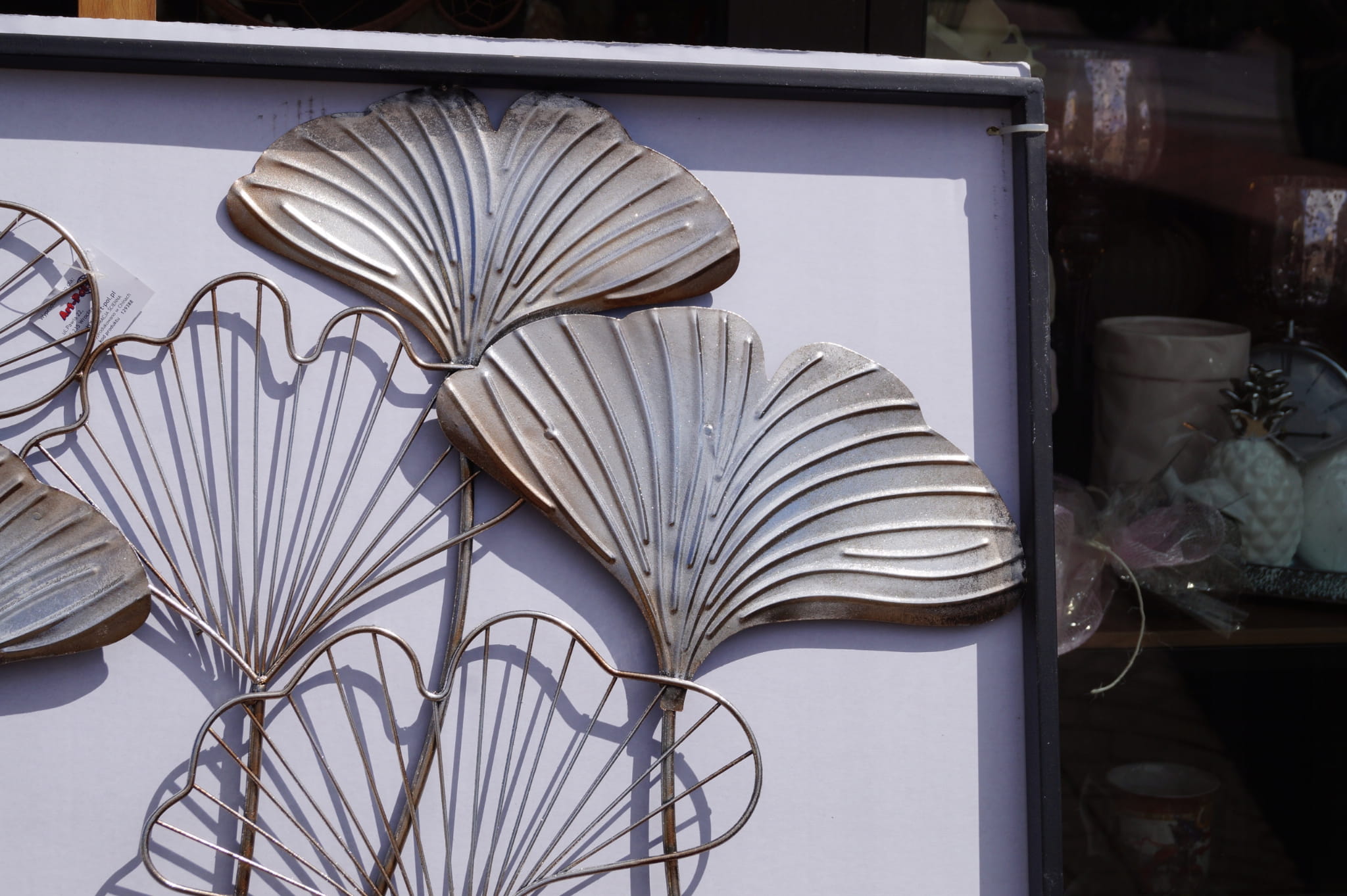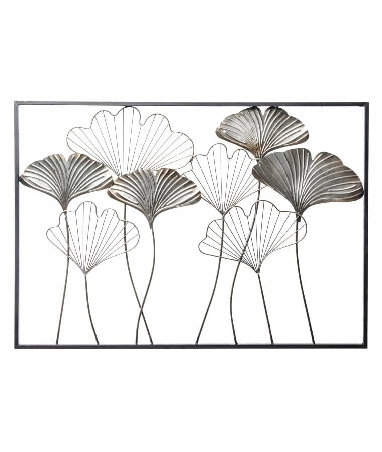 Metalowa dekoracja ścienna z motywem liści w srebrnym kolorze oraz czarną ramką.