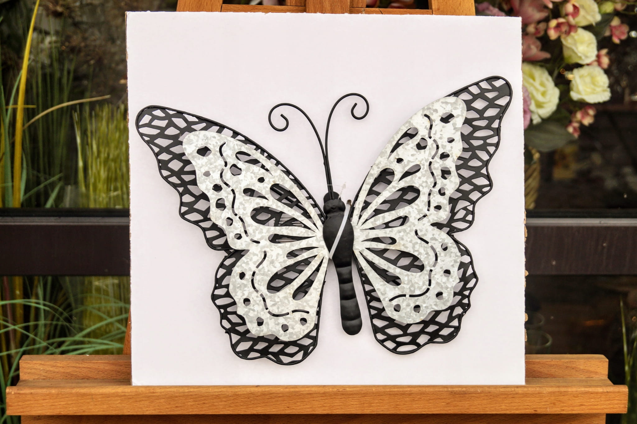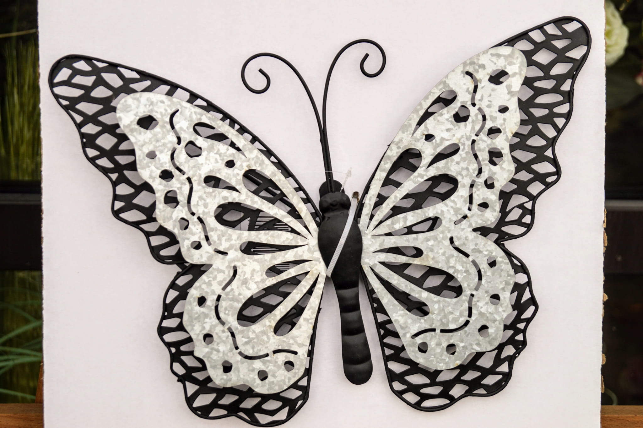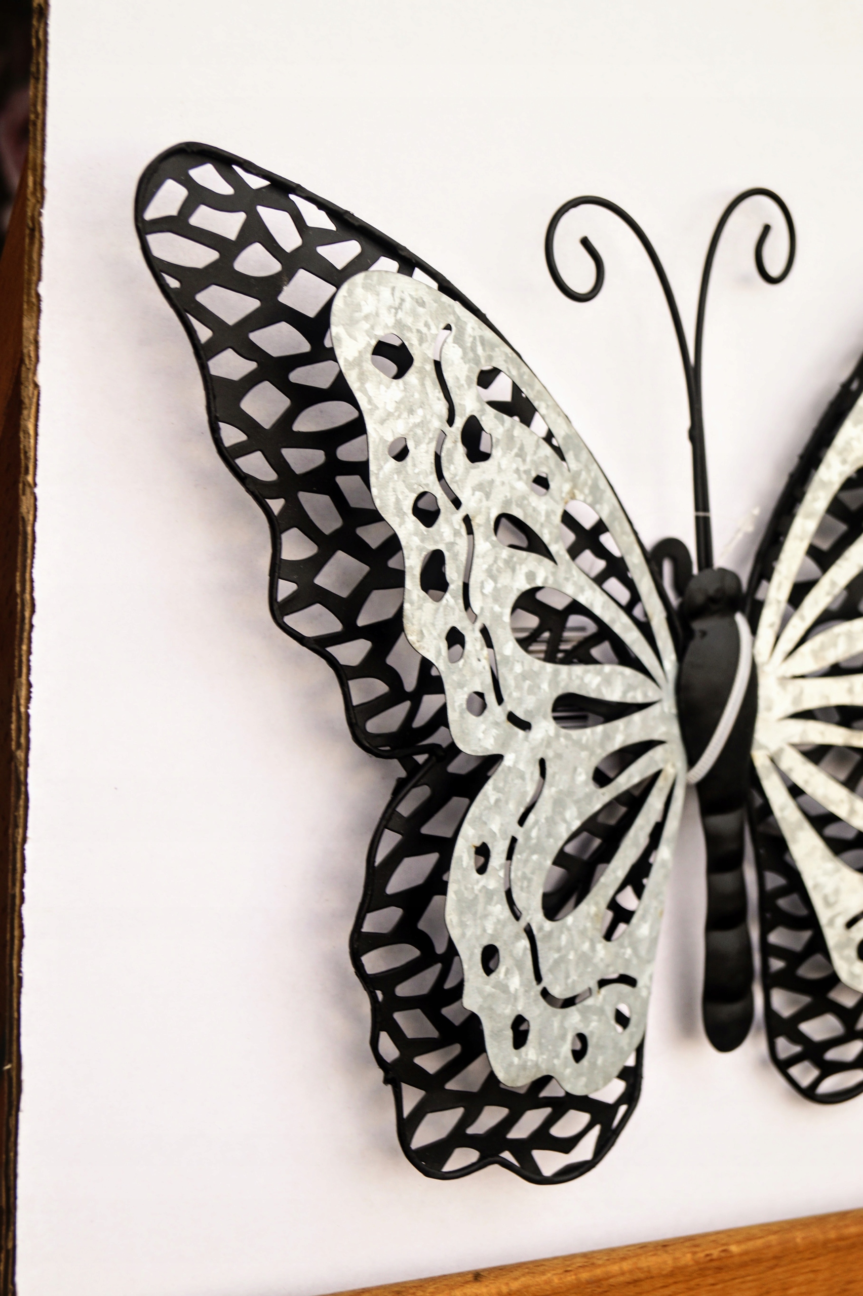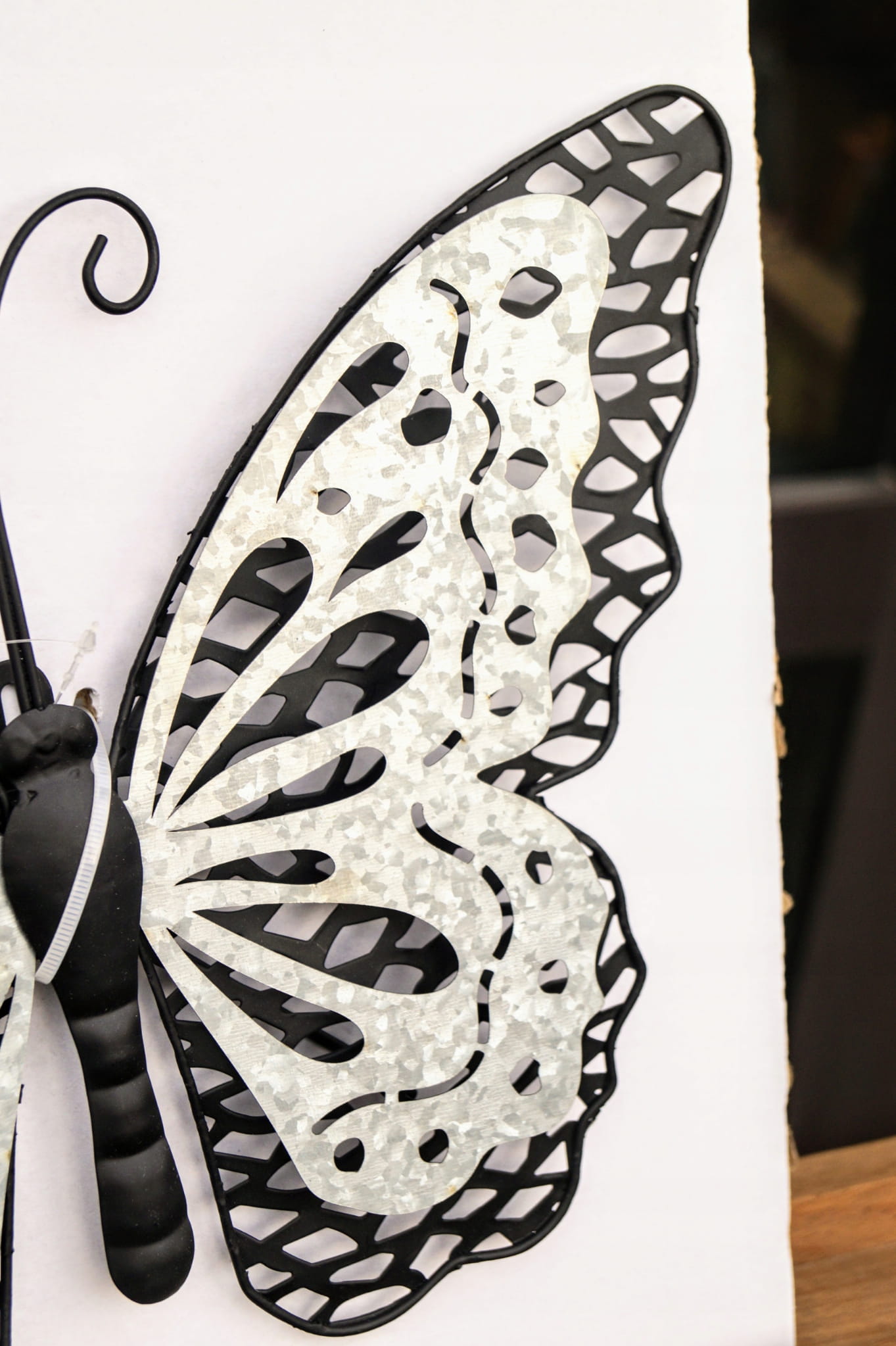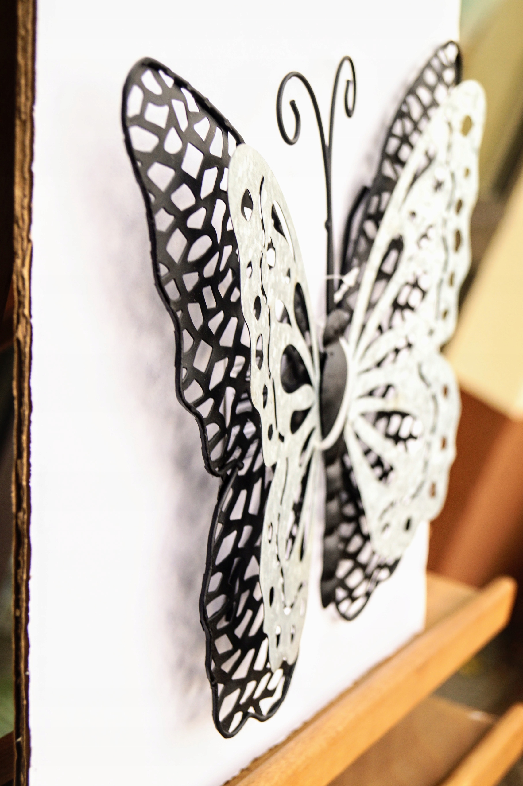 Ażurowa dekoracja w kształcie motyla, wykonana z metalu.