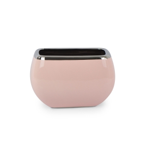Elegancki wazon wykonany z wysokiej jakości ceramiki szlachetnej, wnętrze pokryte błyszczącym szkliwem w kolorze lustrzanego srebra. Srebrne, błyszczące wykończenia są idealnym dopełnieniem modnego koloru – pudrowego różu.