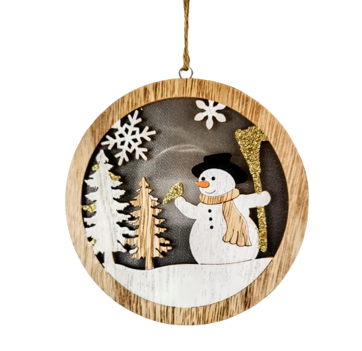 Drewniana zawieszka z bałwankiem i choinką będzie perfekcyjnym akcentem jako ozdoba w oknie, na choince czy też w dowolnym miejscu.