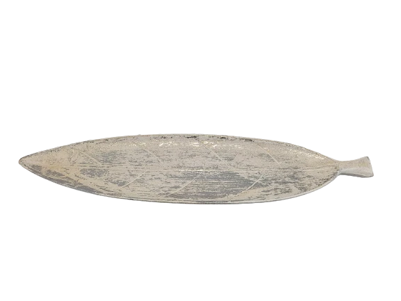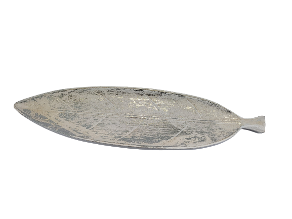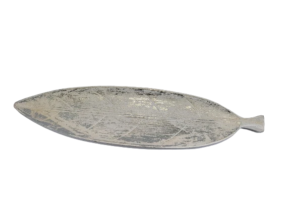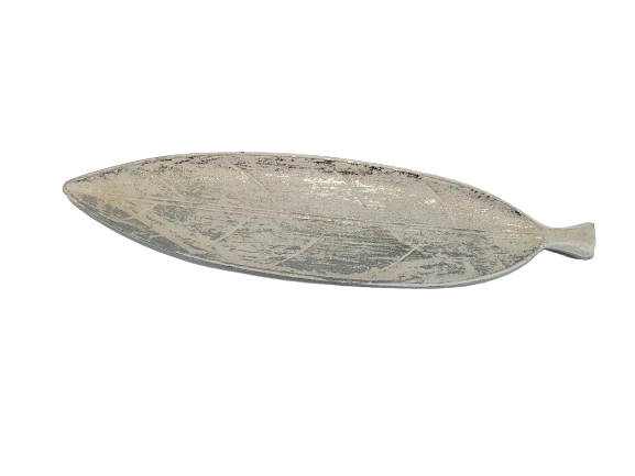 Podłużna podkładka/patera w kształcie liścia, biała przecierana srebrem.
