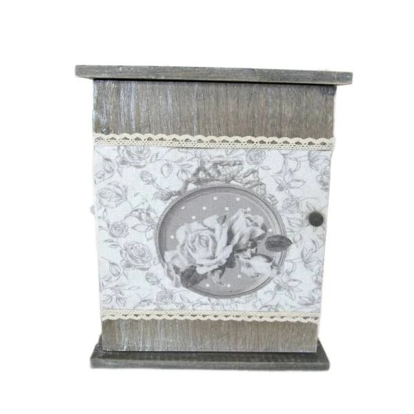 Skrzynka z 6 wieszakami na klucze. Wykonana z drewna. Skrzynka w kolorze szarym. Drzwi udekorowane są pięknymi oryginalnymi wzorami.