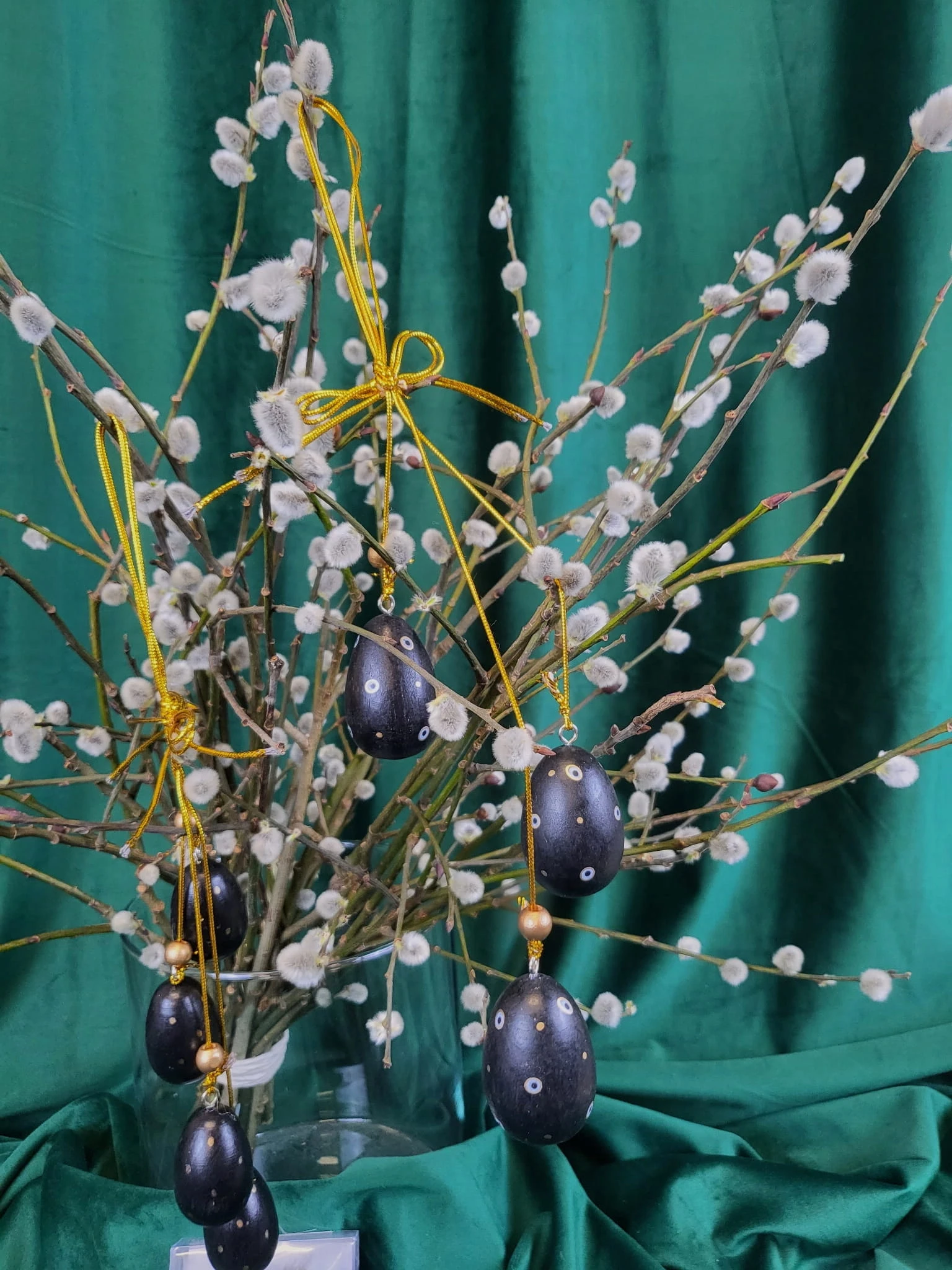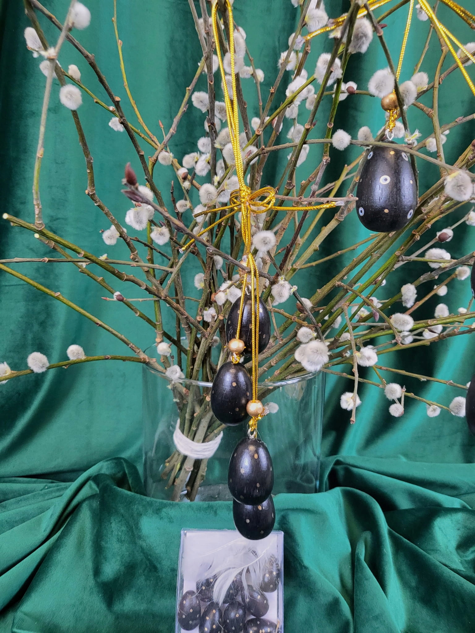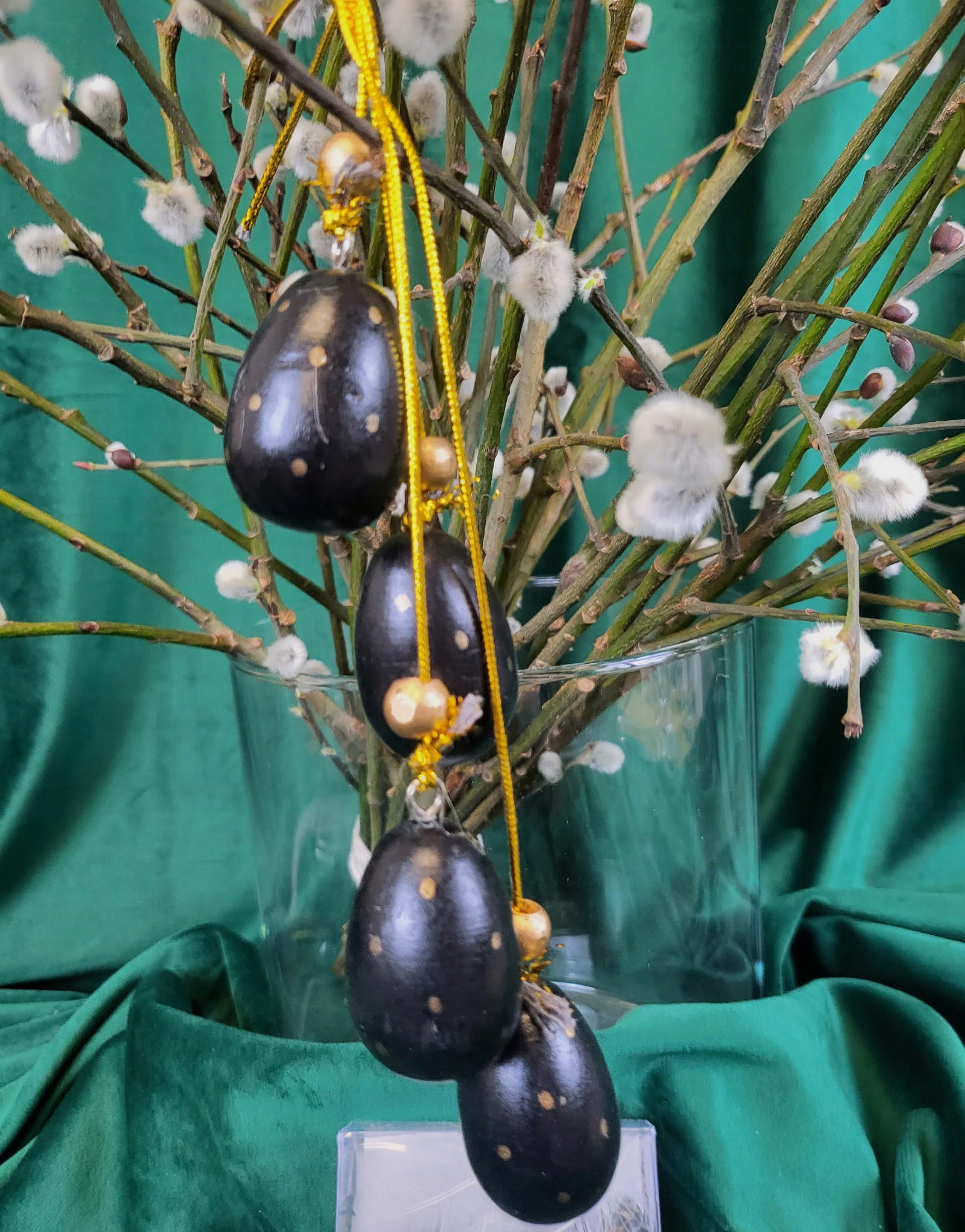DREWNIANA ZAWIESZKA 4 JAJKA CZARNE W KROPKI