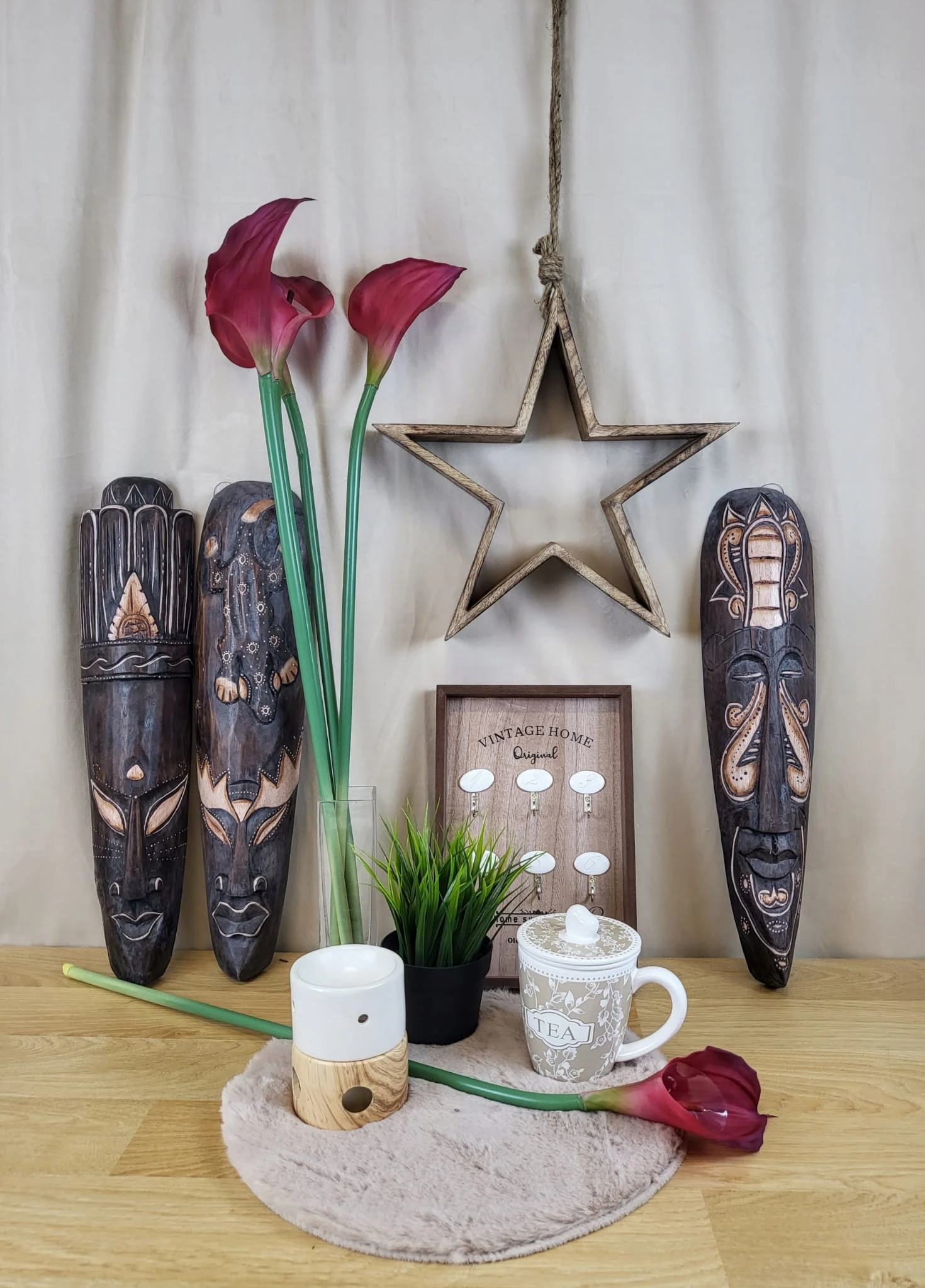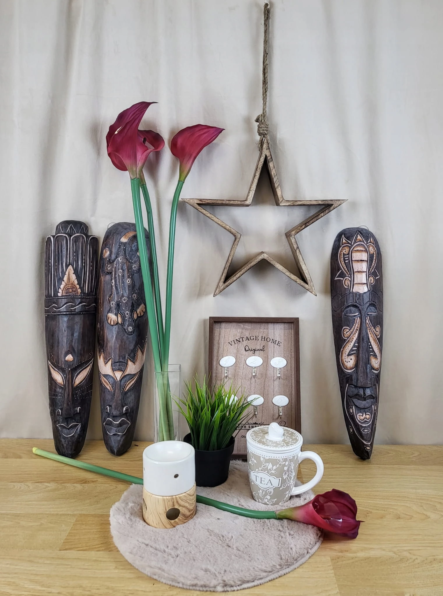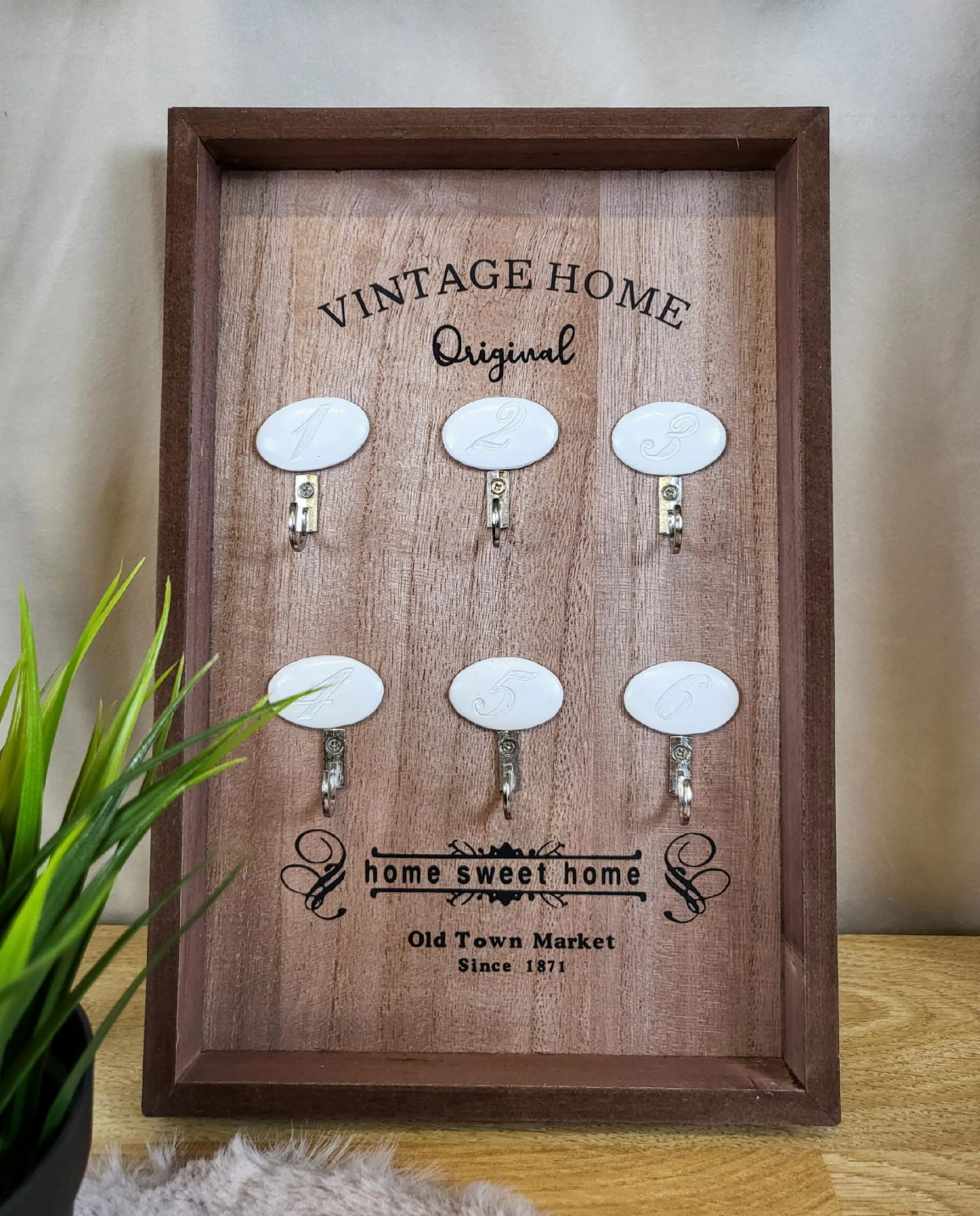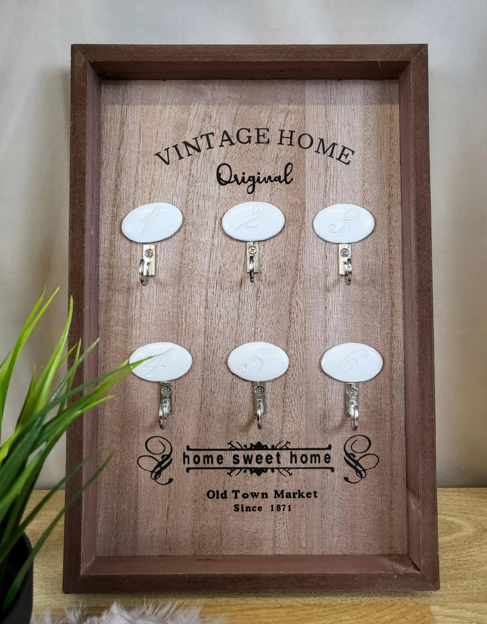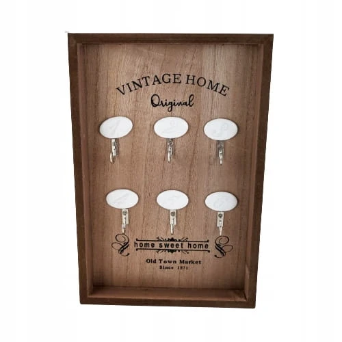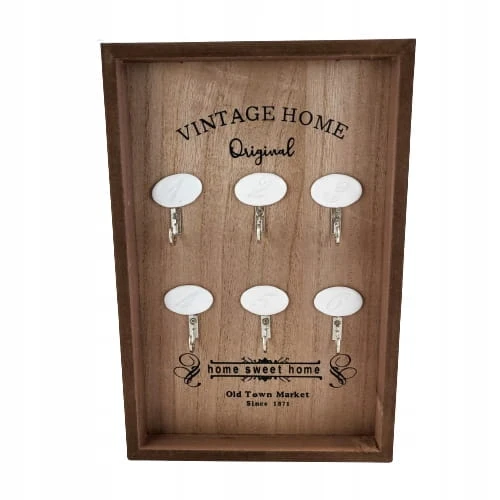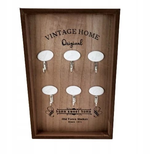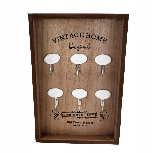 Tablica na klucze z drewniana ramką, z czarnymi napisami oraz sześcioma haczykami do zawieszenia kluczy.
