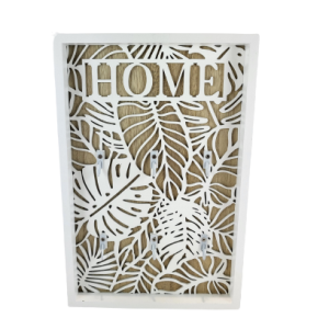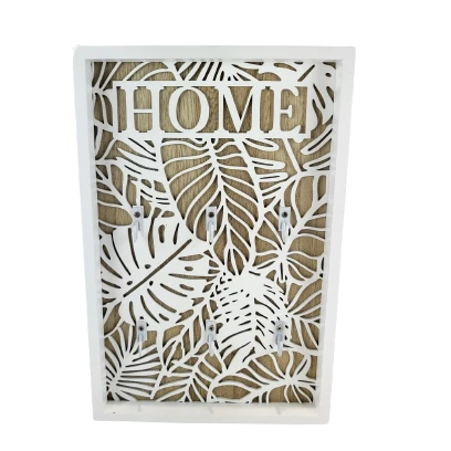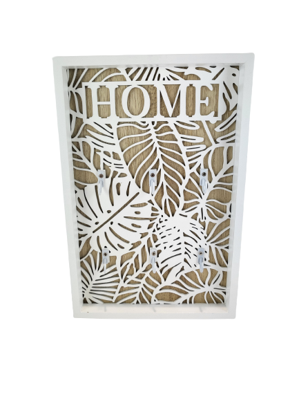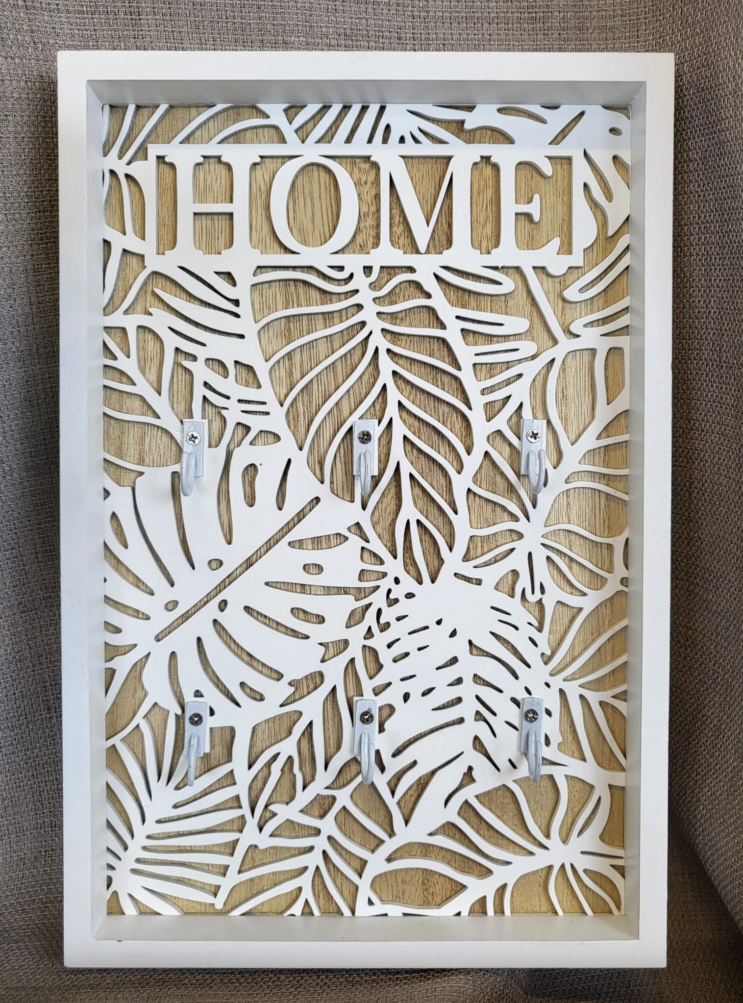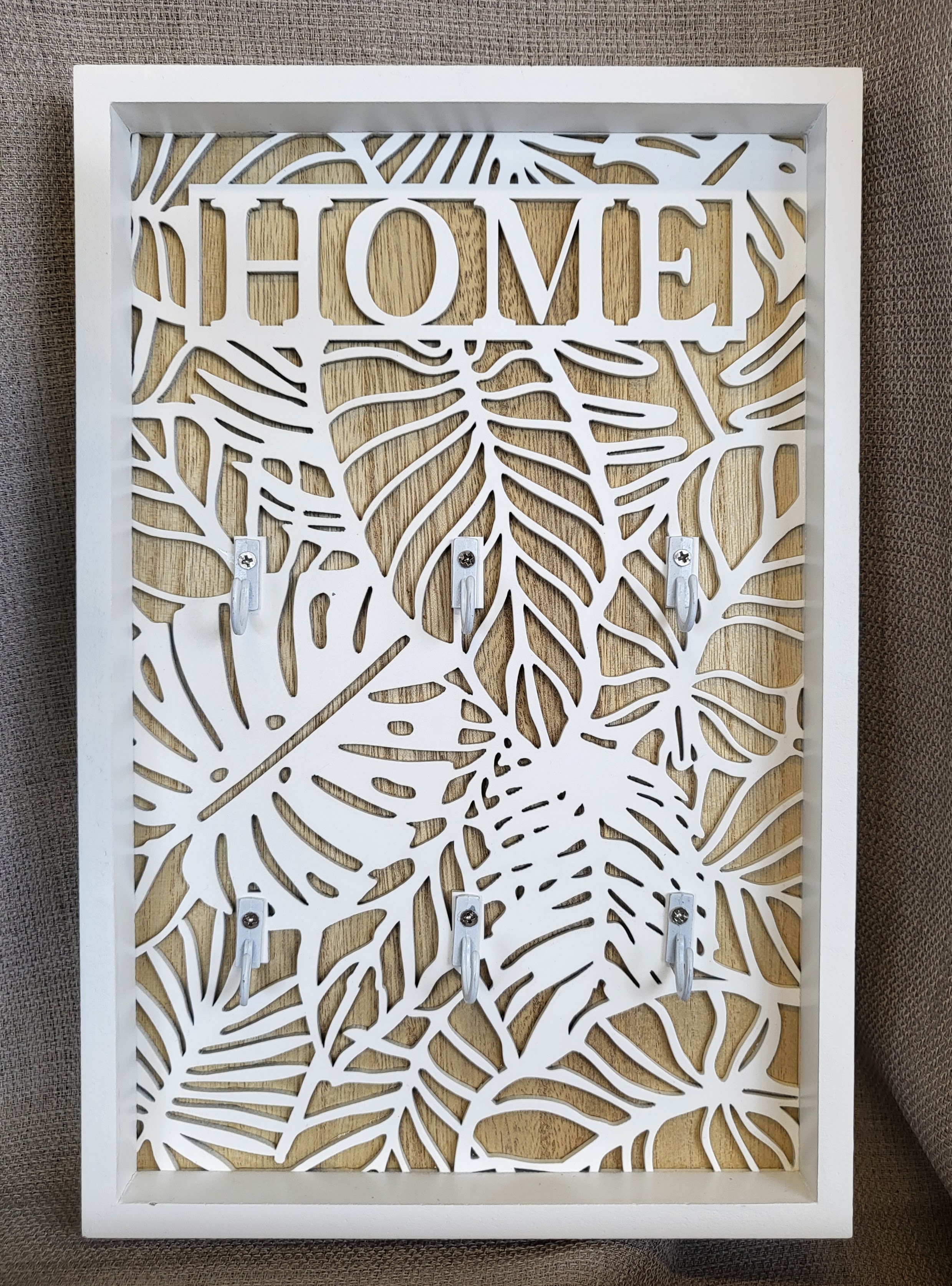 Tablica na klucze z drewniana ramką oraz sześcioma haczykami do zawieszenia kluczy.