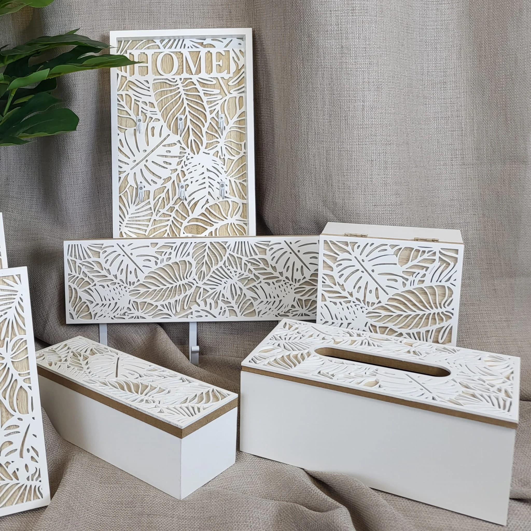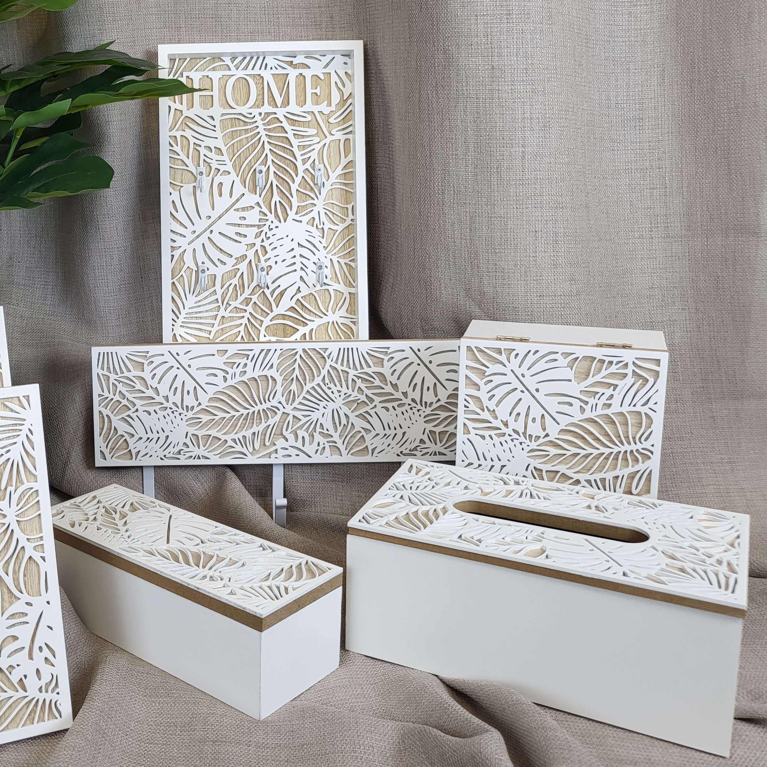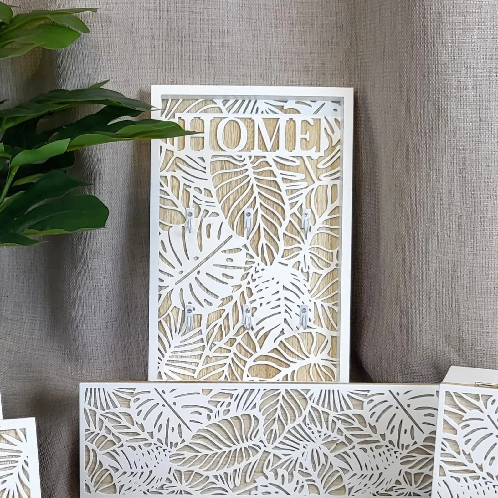 Tablica na klucze z drewniana ramką oraz sześcioma haczykami do zawieszenia kluczy.