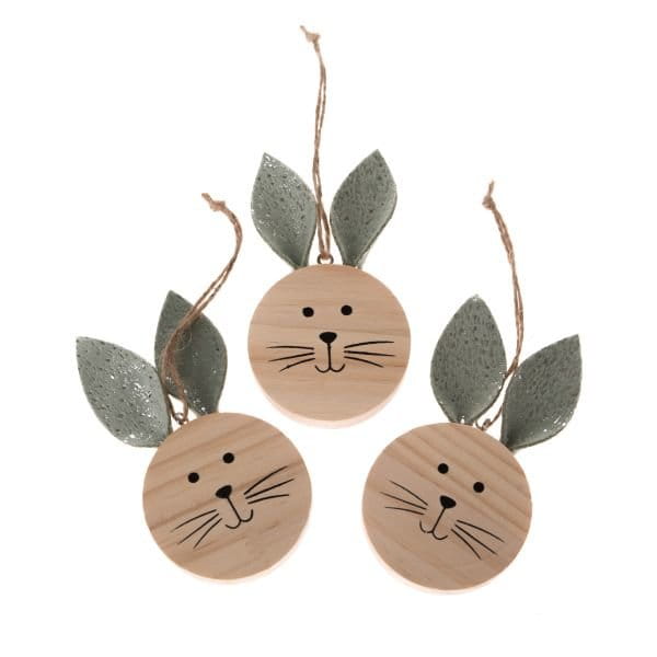 Komplet drewnianych zawieszek w kształcie królików. Nada niepowtarzalnego charakteru wnętrzu urządzonego praktycznie w każdym stylu.