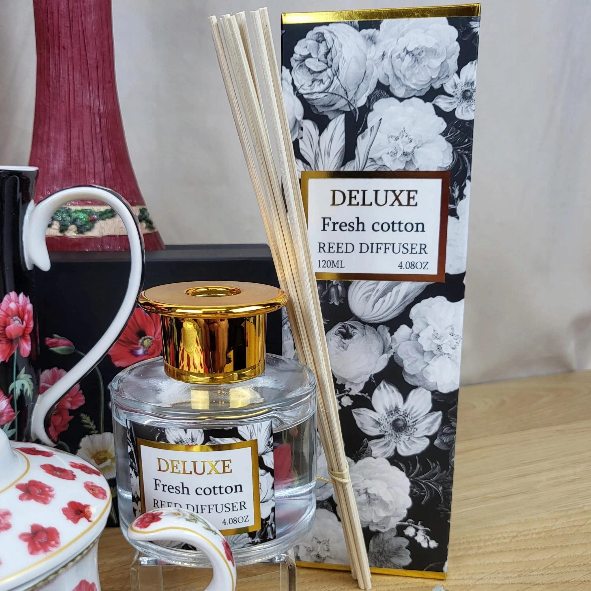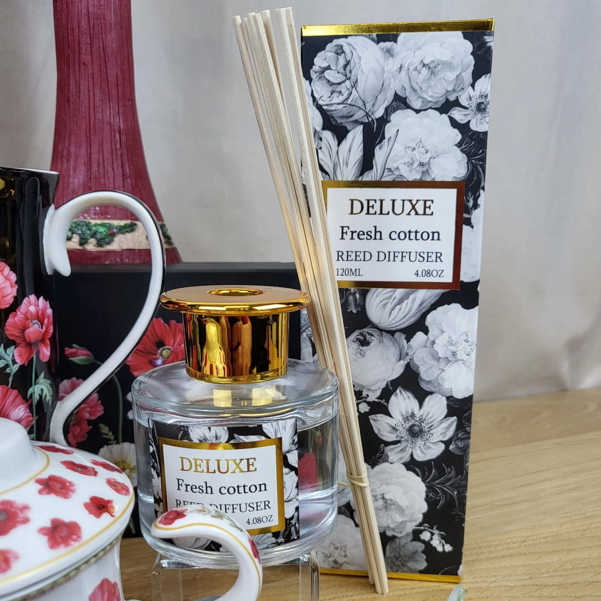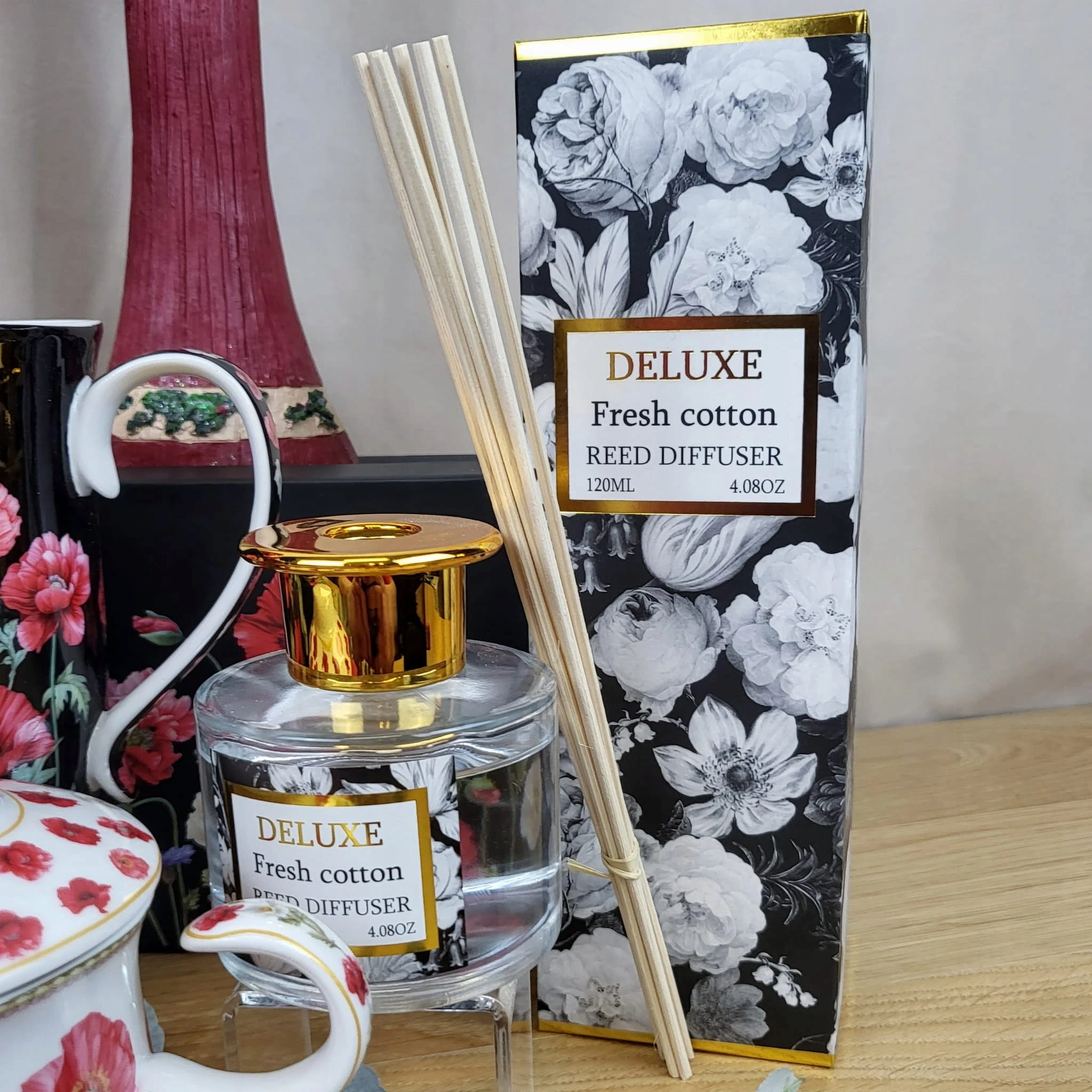 - zestaw zawiera: szklaną karafkę napełnioną olejkiem zapachowym i patyczki