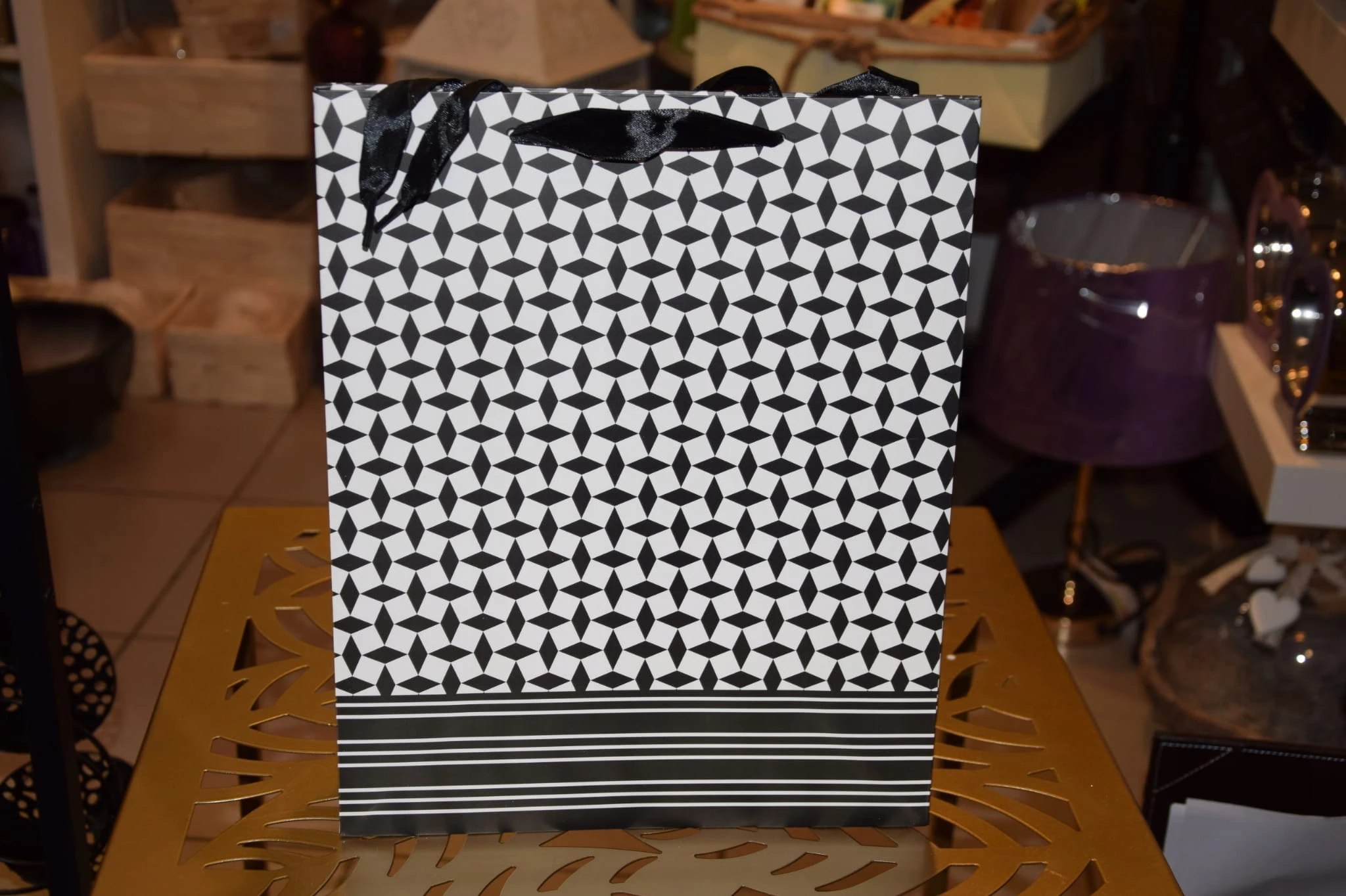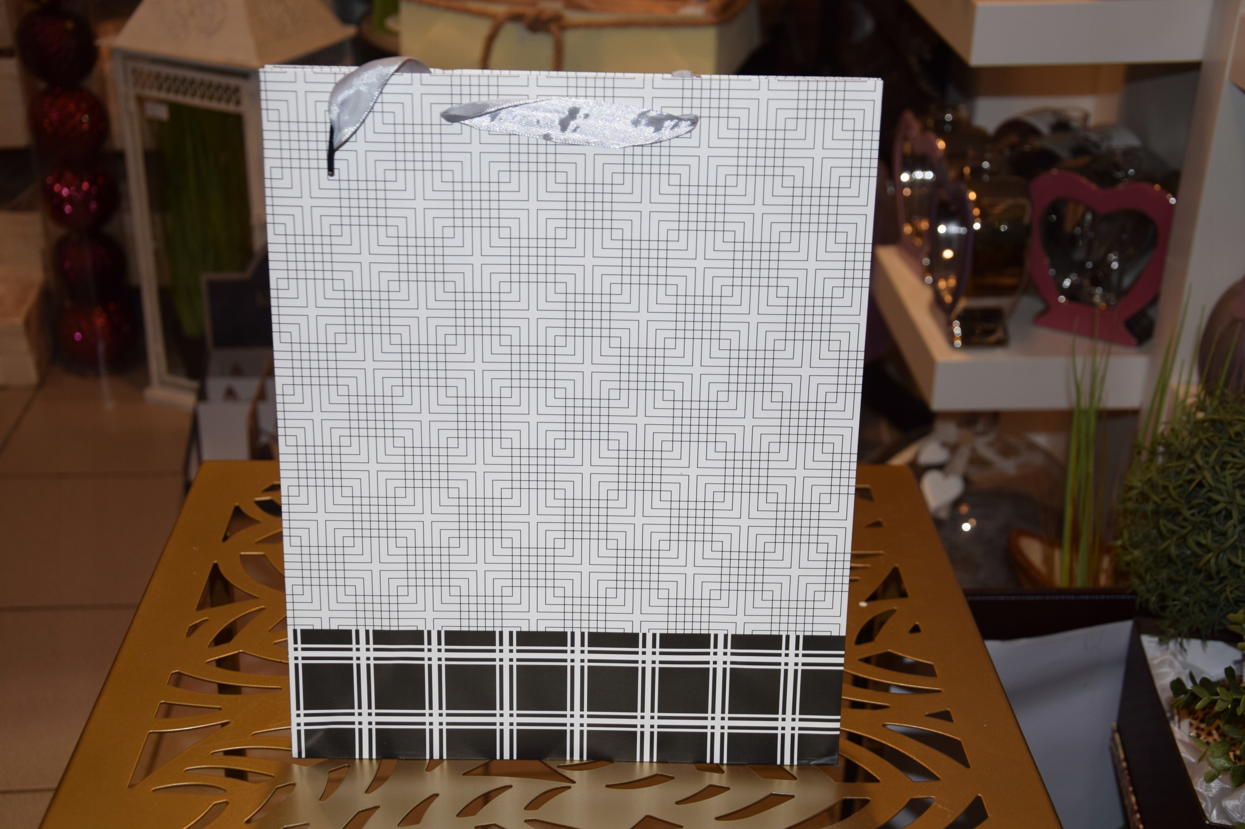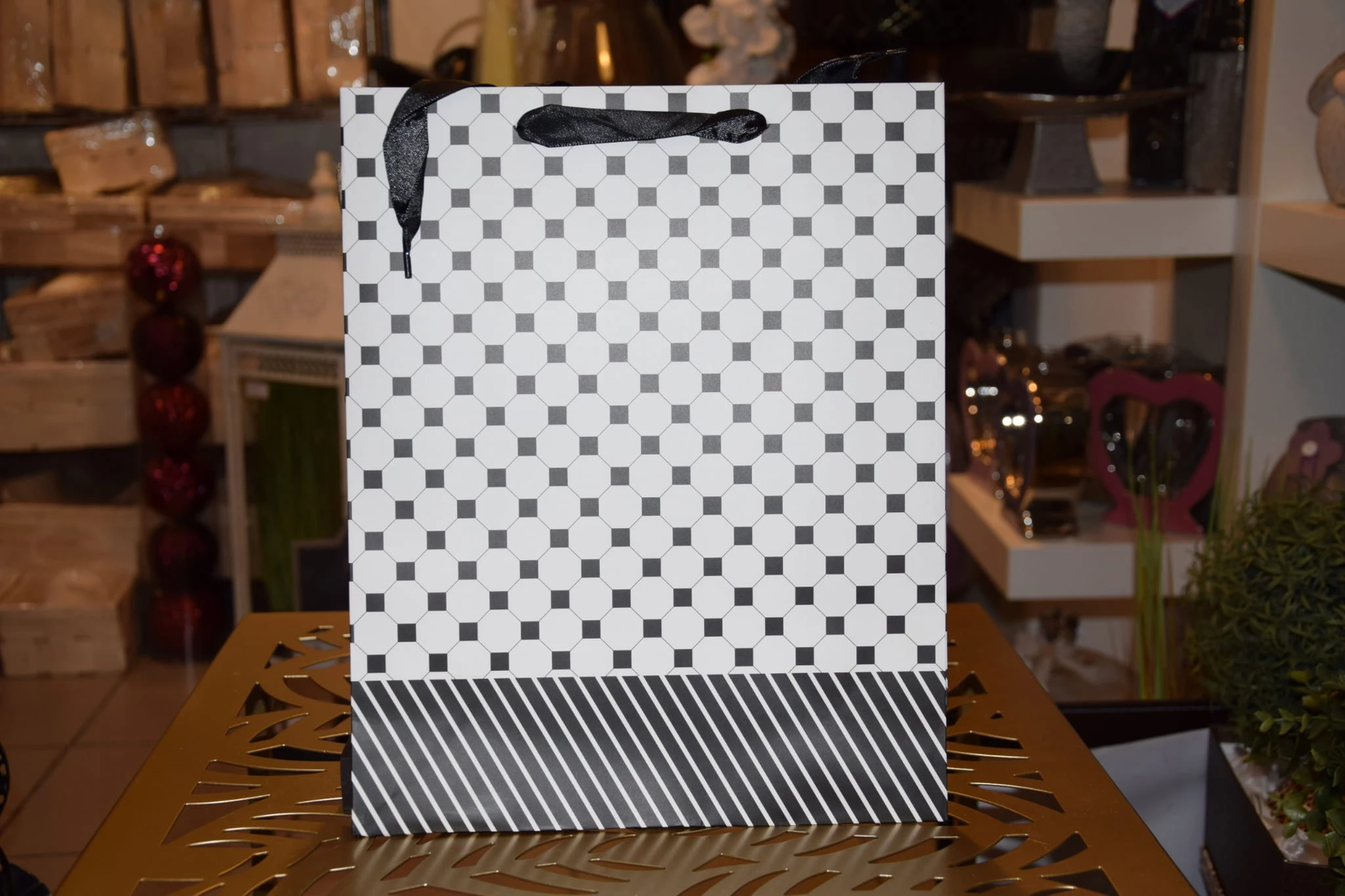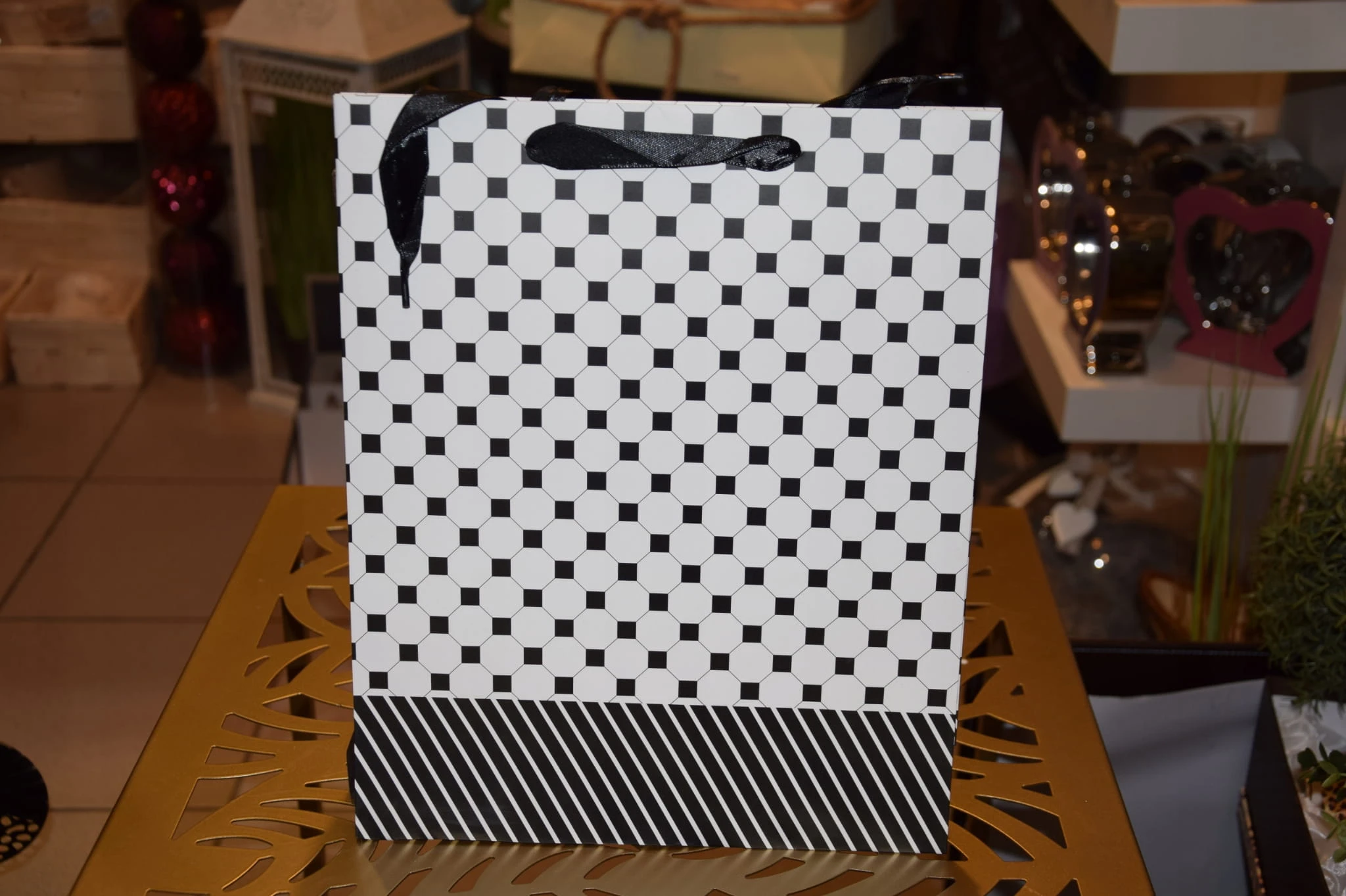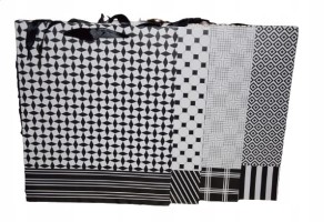 Elegancka czarno - biała torebka prezentowa wykonana z wysokiej jakości, grubego papieru. Uchwyty wykonane są z dopasowanej kolorystycznie wstążki.