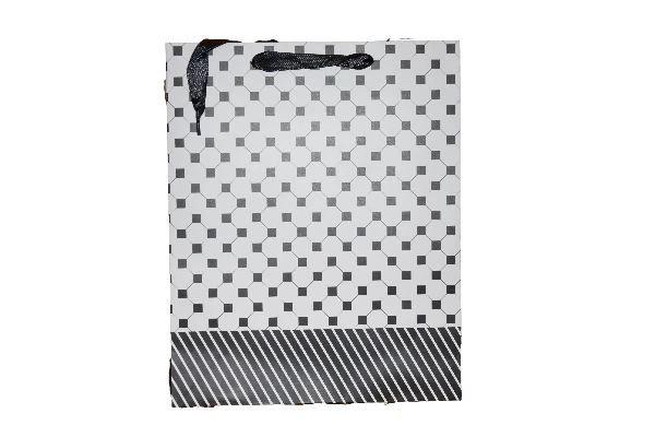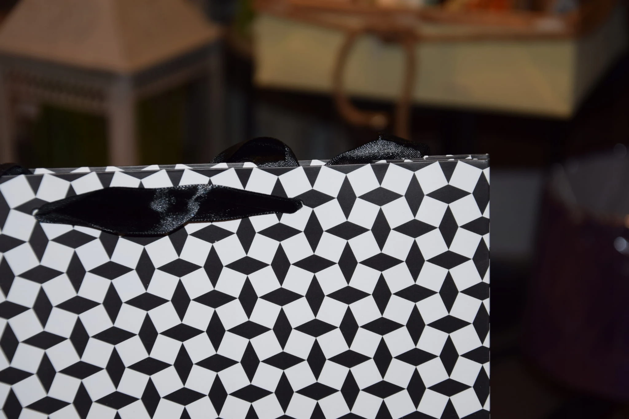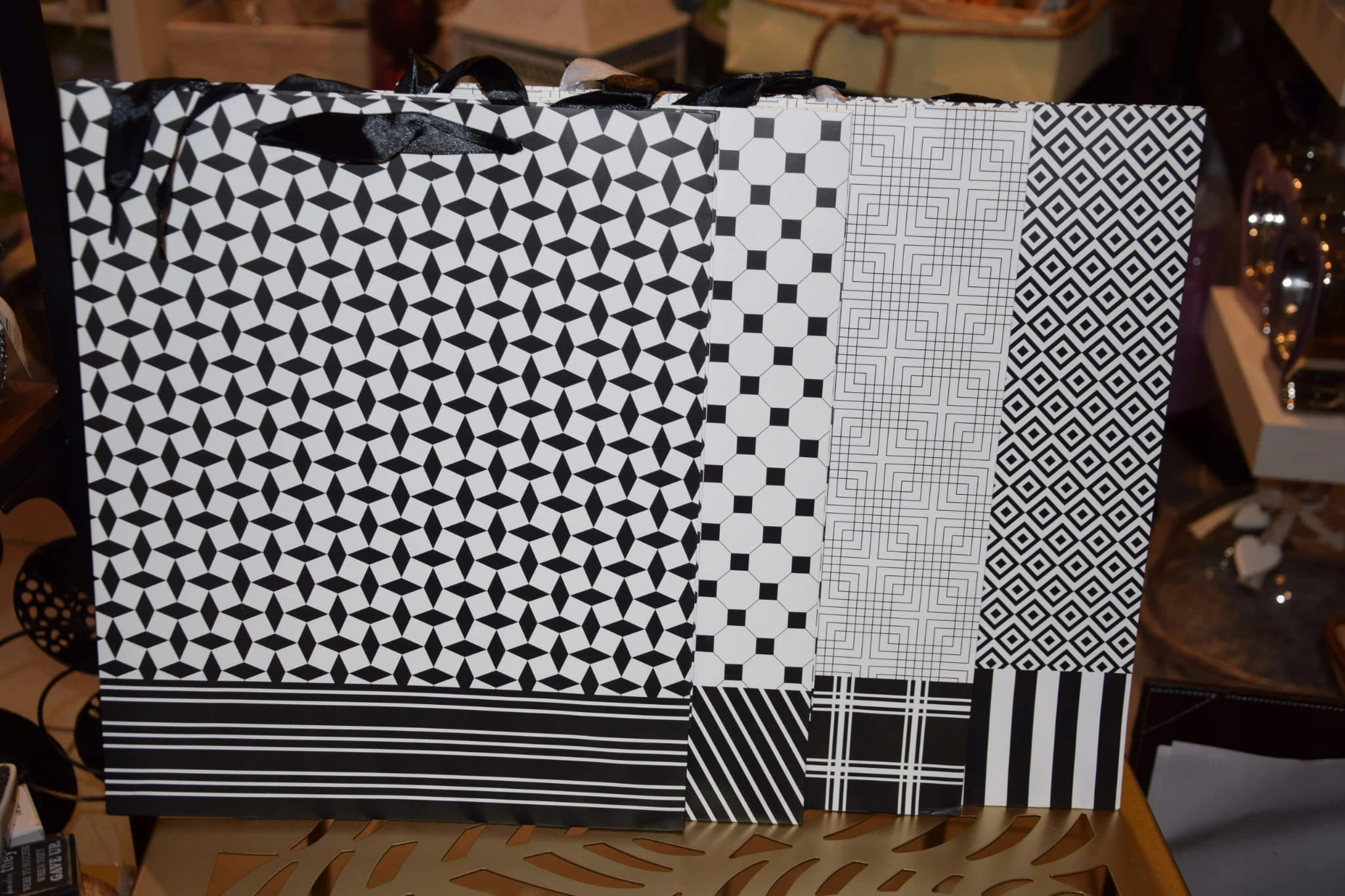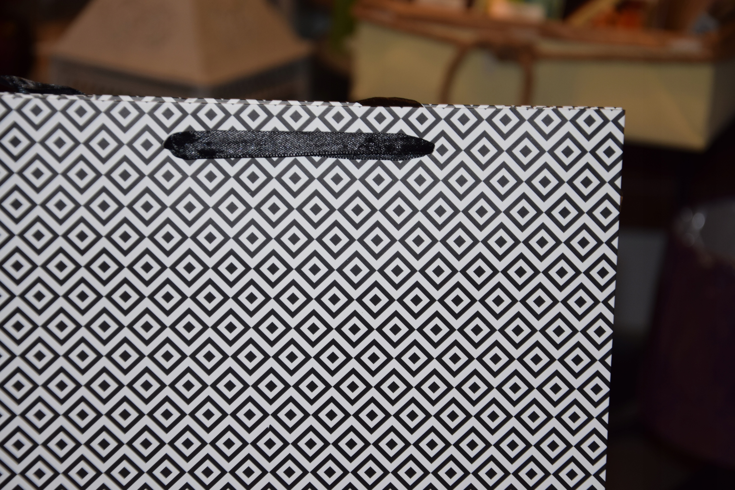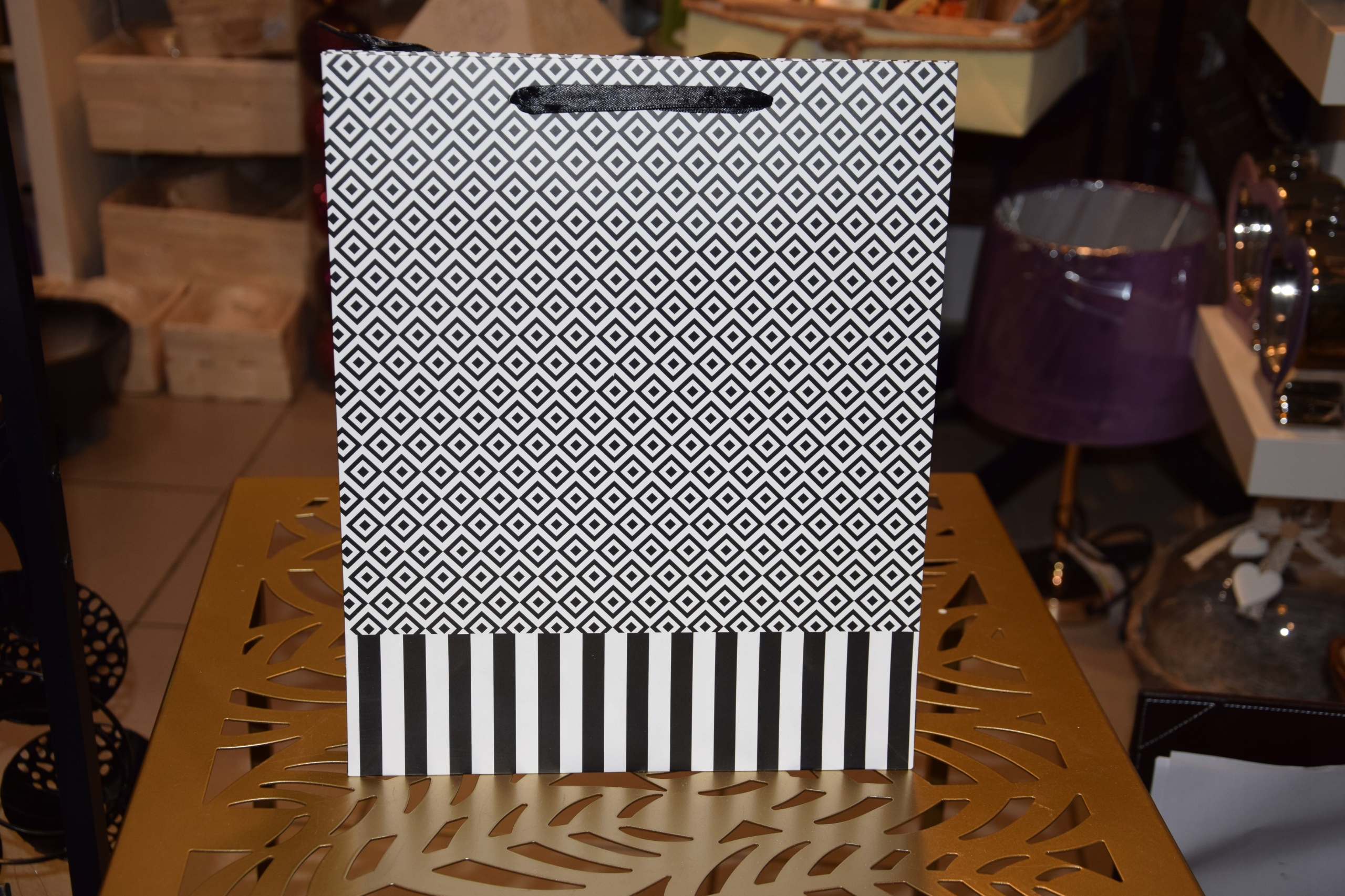 Elegancka czarno - biała torebka prezentowa wykonana z wysokiej jakości, grubego papieru. Uchwyty wykonane są z dopasowanej kolorystycznie wstążki.