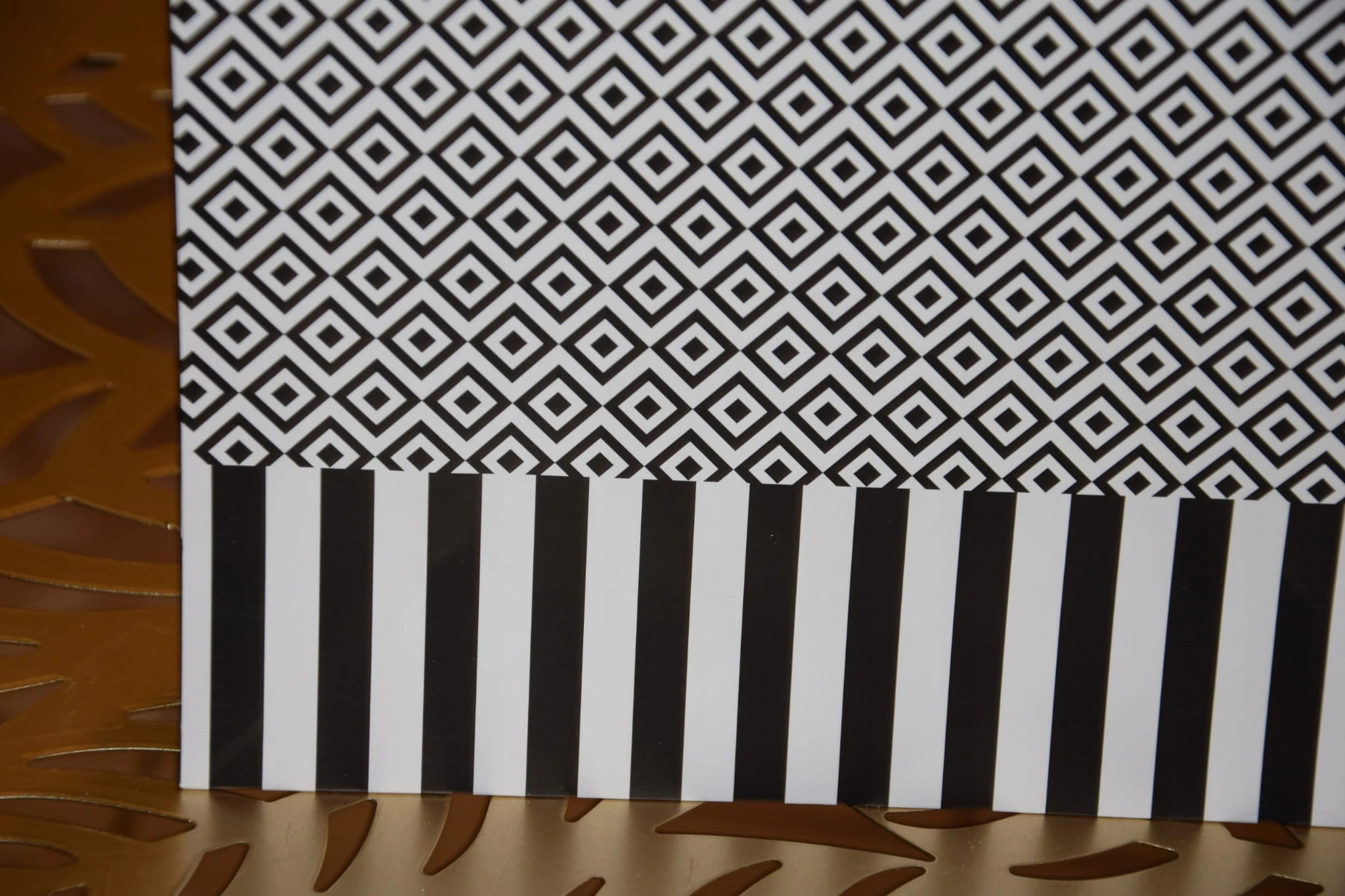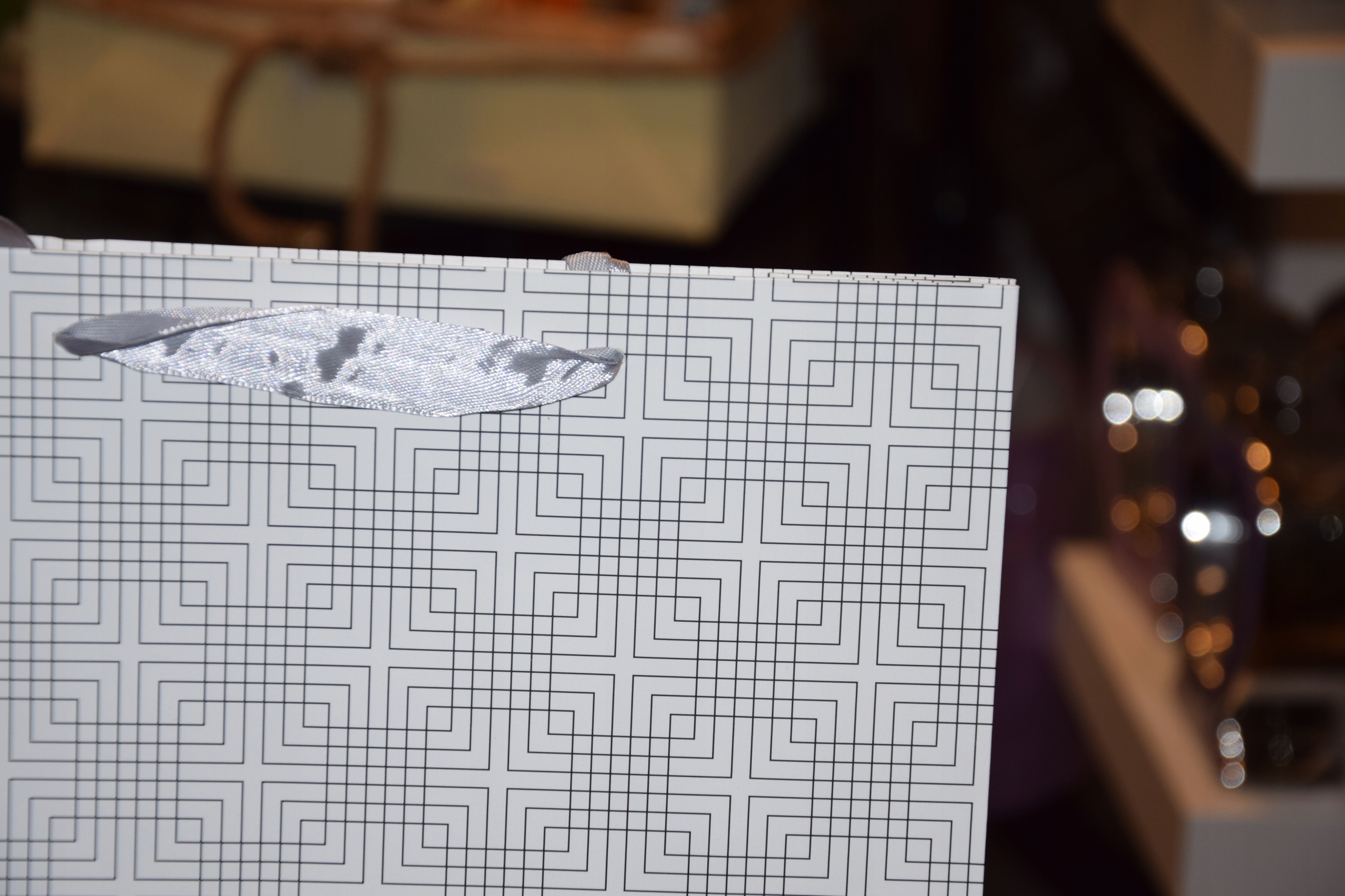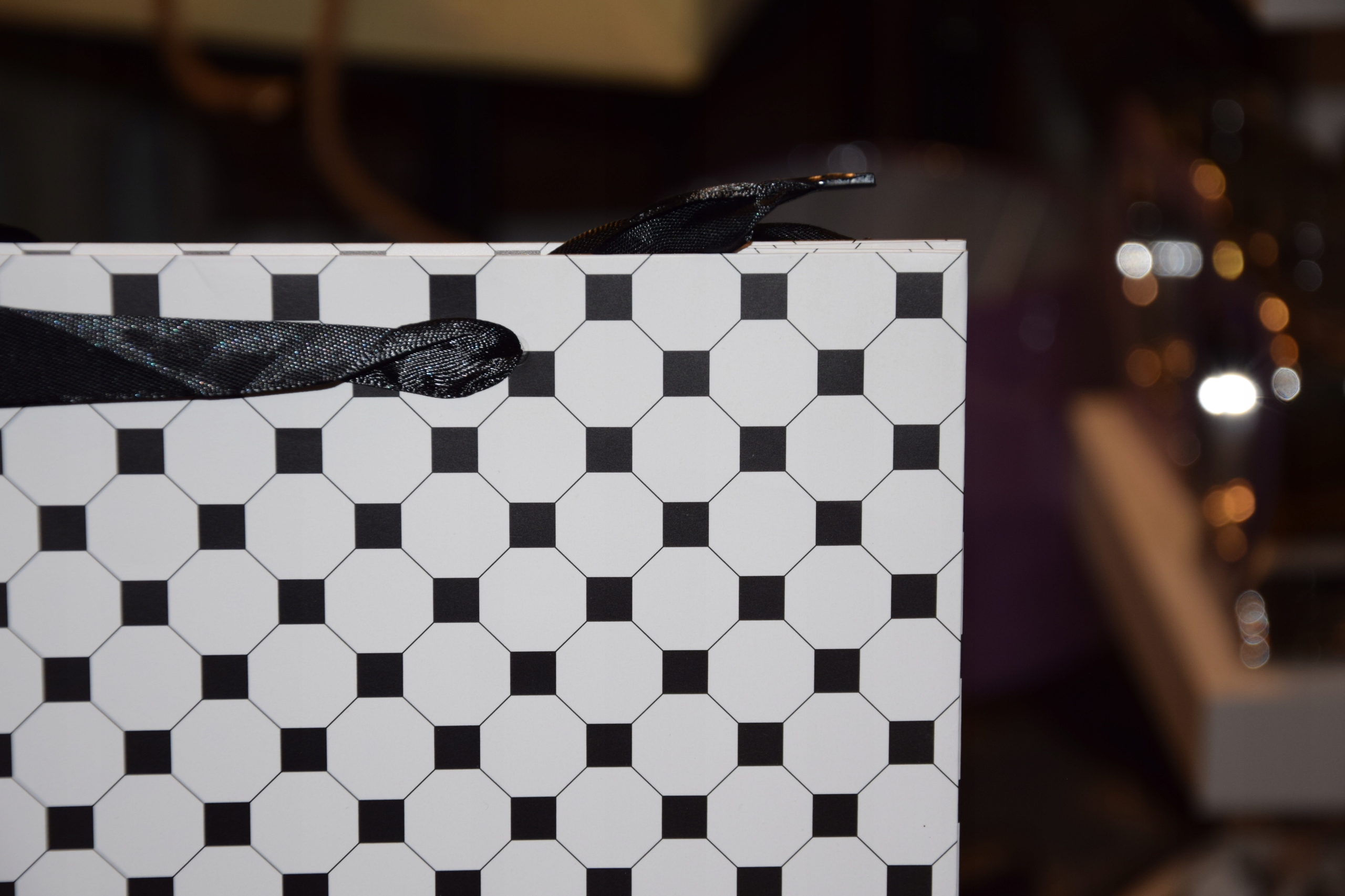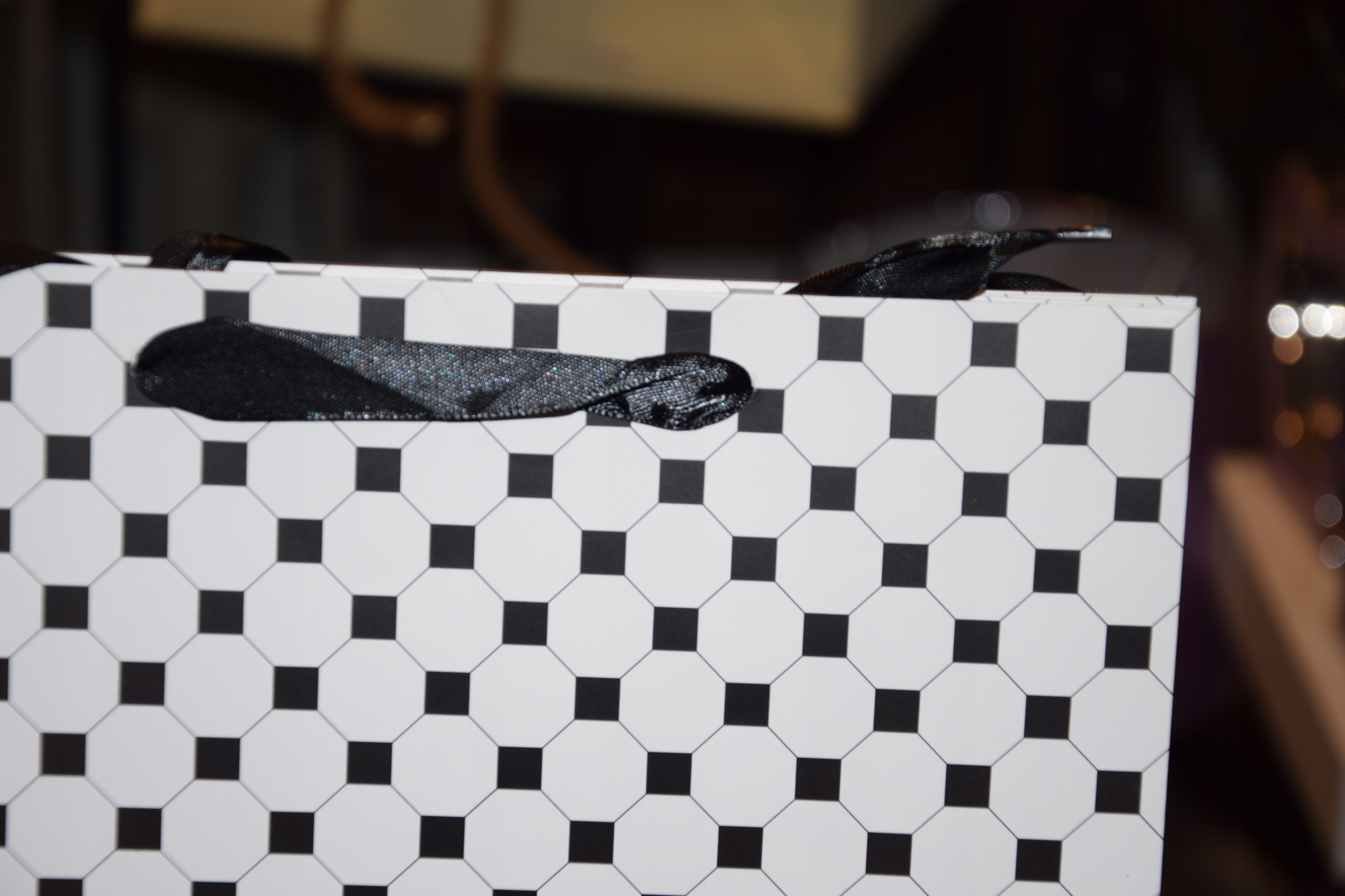 Elegancka czarno - biała torebka prezentowa wykonana z wysokiej jakości, grubego papieru. Uchwyty wykonane są z dopasowanej kolorystycznie wstążki.