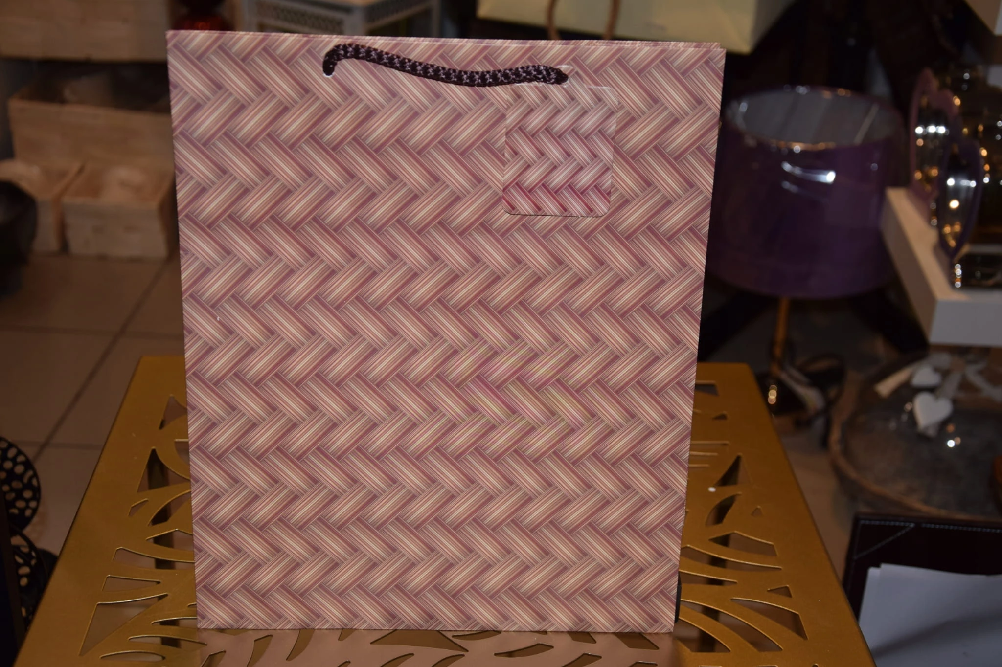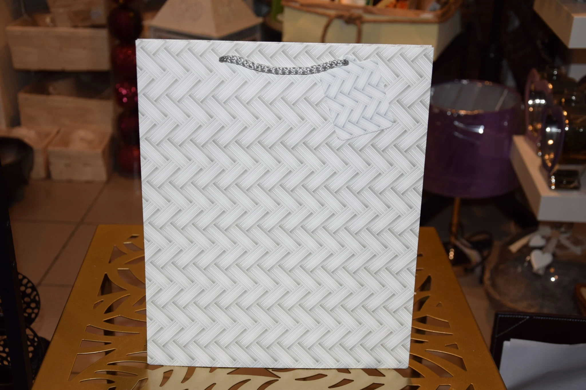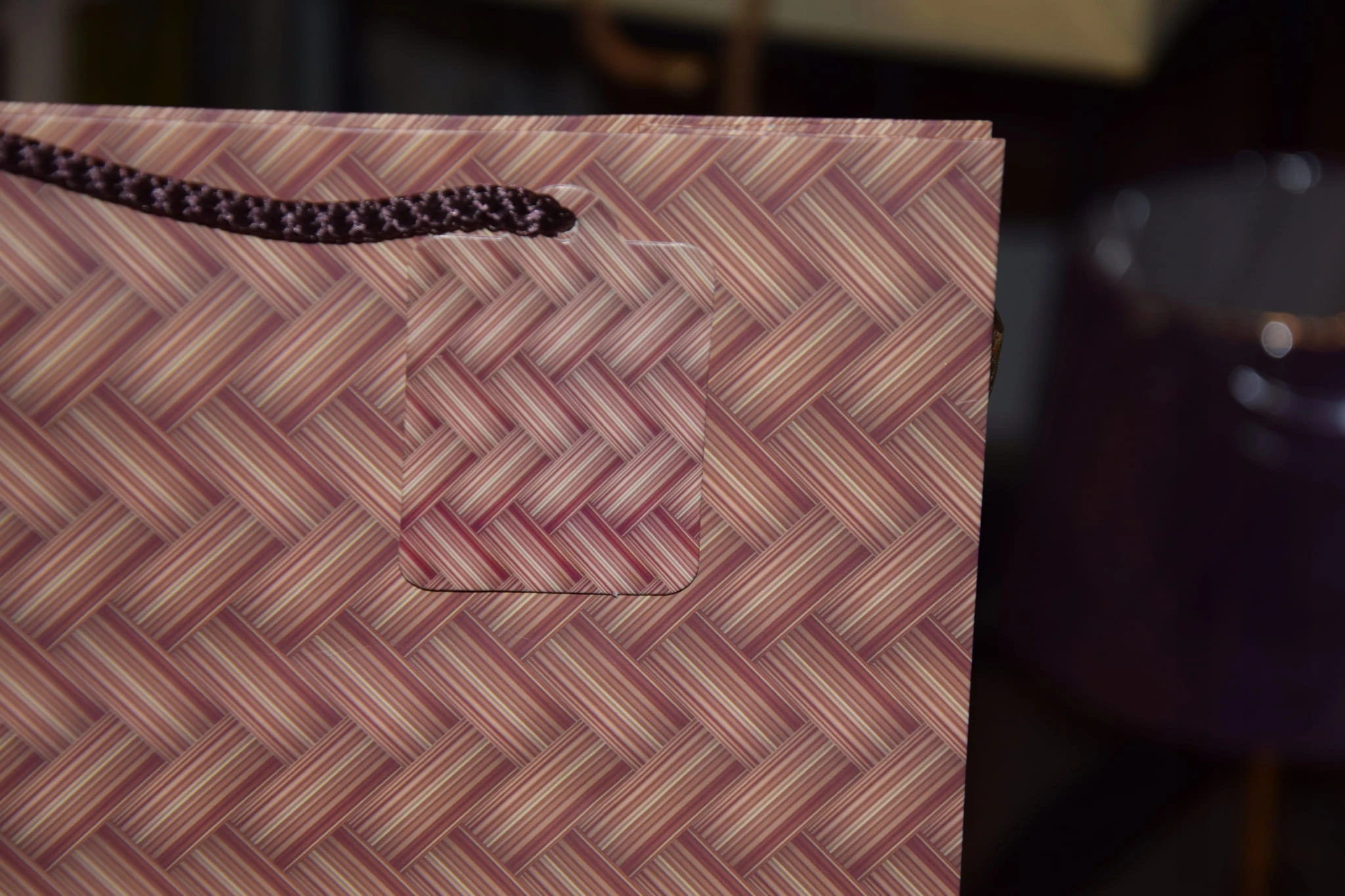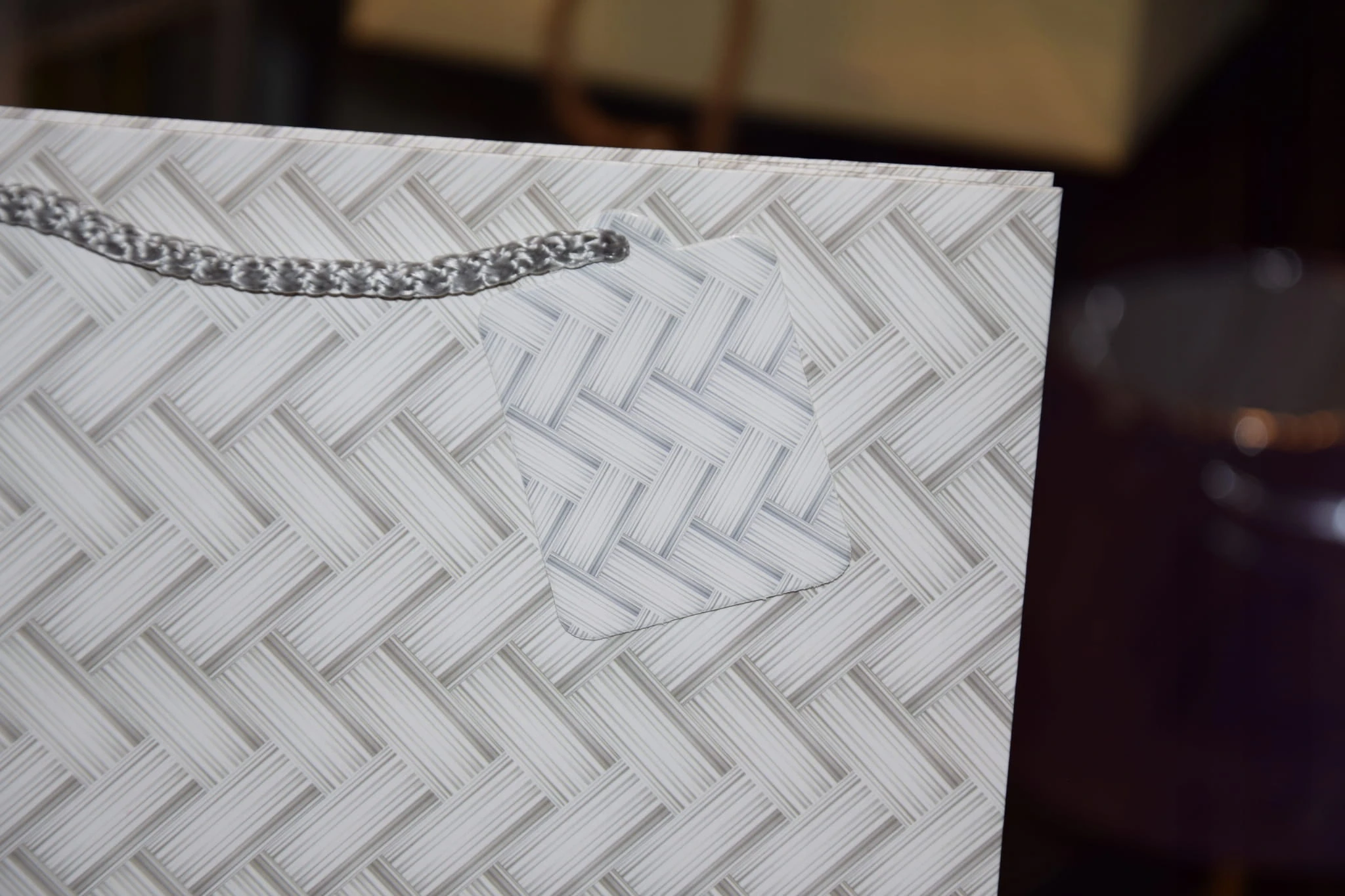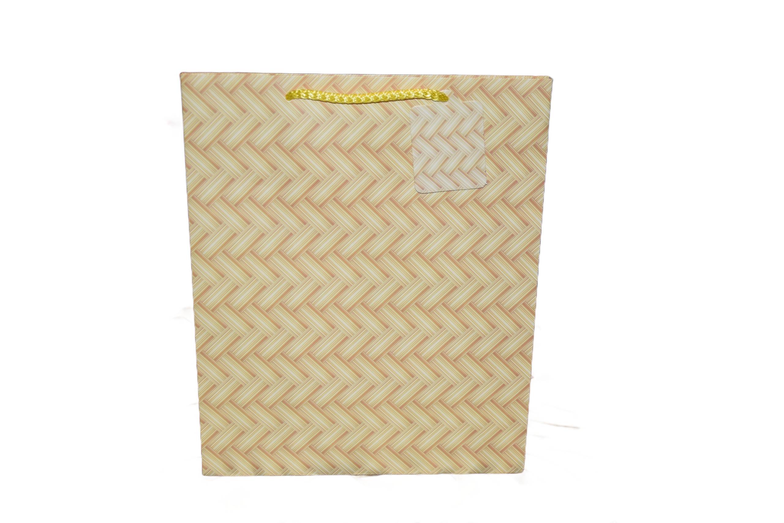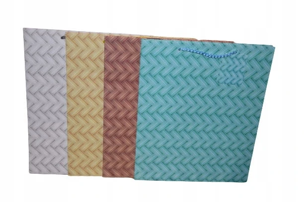 Elegancka torebka prezentowa zdobiona wyszukanymi, stonowanymi, regularnymi wzorami kolorystycznymi. Wykonana z wysokiej jakości, grubego papieru. Uchwyty wykonane są z dopasowanego kolorystycznie sznurka.