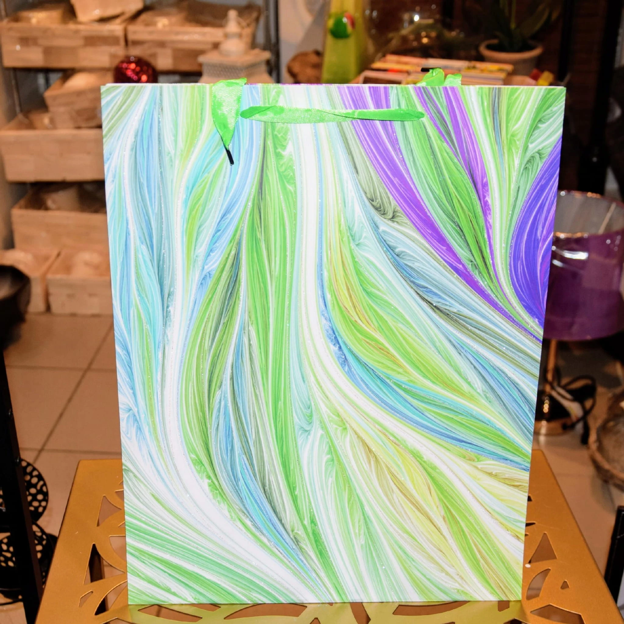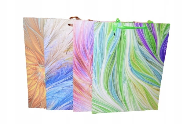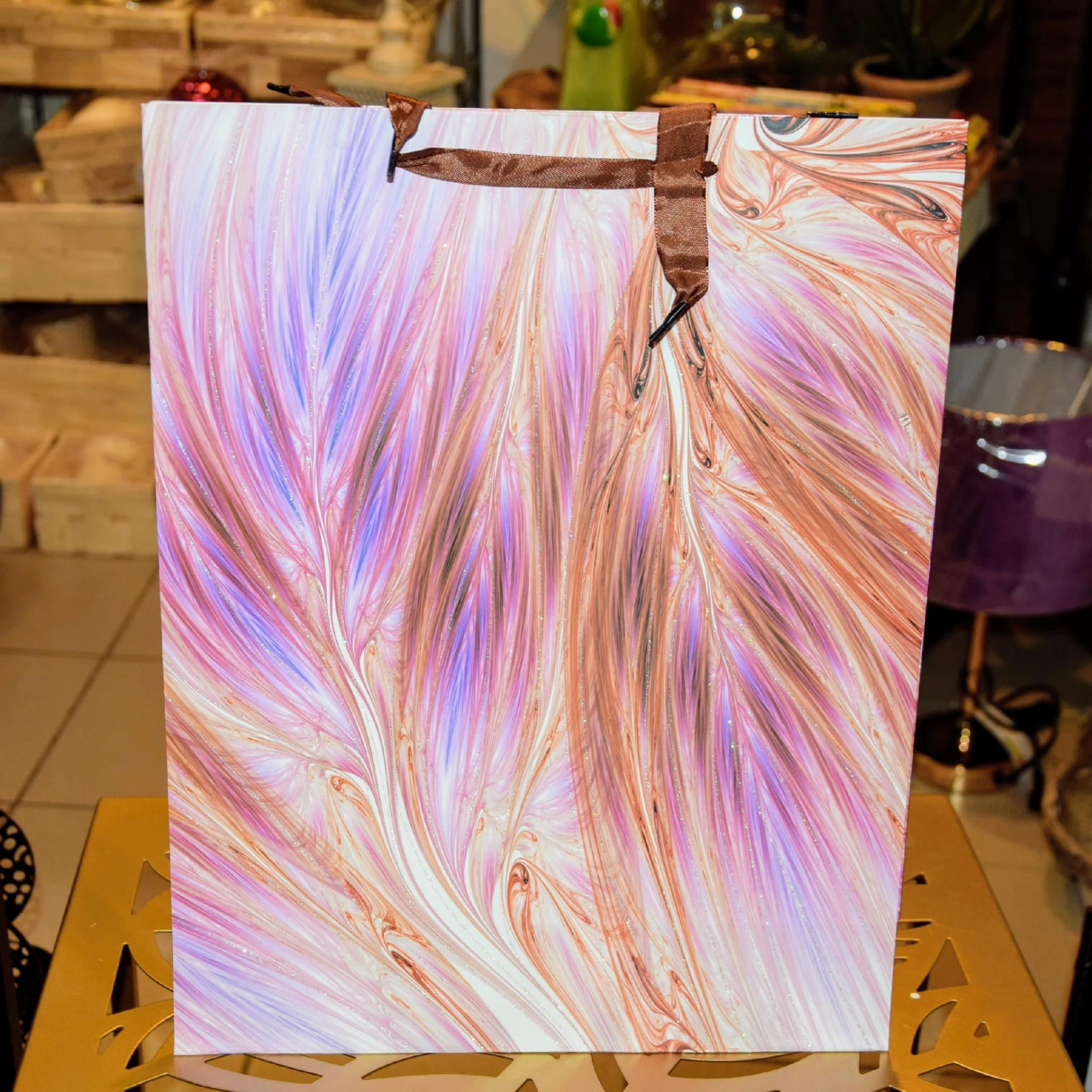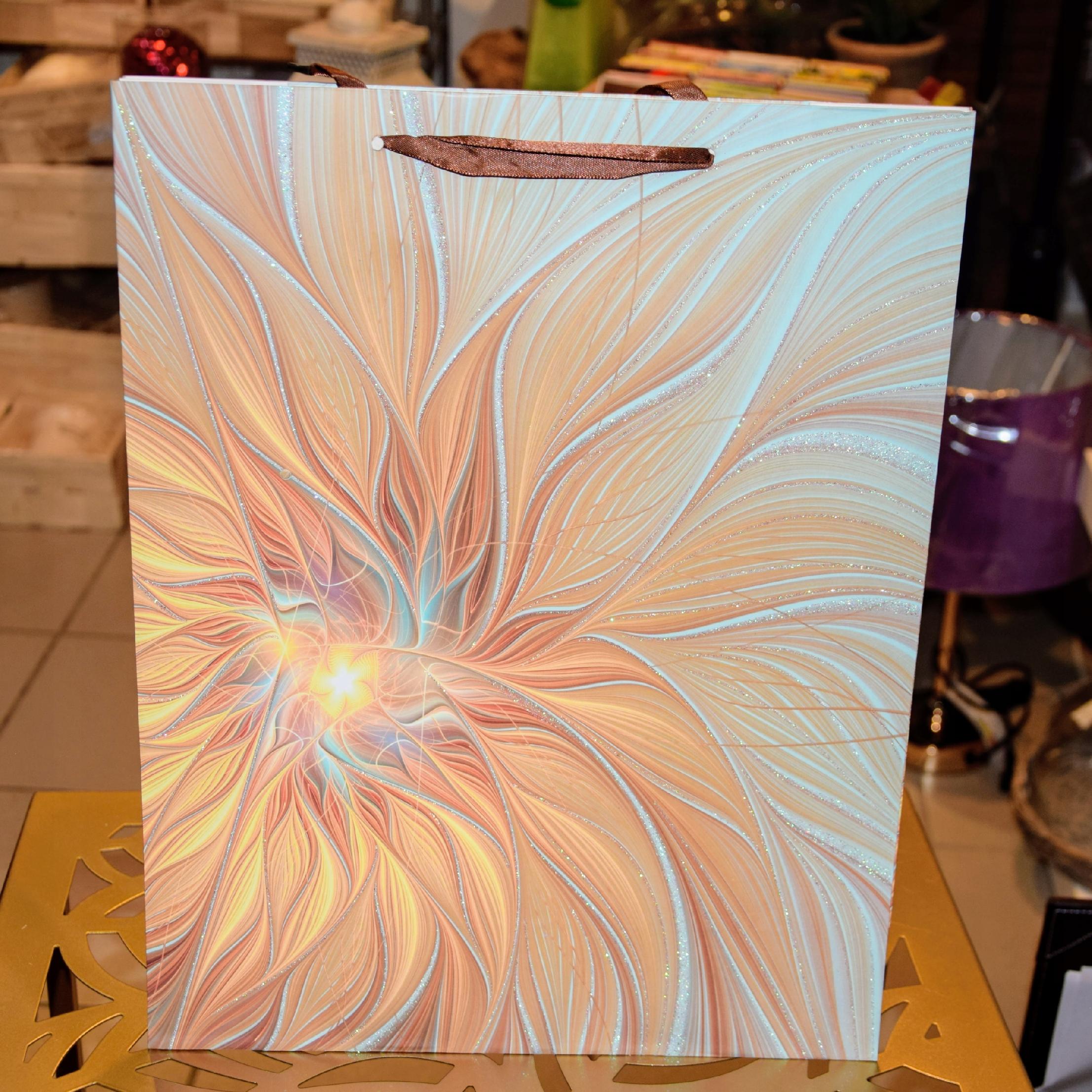 Elegancka torebka prezentowa zdobiona wyszukanymi, stonowanymi, abstrakcyjnymi i bardzo ciekawymi wzorami kolorystycznymi. Torebka dodatkowa zdobiona jest brokatem. Wykonana z wysokiej jakości, grubego papieru. Uchwyty wykonane są z dopasowanej kolorystycznie wstążki.