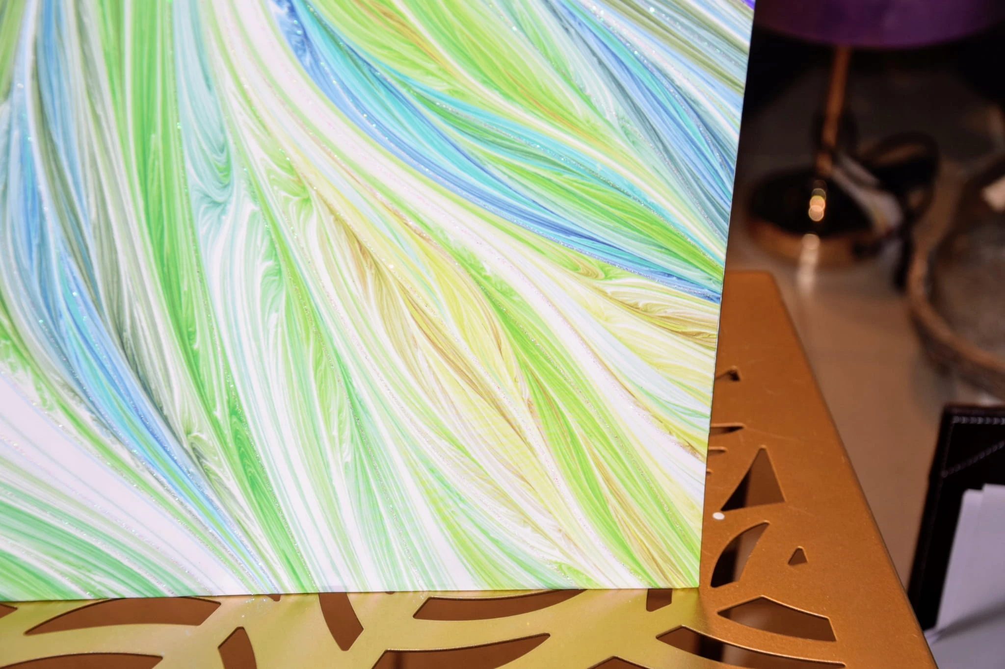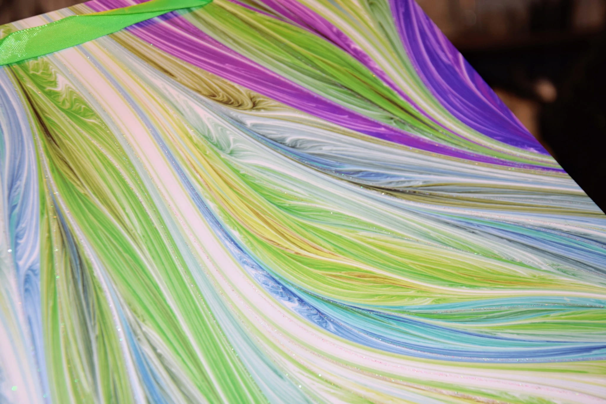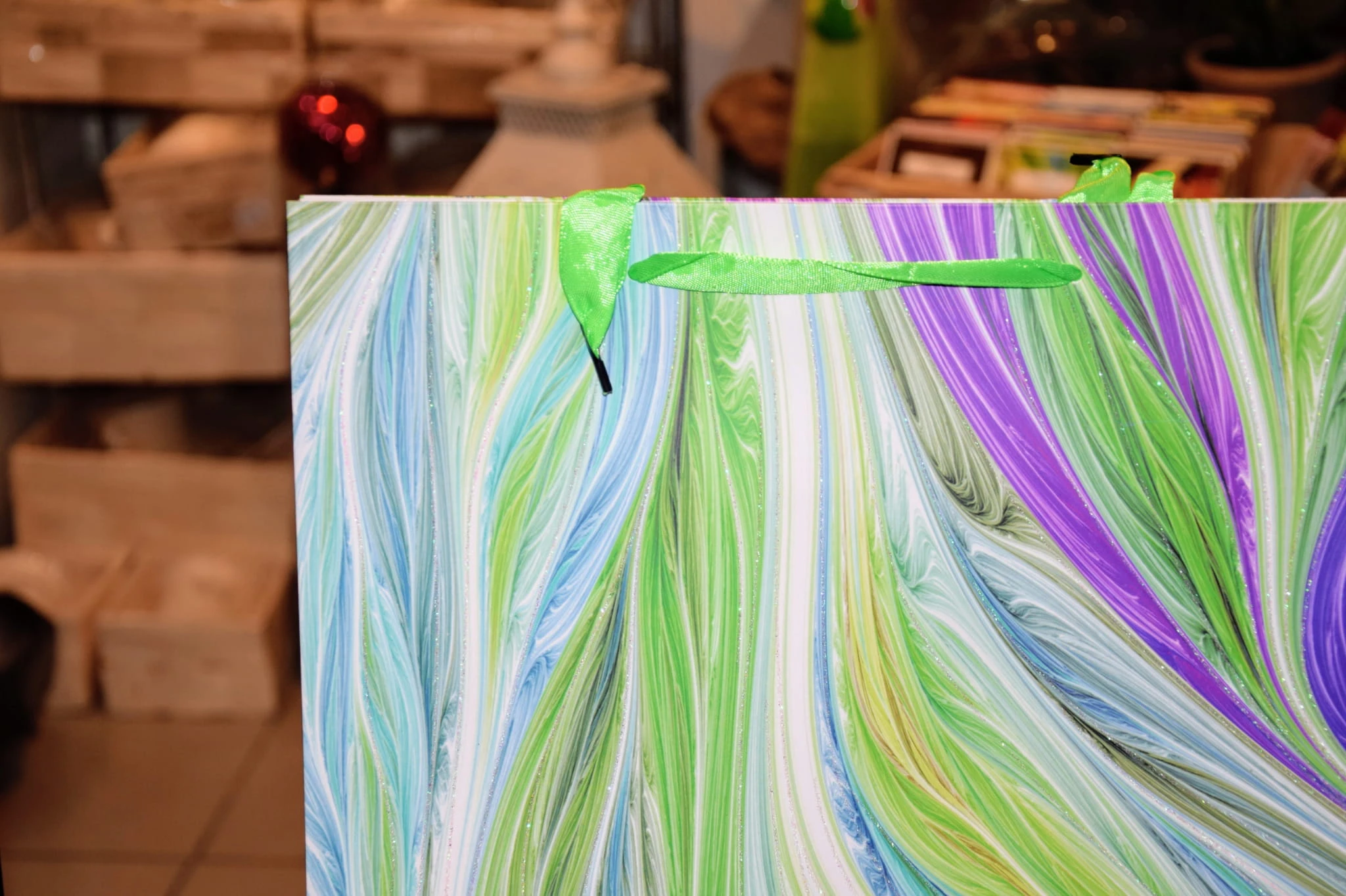 Elegancka torebka prezentowa zdobiona wyszukanymi, stonowanymi, abstrakcyjnymi i bardzo ciekawymi wzorami kolorystycznymi. Torebka dodatkowa zdobiona jest brokatem. Wykonana z wysokiej jakości, grubego papieru. Uchwyty wykonane są z dopasowanej kolorystycznie wstążki.