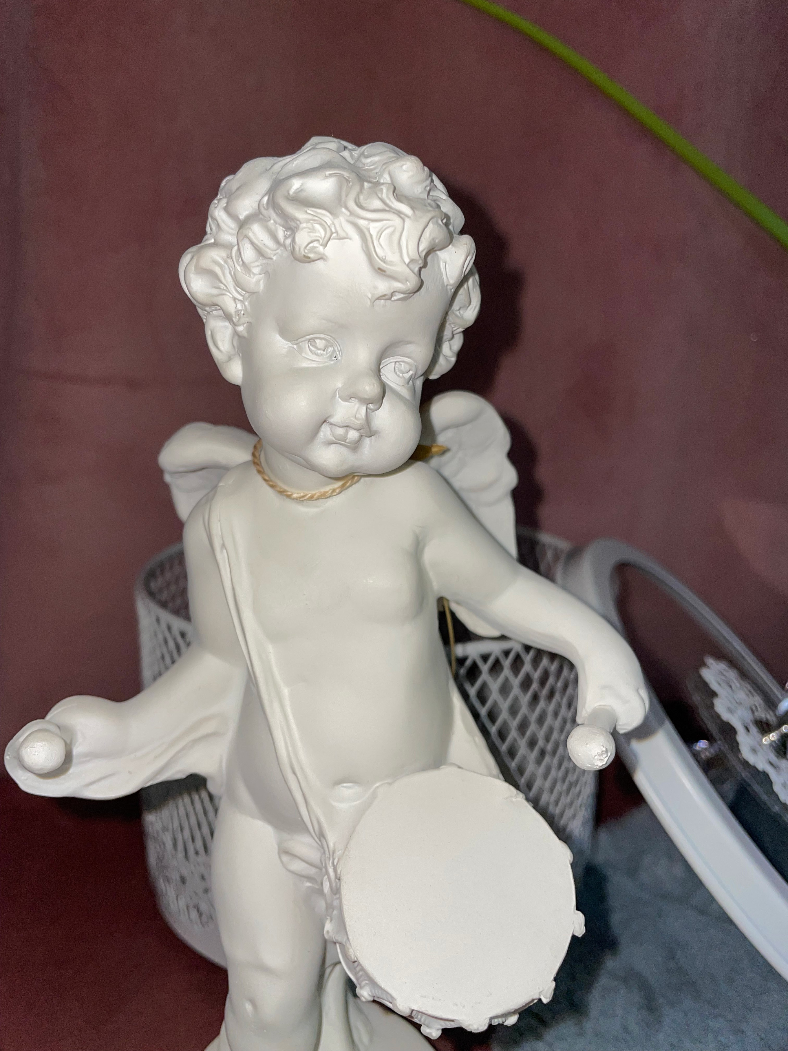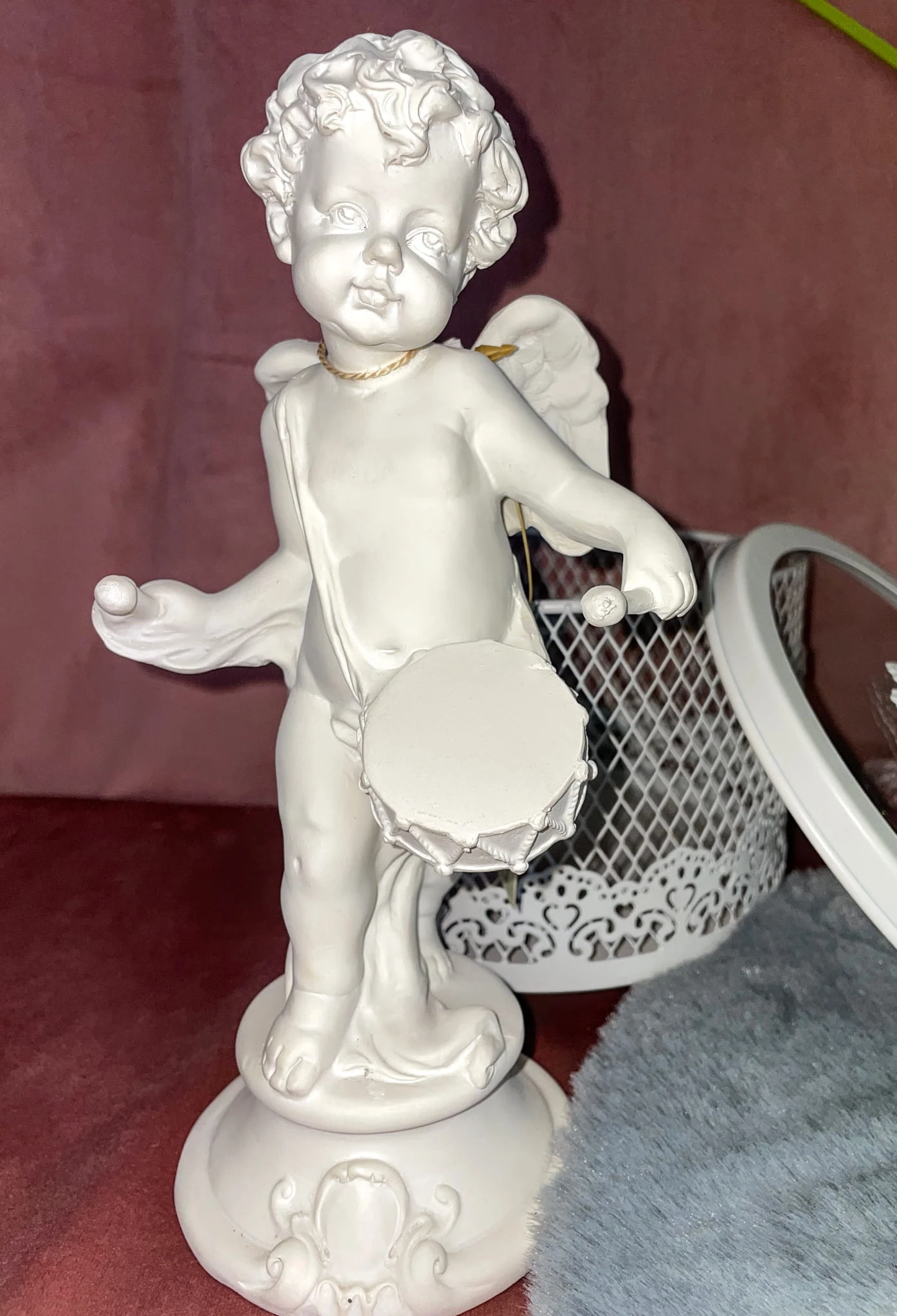 Piękna dekoracja, przedstawiająca anioła grającego na bębnie. Idealnie nadaje się na dekorację wnętrza lub prezent.
