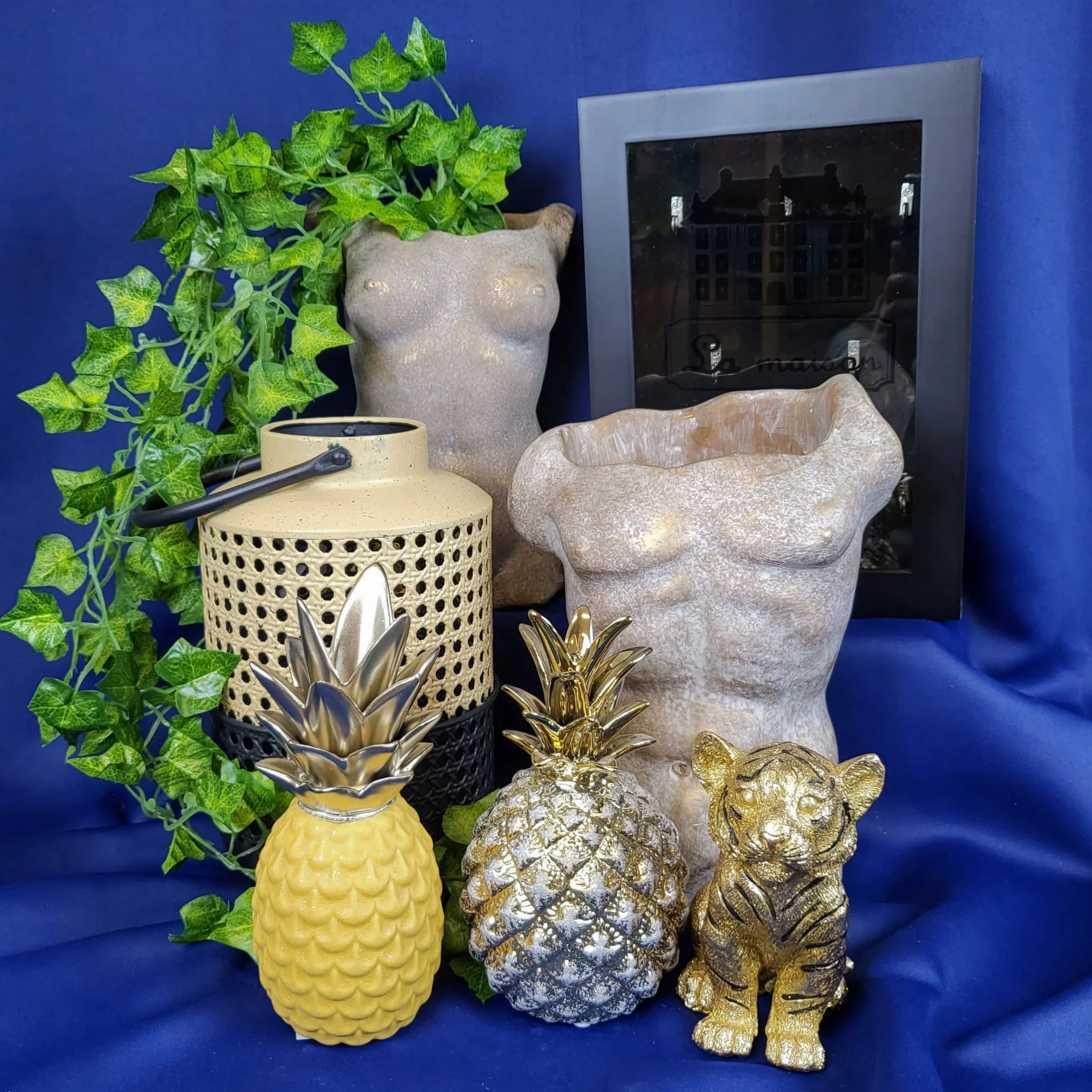 Figurka ananas w kolorze złota. Jeden z najmodniejszych dodatków w tym sezonie. Idealnie wkomponuje się we wnętrza boho, eklektyczne czy nawet te glamour.