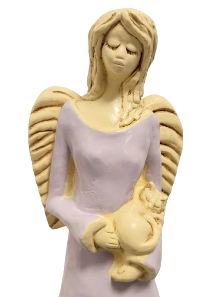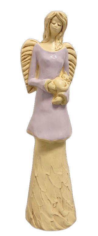 FIGURKA ANIOŁ STOJĄCY Z KOTEM FIOLETOWY 37CM HAND MADE