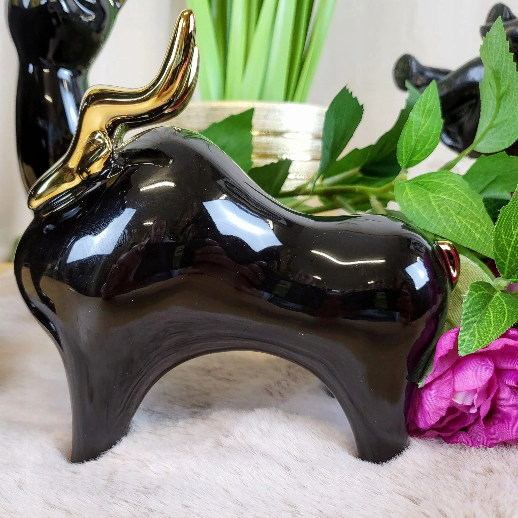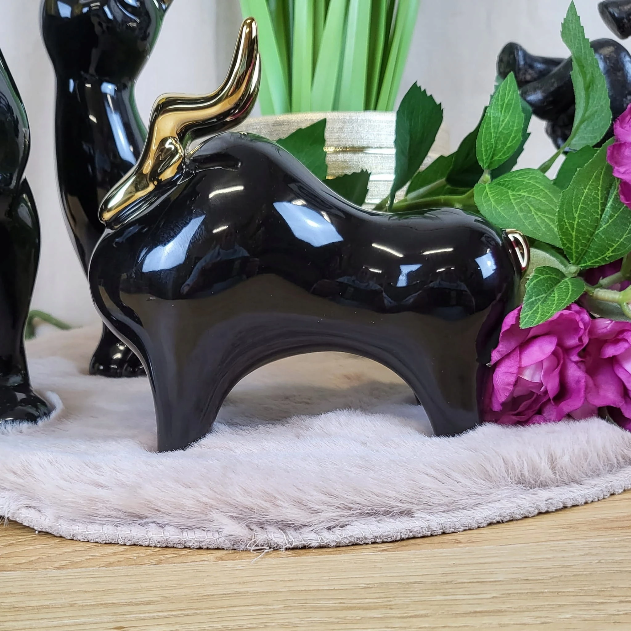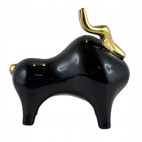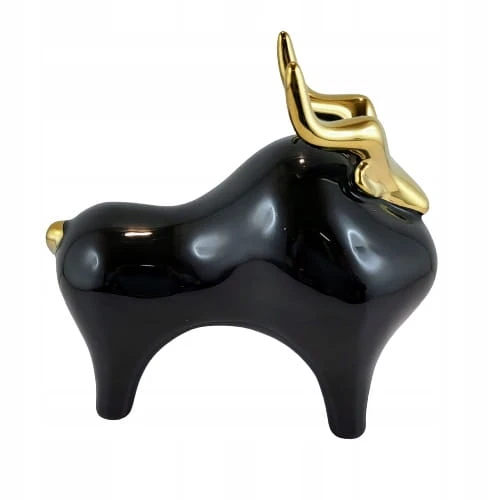 Figurka byka wykonana z ceramiki w kolorze czarnym i złotym.