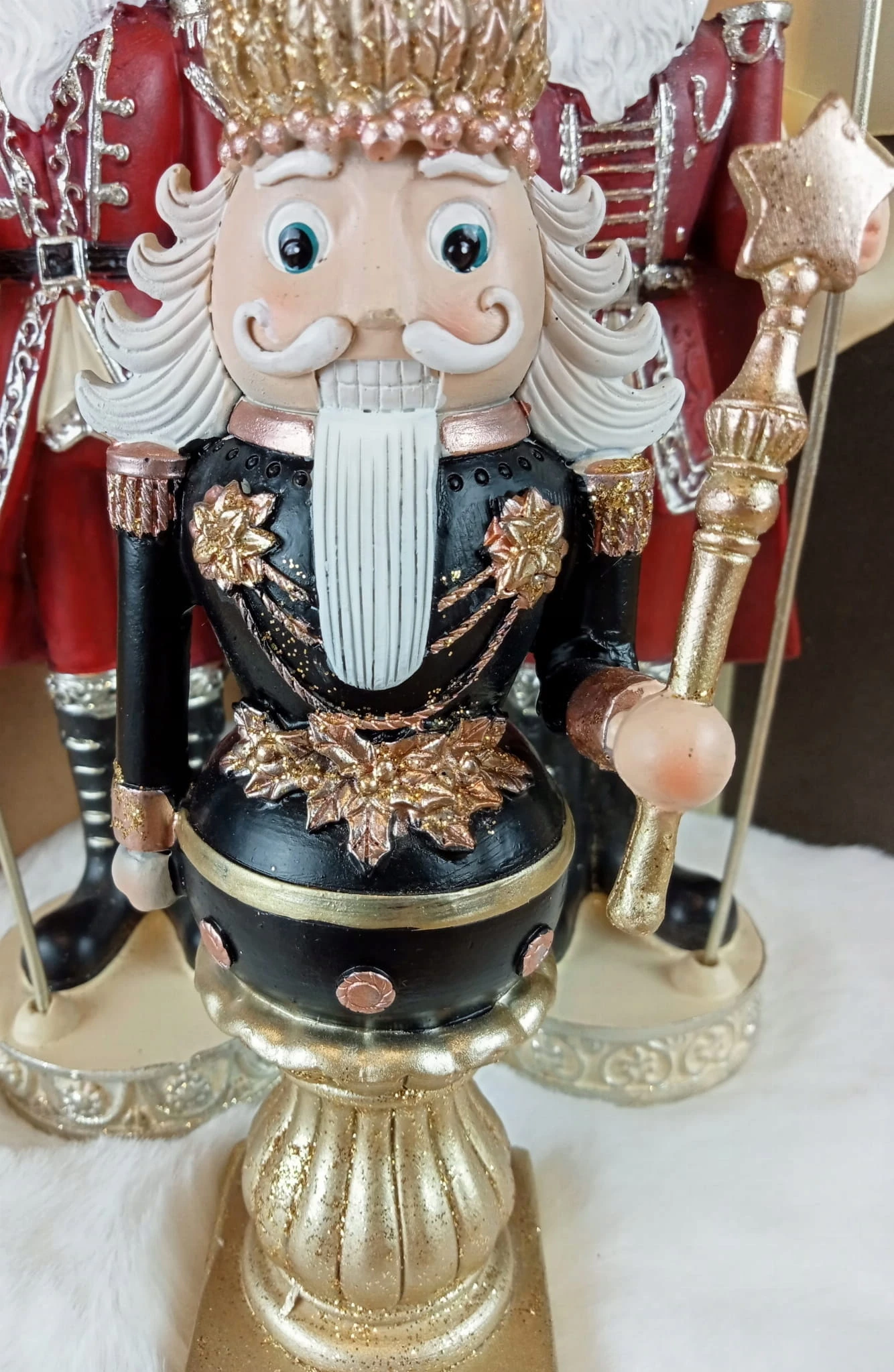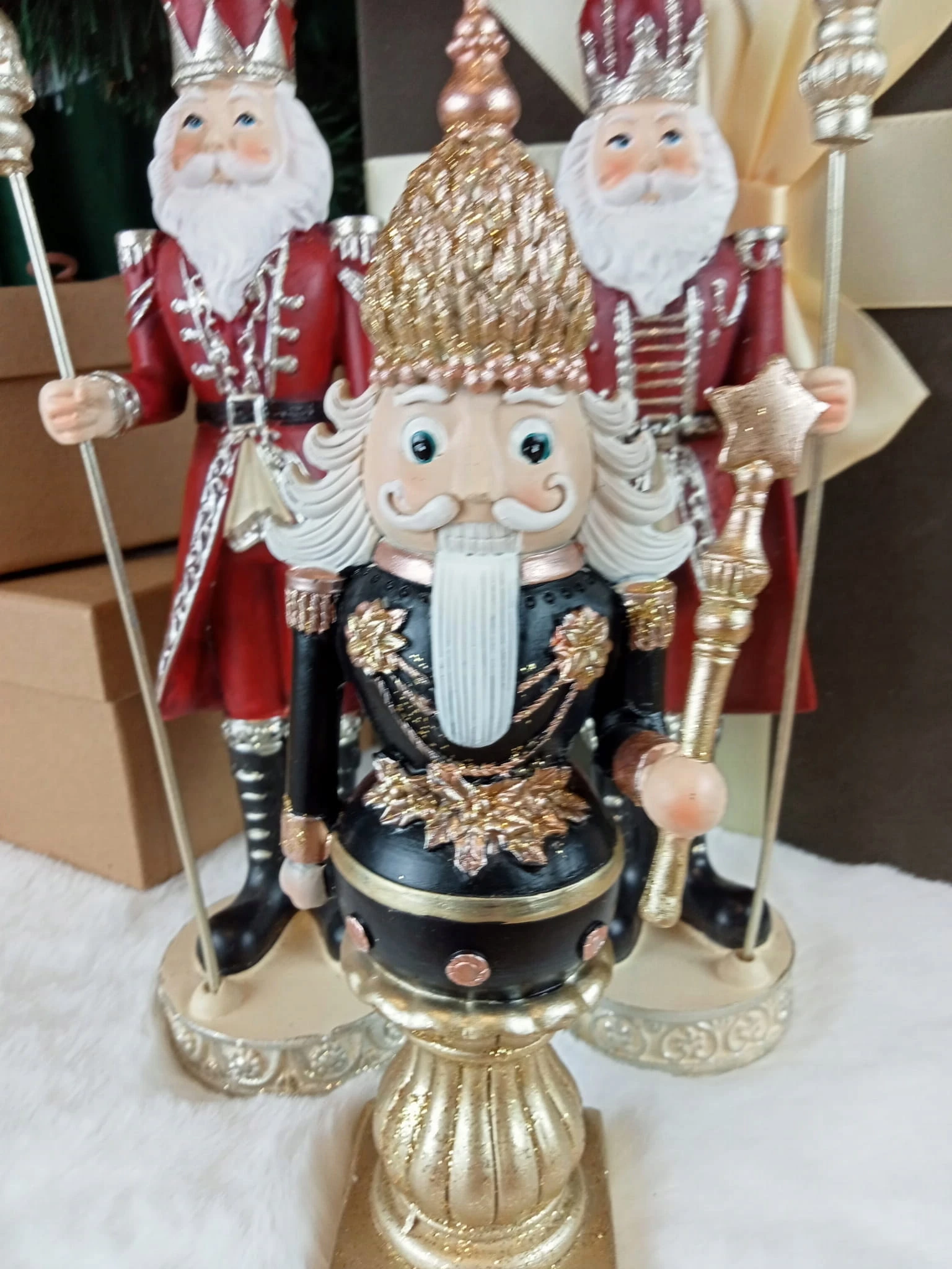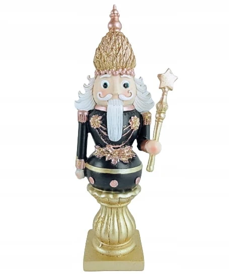 Dziadek do orzechów na kwadratowym podeście z halabardą w stylu bajkowym, w kolorze czerni i złota. Figurka dziadka do orzechów, będzie doskonałym pomysłem na prezent, ustawiona na konsoli lub pod choinką nada wnętrzu bajkowego świątecznego klimatu. Dziadek do orzechów to symbol bożonarodzeniowych cudownych przemian i nieskończonej odnowy życia.