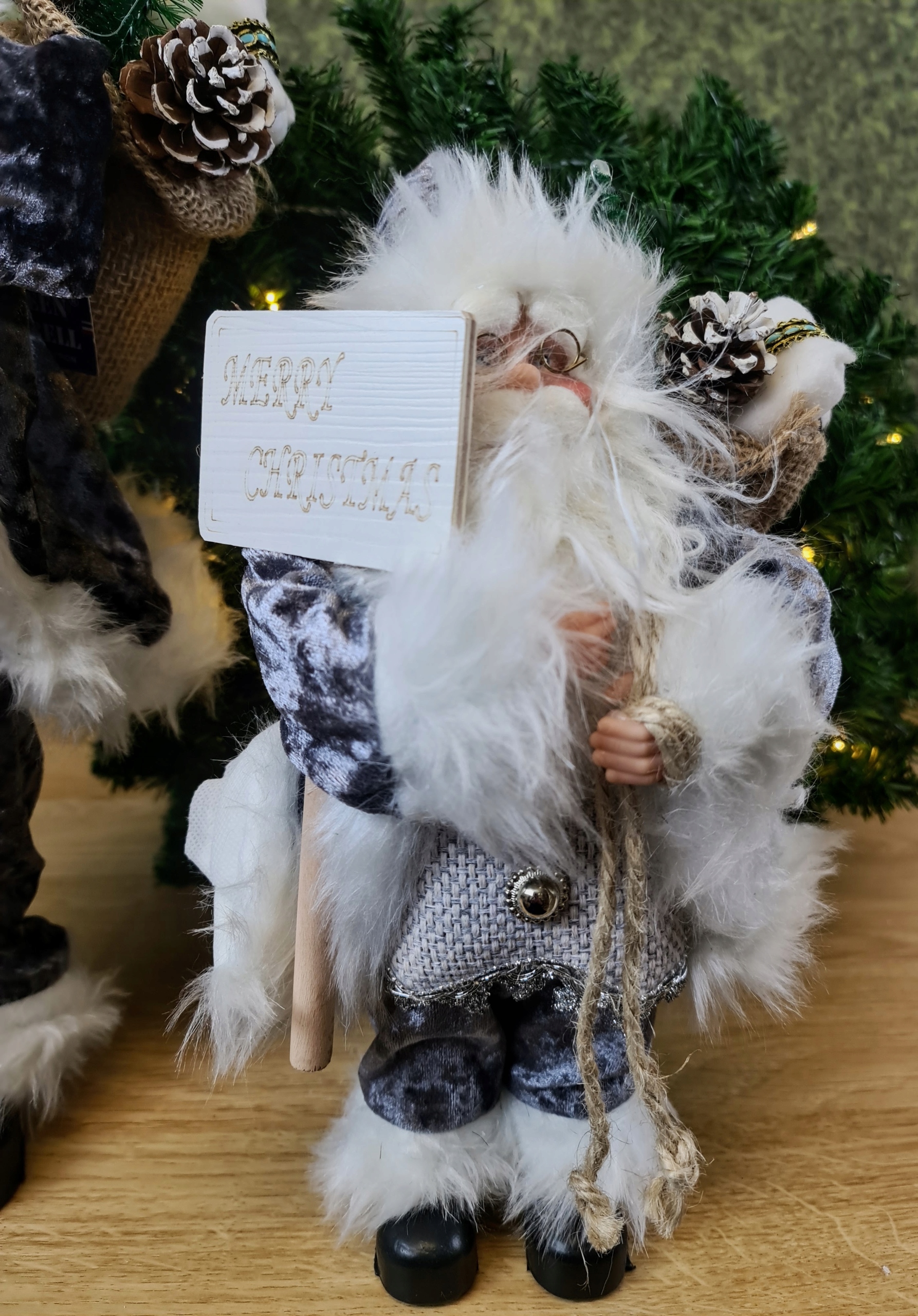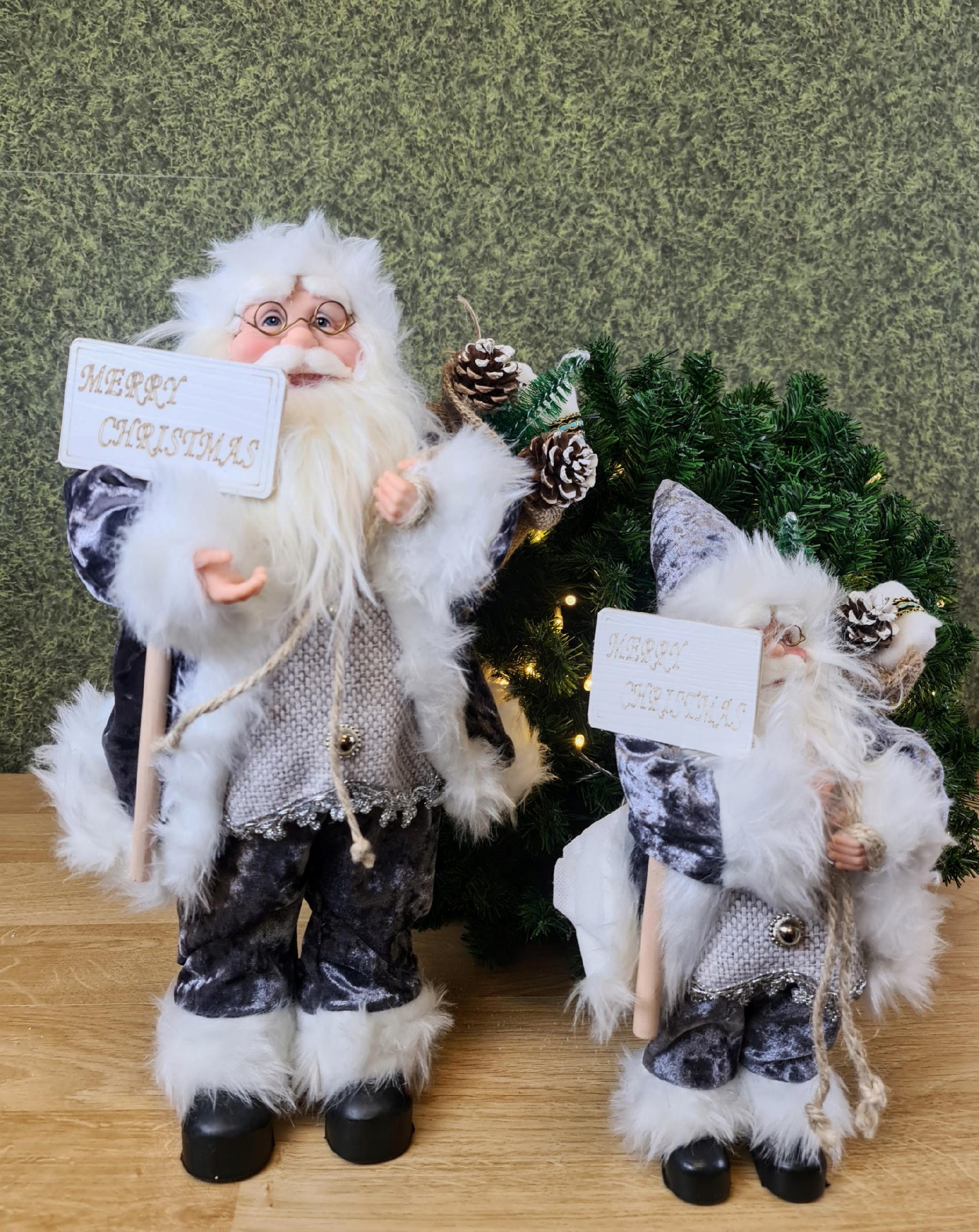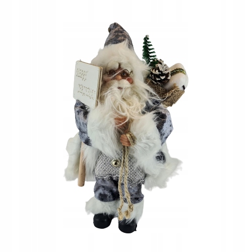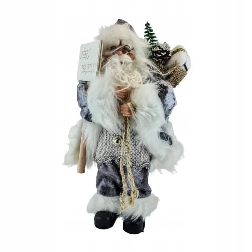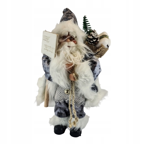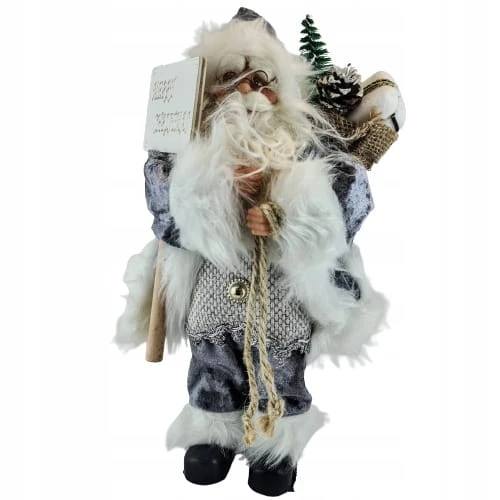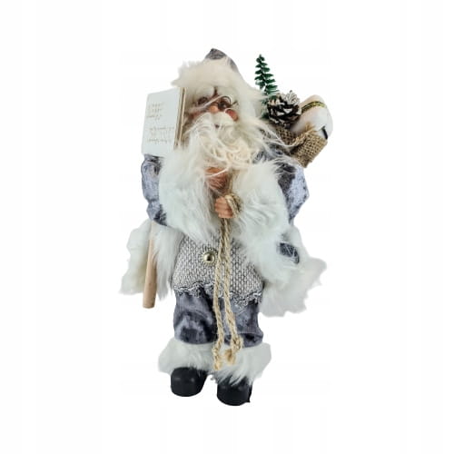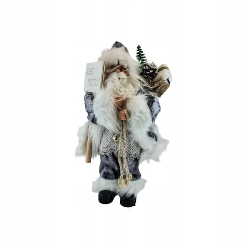 Mikołaj w szarym stroju. Niesie on worek z prezentami na plecach, prawdopodobnie dla Ciebie :D. Świąteczna dekoracja, wkomponuje się w każde wnętrze.