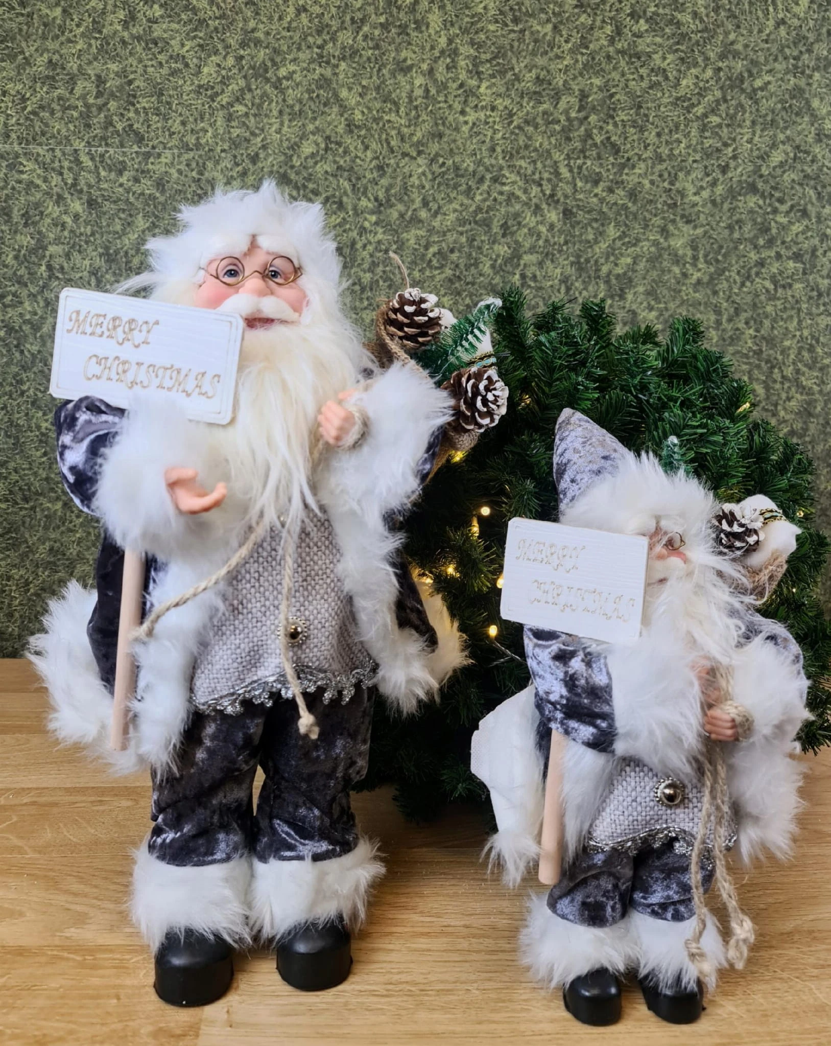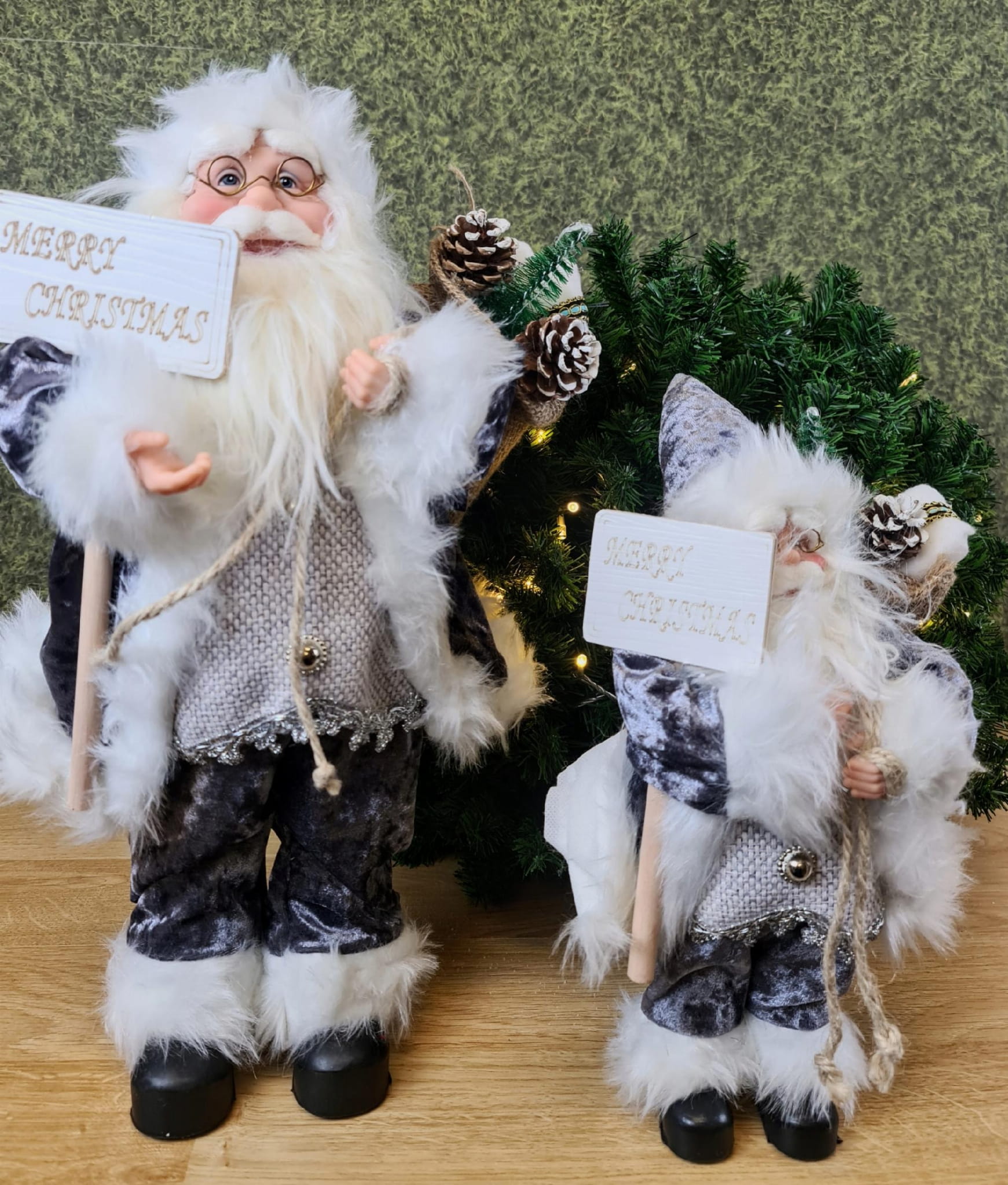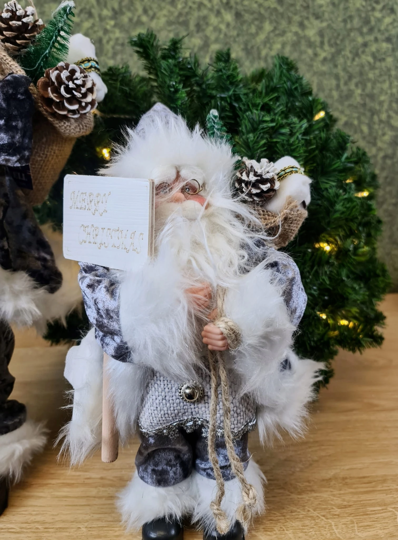 Mikołaj w szarym stroju. Niesie on worek z prezentami na plecach, prawdopodobnie dla Ciebie :D. Świąteczna dekoracja, wkomponuje się w każde wnętrze.