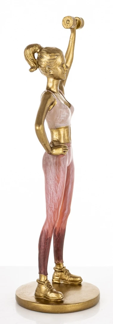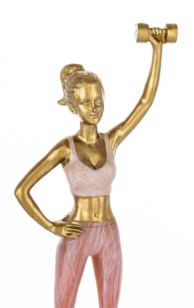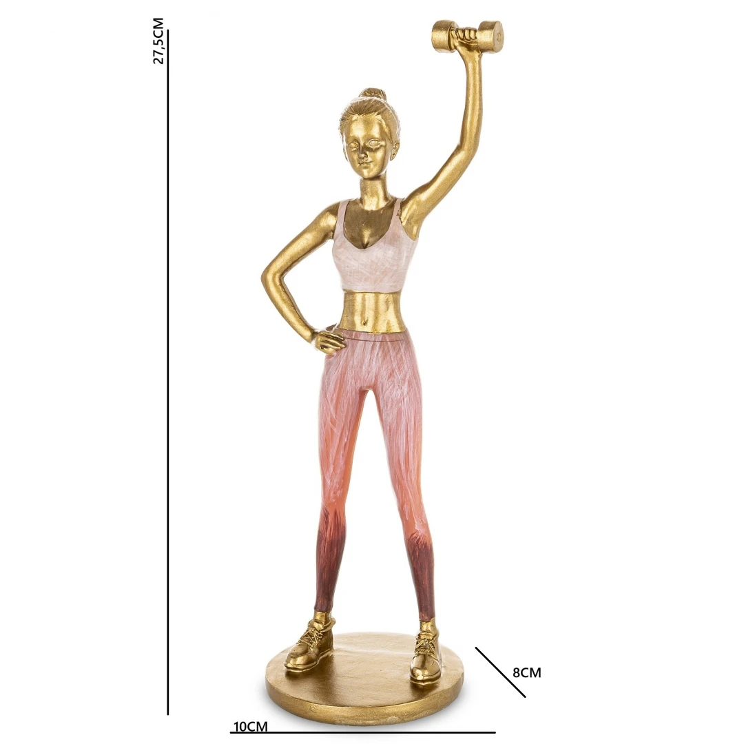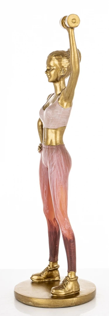 Figurka została wykonana z dbałością o najmniejsze szczegóły. Złote wykończenie ciała oraz hantla nadaje jej szlachetnego charakteru, który doskonale współgra z delikatnymi, różowymi akcentami stroju sportowego. Dzięki smukłej sylwetce i wysokości aż 27,5 cm, ozdoba ta stanowi wyraźny punkt dekoracyjny na każdej komodzie, biurku czy regale, dodając pomieszczeniu prestiżu.