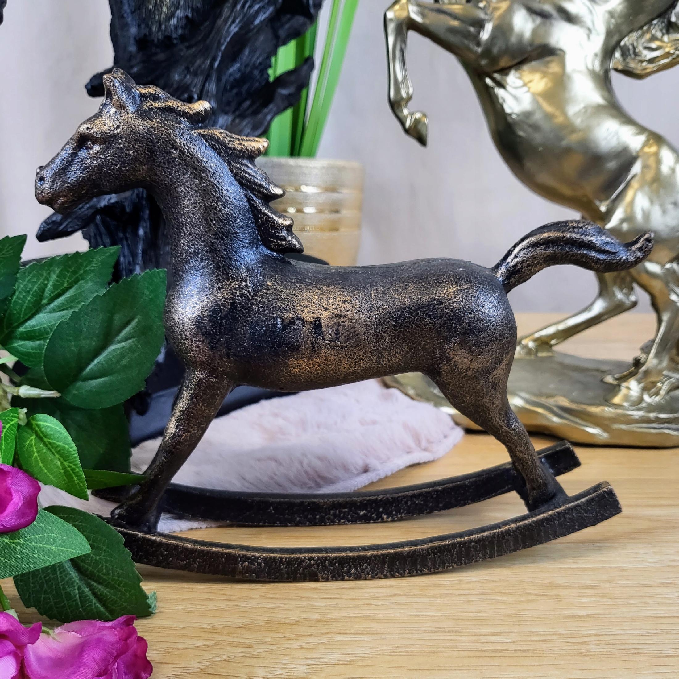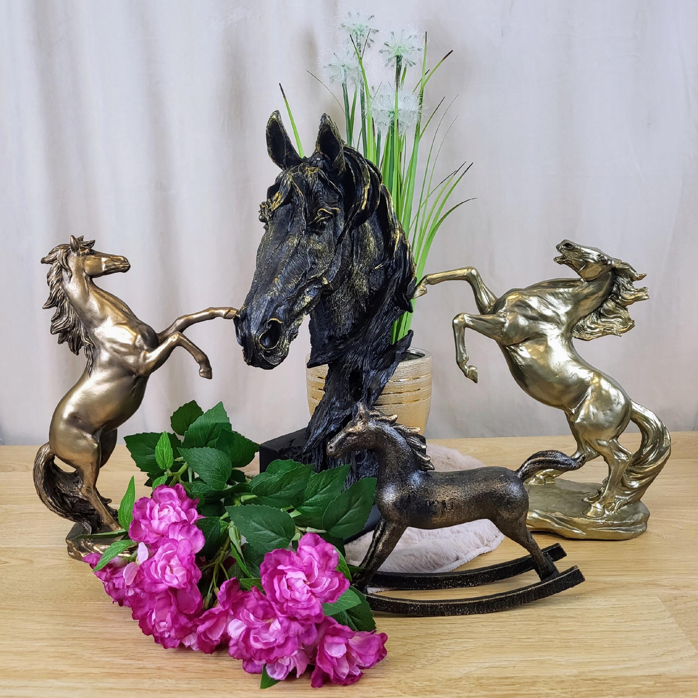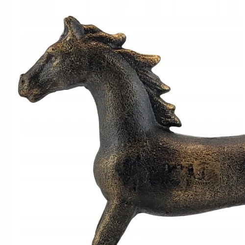 Elegancka figurka konia na biegunach. Figurka wygląda jak postarzana rzeźba odlana z brązu.