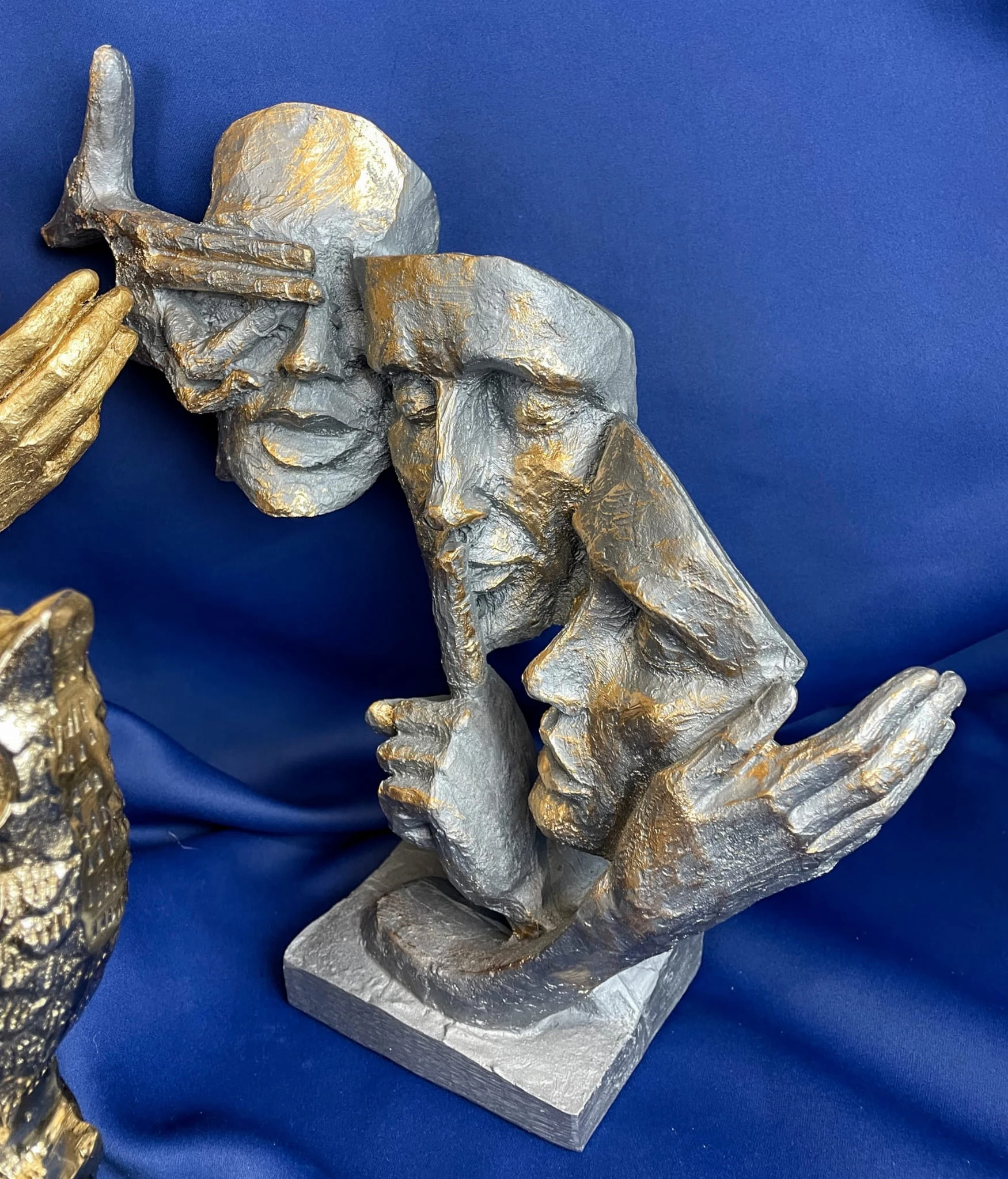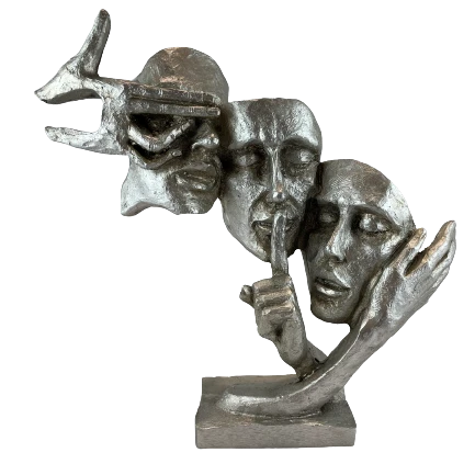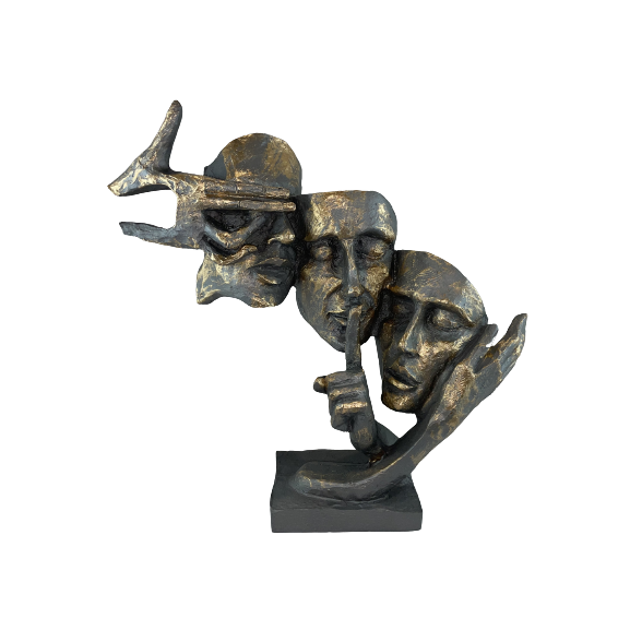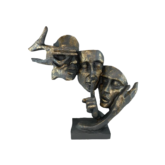 Figurki na masywnej podstawie przedstawiające dłonie z maskami. Postarzana rzeźba z efektem patyny, miękko odbija światło.