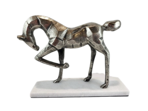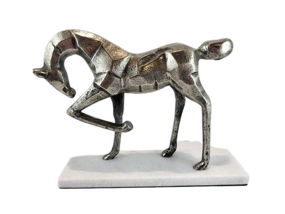 Elegancka figurka konia wykonana z metalu na kamiennej podstawie. .