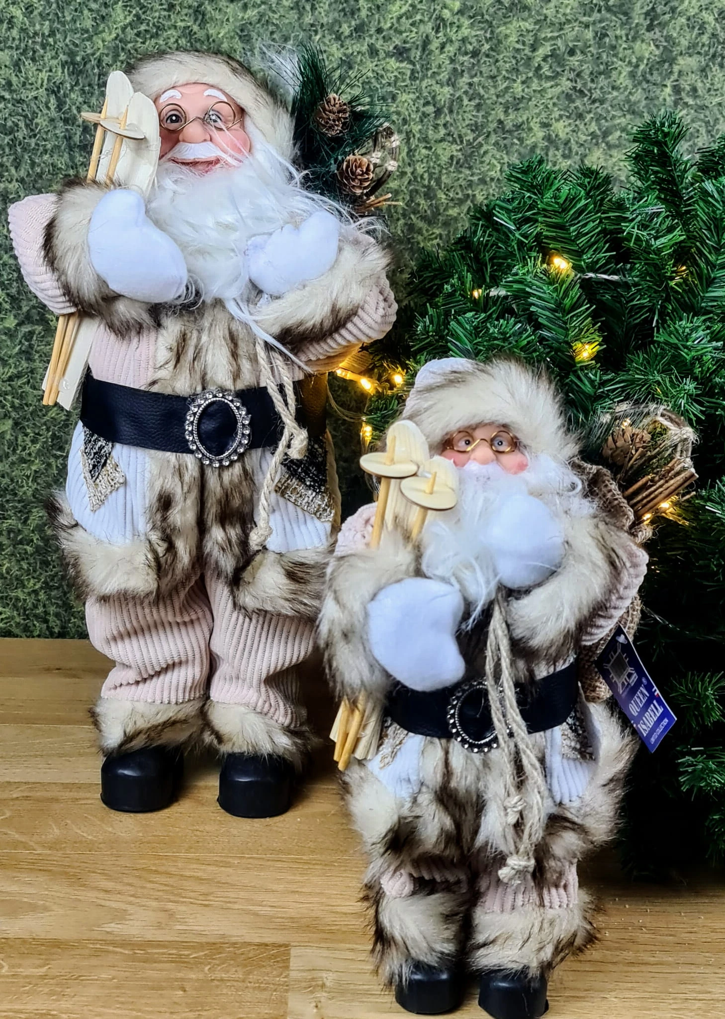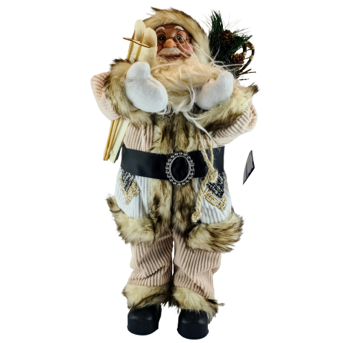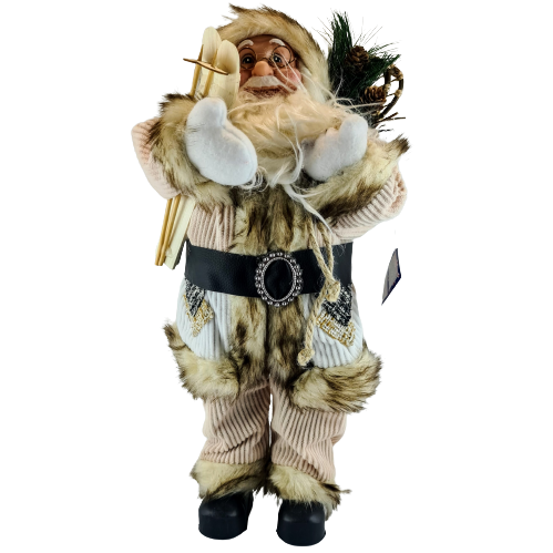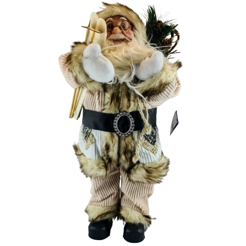 Mikołaj w kremowo-białym stroju. Niesie on worek z prezentami na plecach, a w ręce trzyma narty. Świąteczna dekoracja, wkomponuje się w każde wnętrze i nada klimatu.