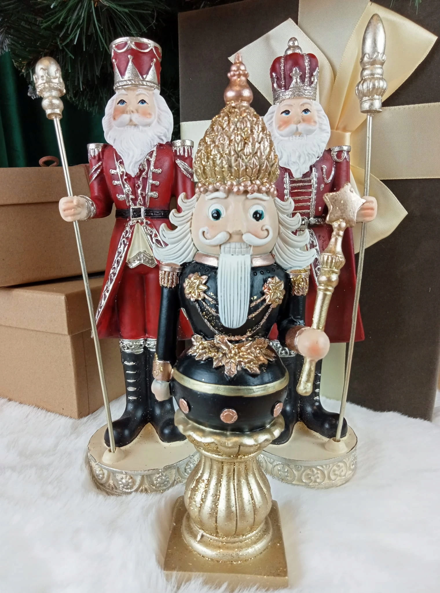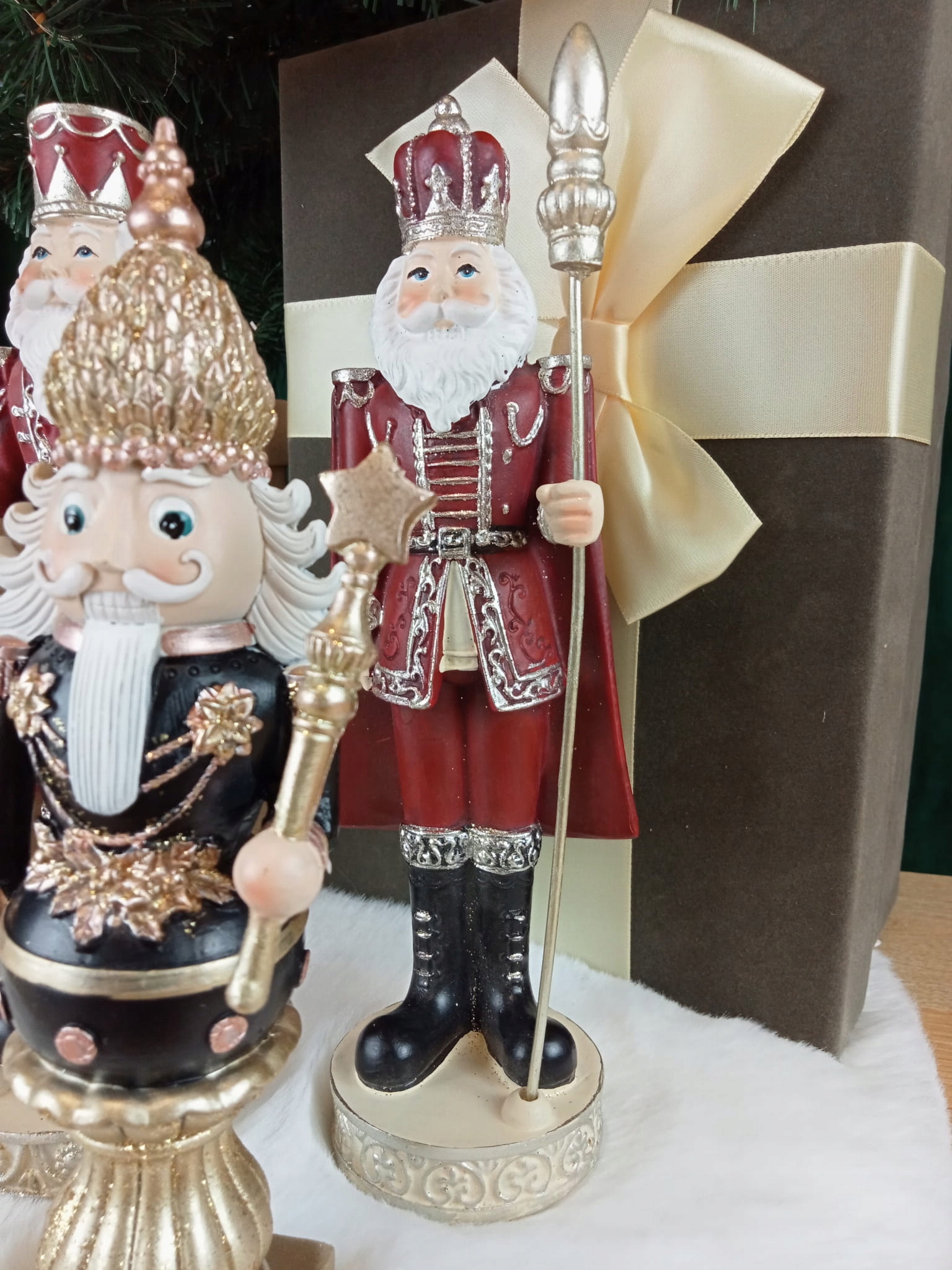 Mikołaj na okrągłym podeście z pastorałem w stylu bajkowym, w kolorze czerwieni, czerni i złota. Figurka mikołaja, będzie doskonałym pomysłem na prezent, ustawiona na konsoli lub pod choinką nada wnętrzu bajkowego świątecznego klimatu.