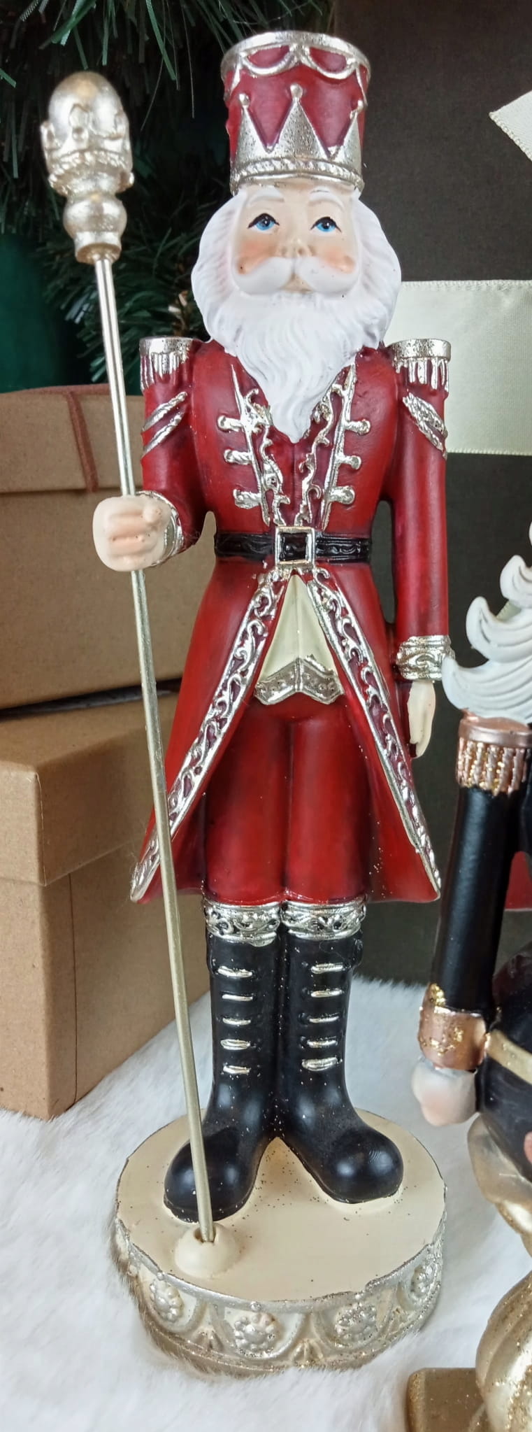 Mikołaj na okrągłym podeście z pastorałem w stylu bajkowym, w kolorze czerwieni, czerni i złota. Figurka mikołaja, będzie doskonałym pomysłem na prezent, ustawiona na konsoli lub pod choinką nada wnętrzu bajkowego świątecznego klimatu.